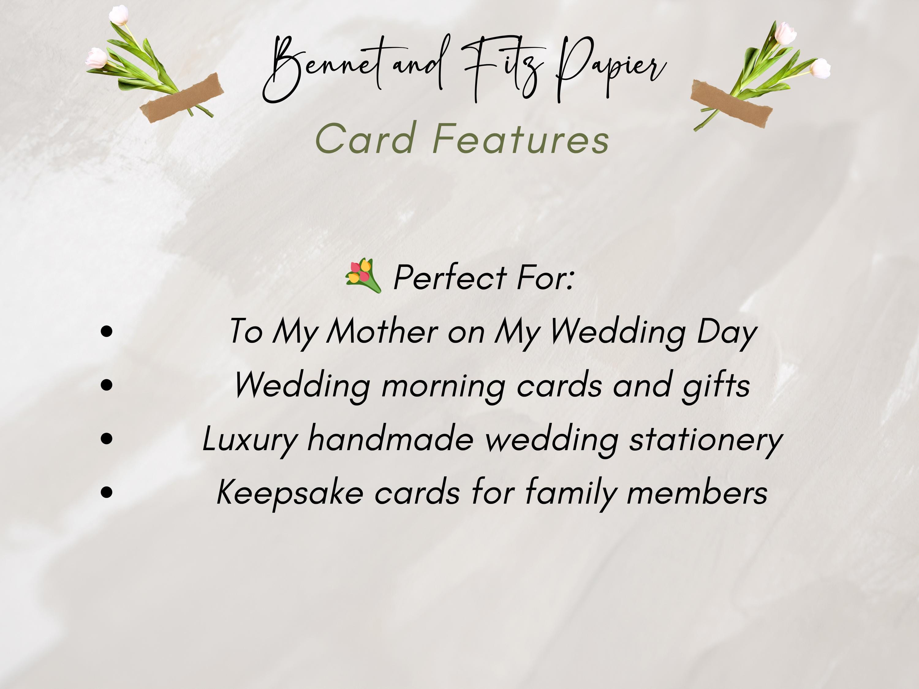 Express your love and gratitude with this handmade luxury “To My Mother on My Wedding Day” card, personalized with your message and finished with timeless elegance — a keepsake she’ll treasure forever.