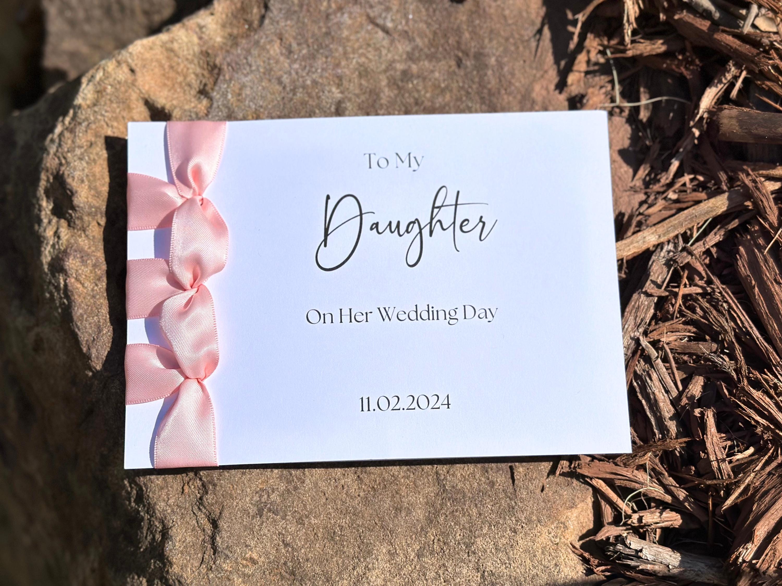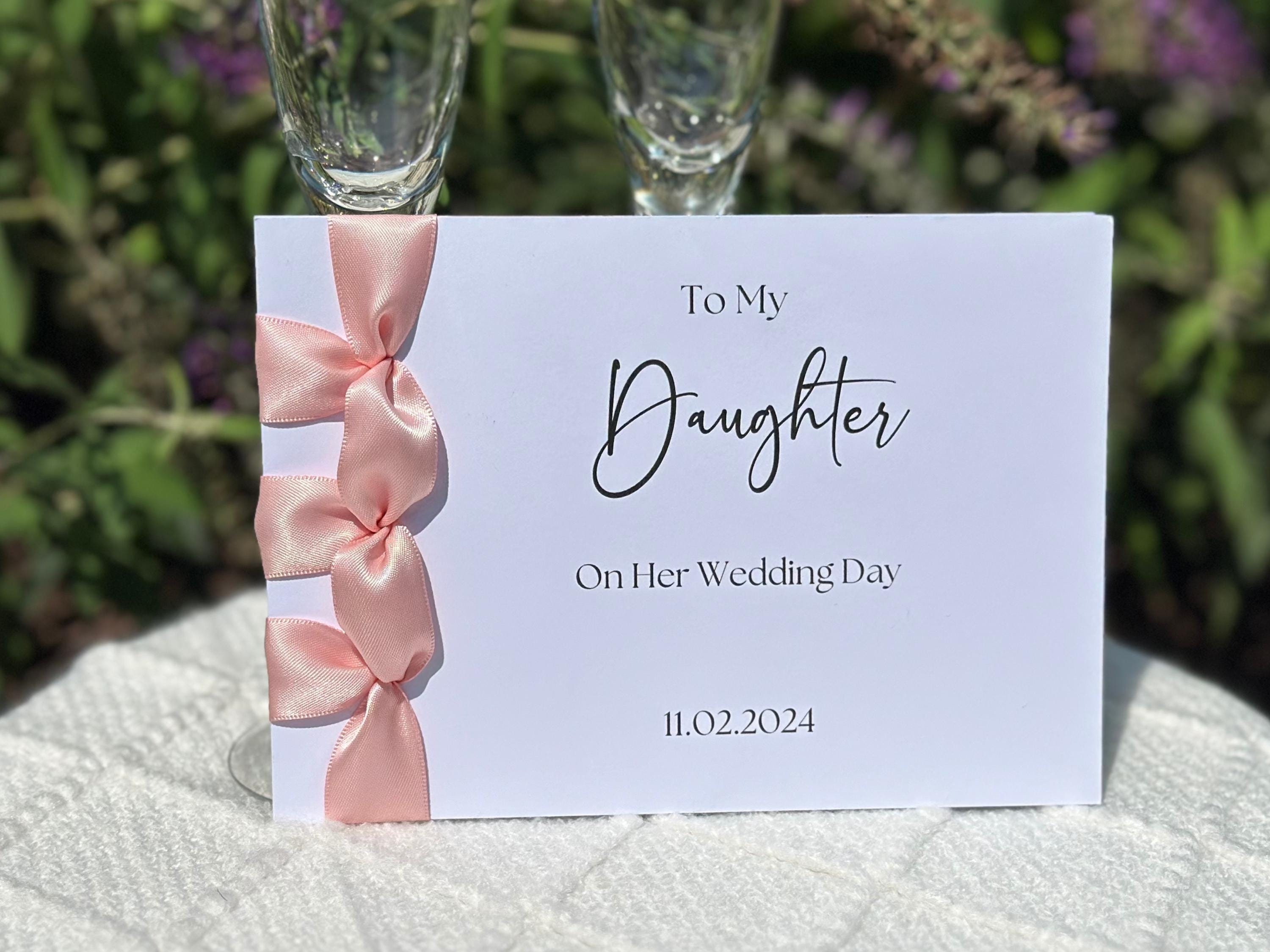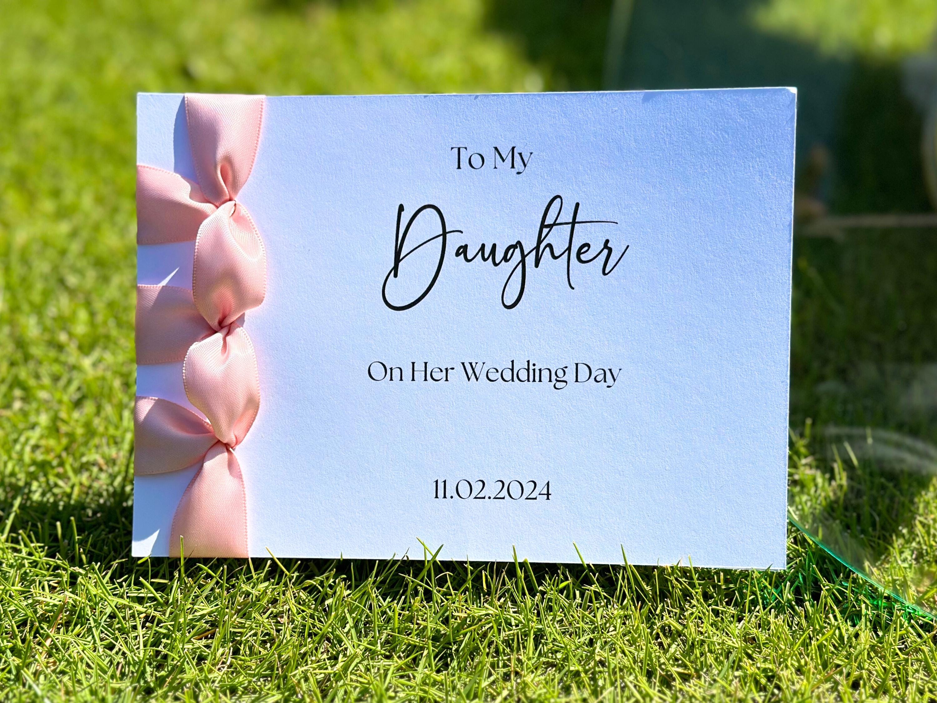 Celebrate a once-in-a-lifetime moment with this handmade luxury “To My Daughter on Her Wedding Day” card, finished with an elegant satin ribbon — a heartfelt keepsake she’ll treasure forever.