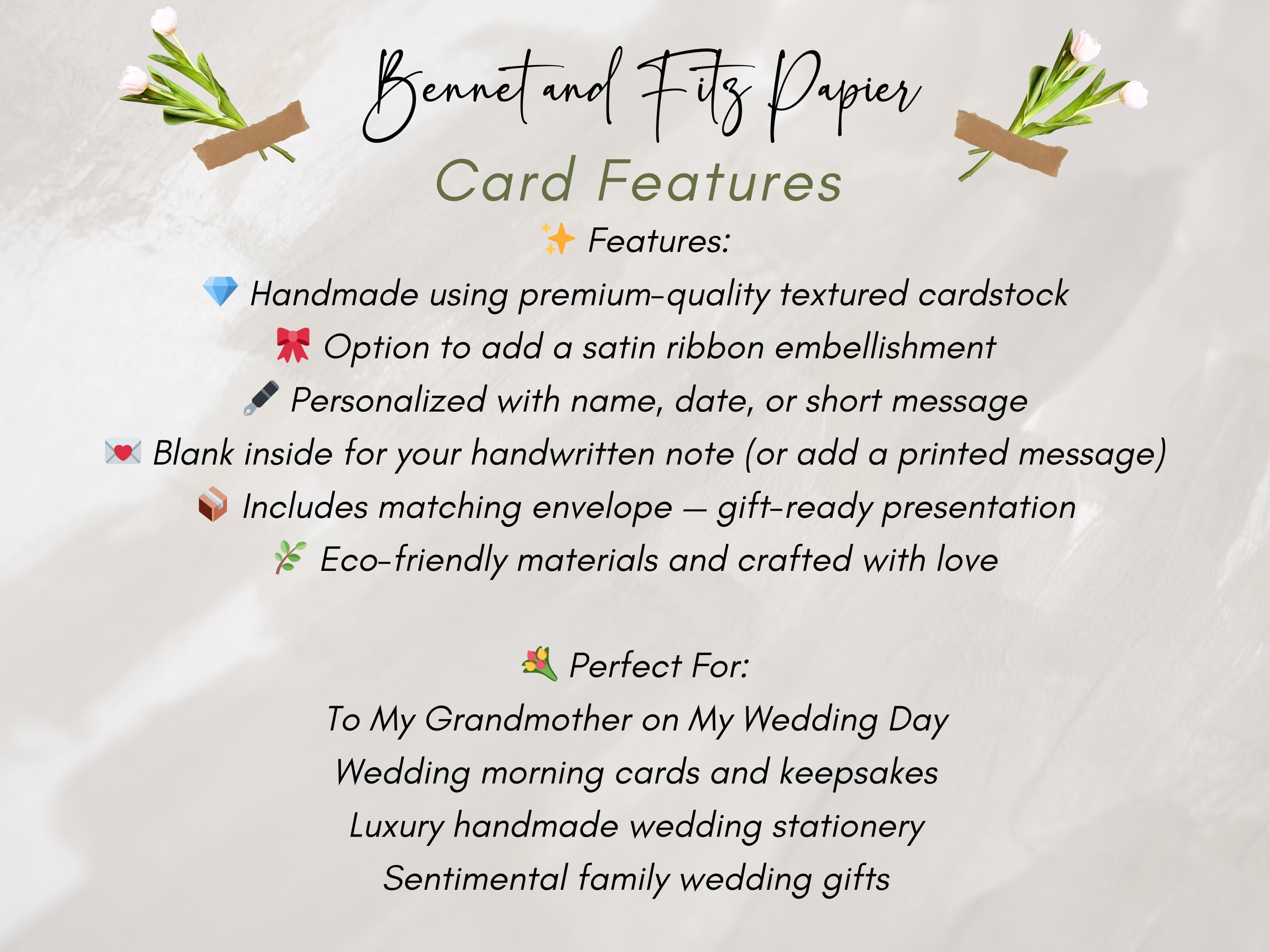 Honor your grandmother with this handmade personalized “To My Grandmother on My Wedding Day” card, beautifully crafted to share love, gratitude, and timeless elegance on your special day.