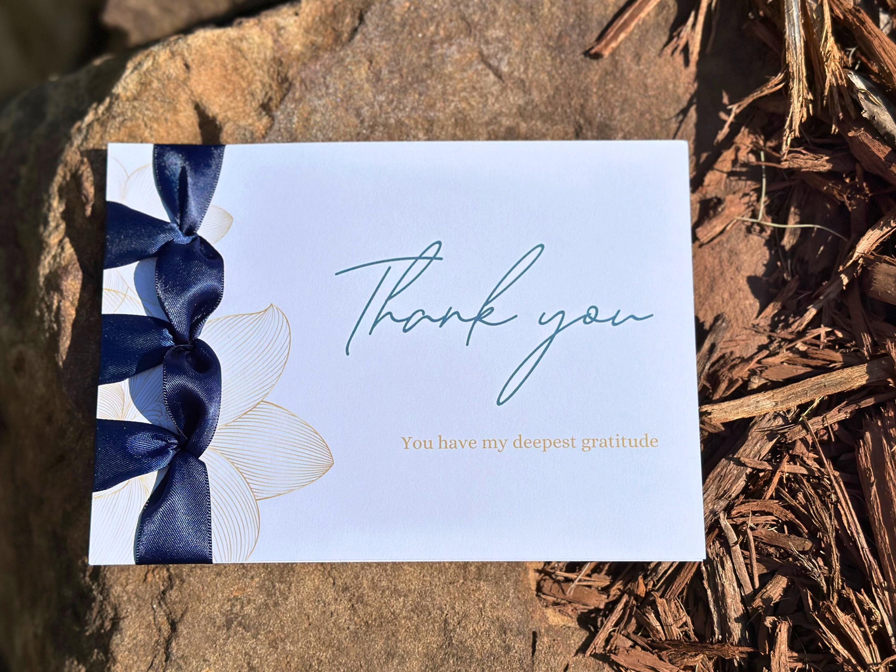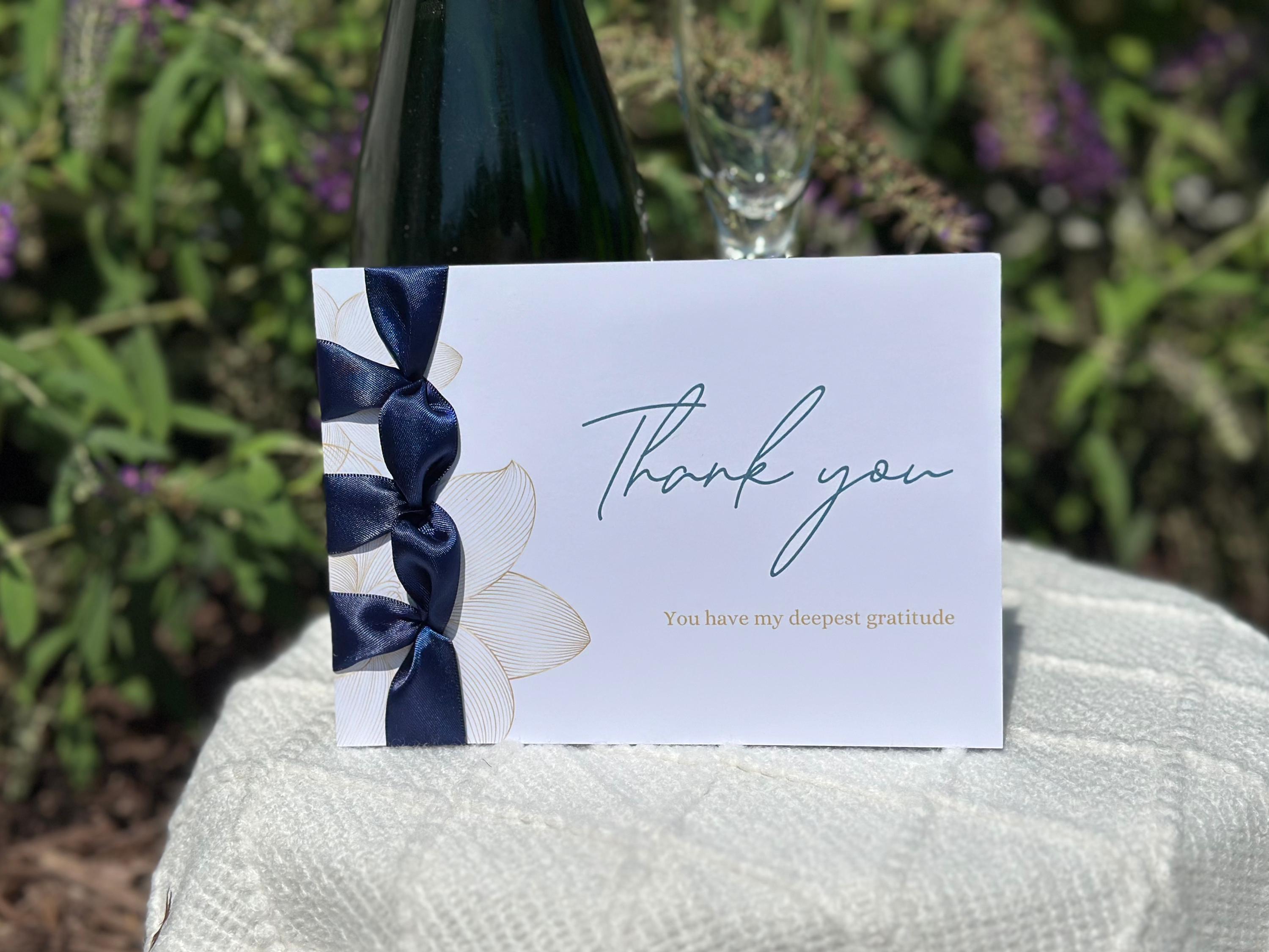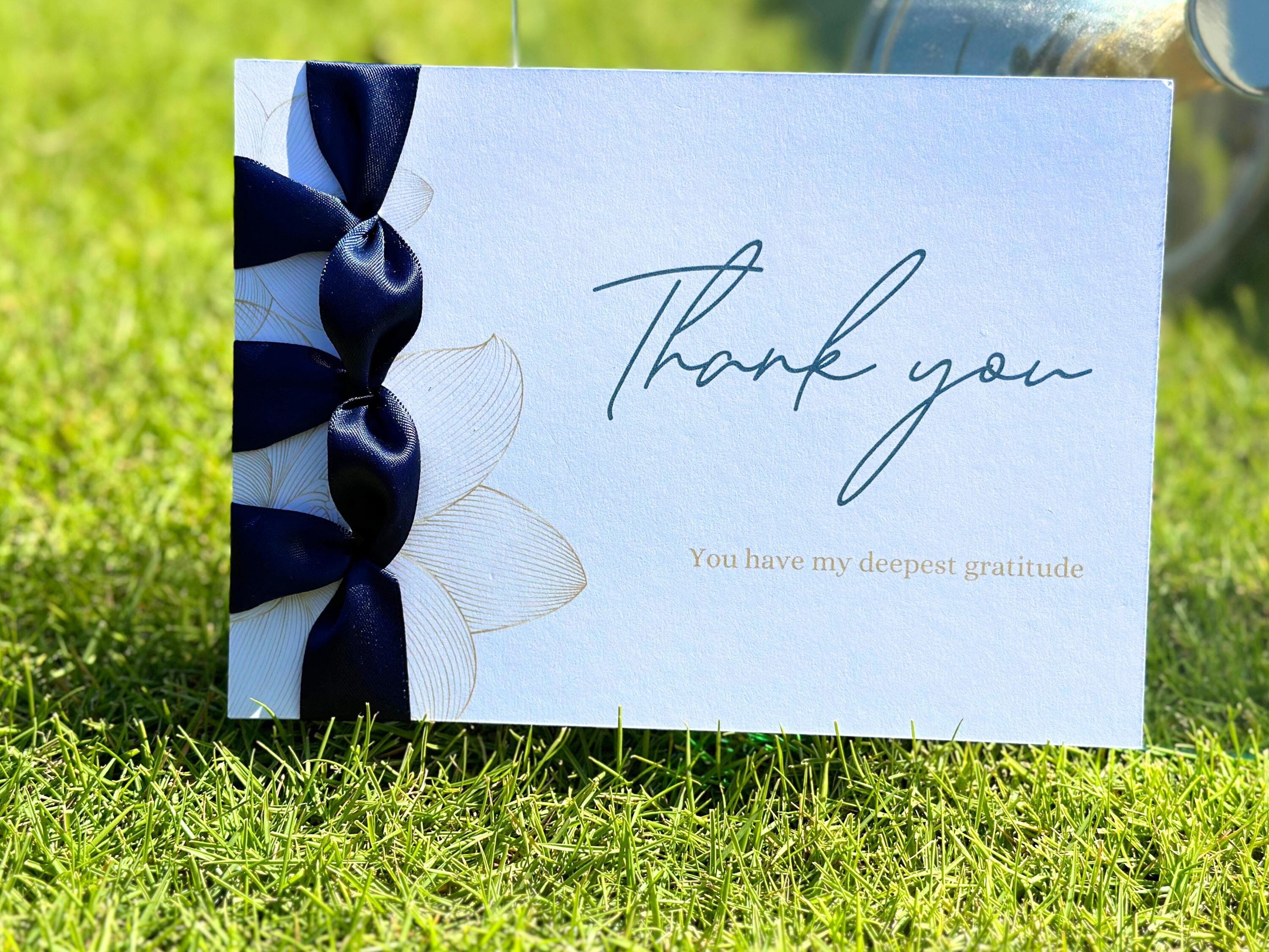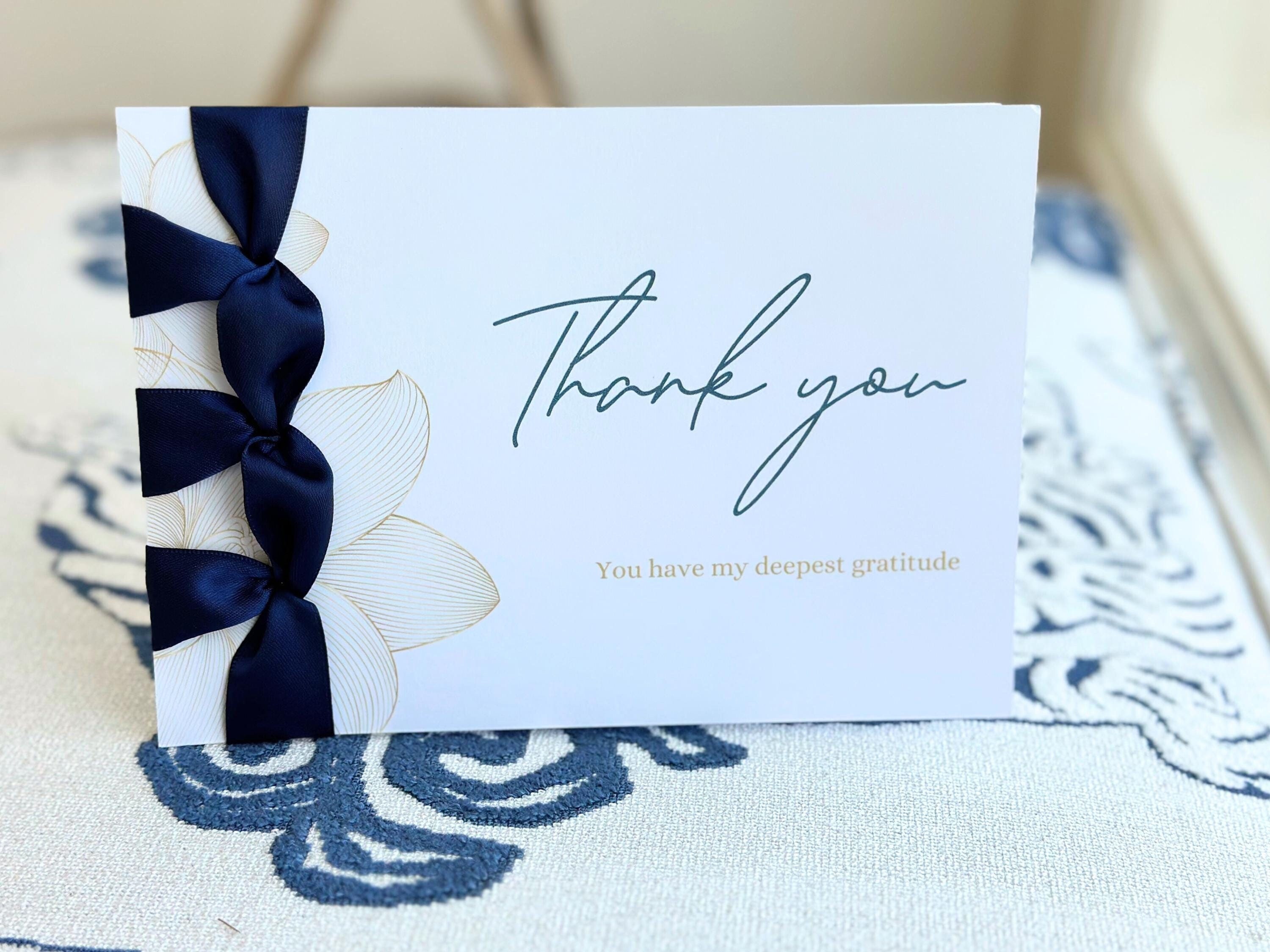 This elegant card will be the special gift for saying Thank You. This Card has wording in Navy Blue and Gold. It will become a favored keepsake. It is made from quality materials and crafted with meticulous care. Japanese Binding makes the ribbon on the card very elegant.