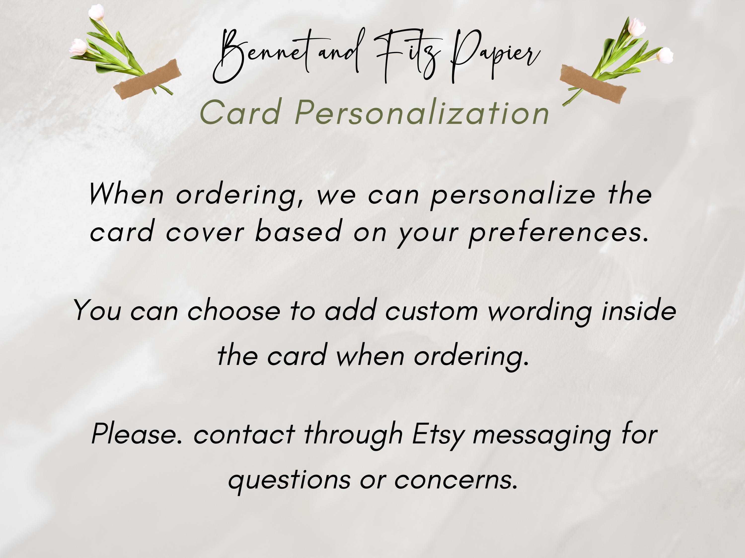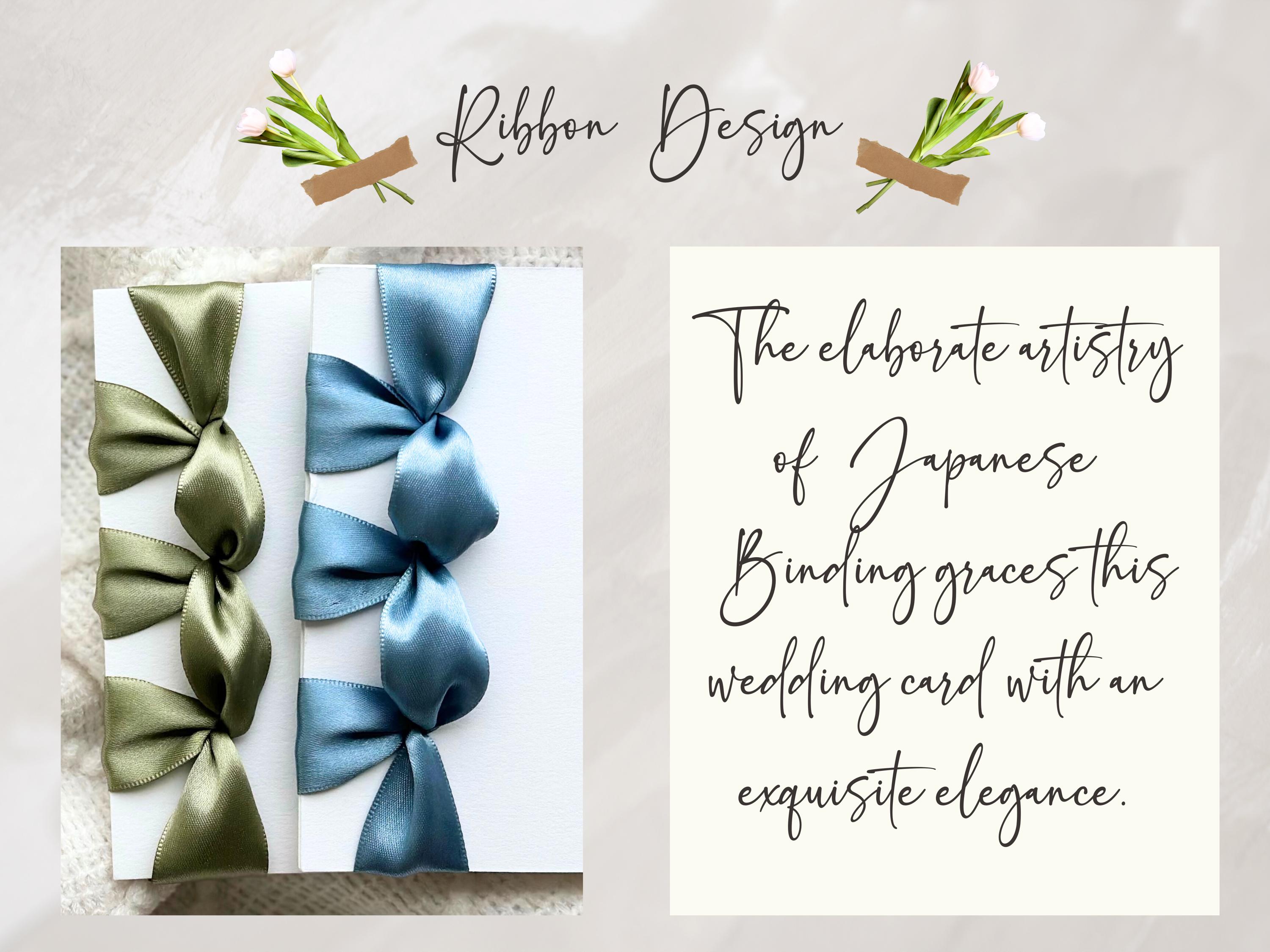 Your loved ones will love this custom card. The card is blank on the inside for your special message. It will become favored keepsakes for their important day! It is made from quality materials and crafted with meticulous care. Japanese Binding makes the ribbon on the card very elegant.