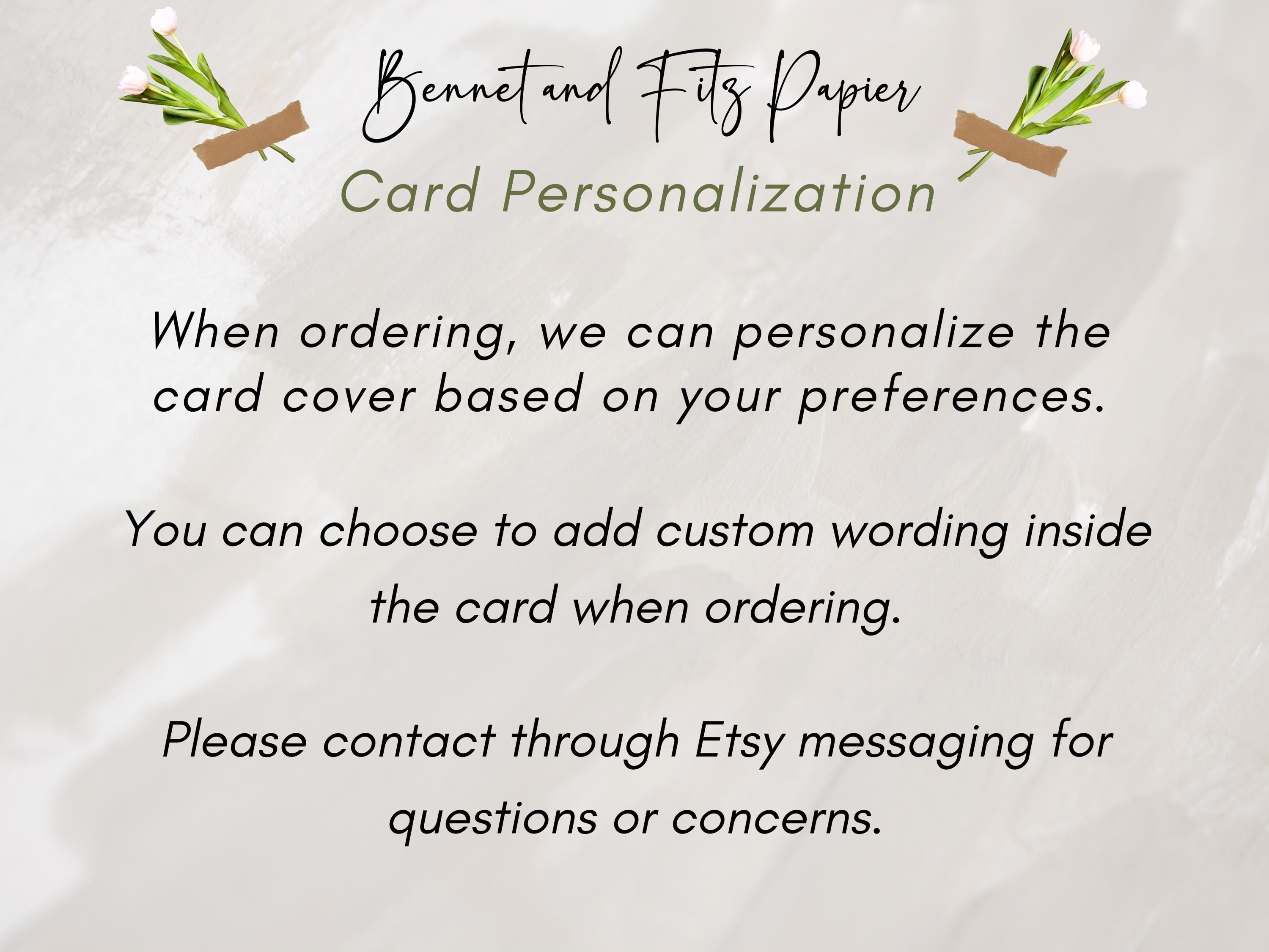 Your loved ones will love this custom card. The card is blank on the inside for your special message. It will become favored keepsakes for their important day! It is made from quality materials and crafted with meticulous care. Japanese Binding makes the ribbon on the card very elegant.