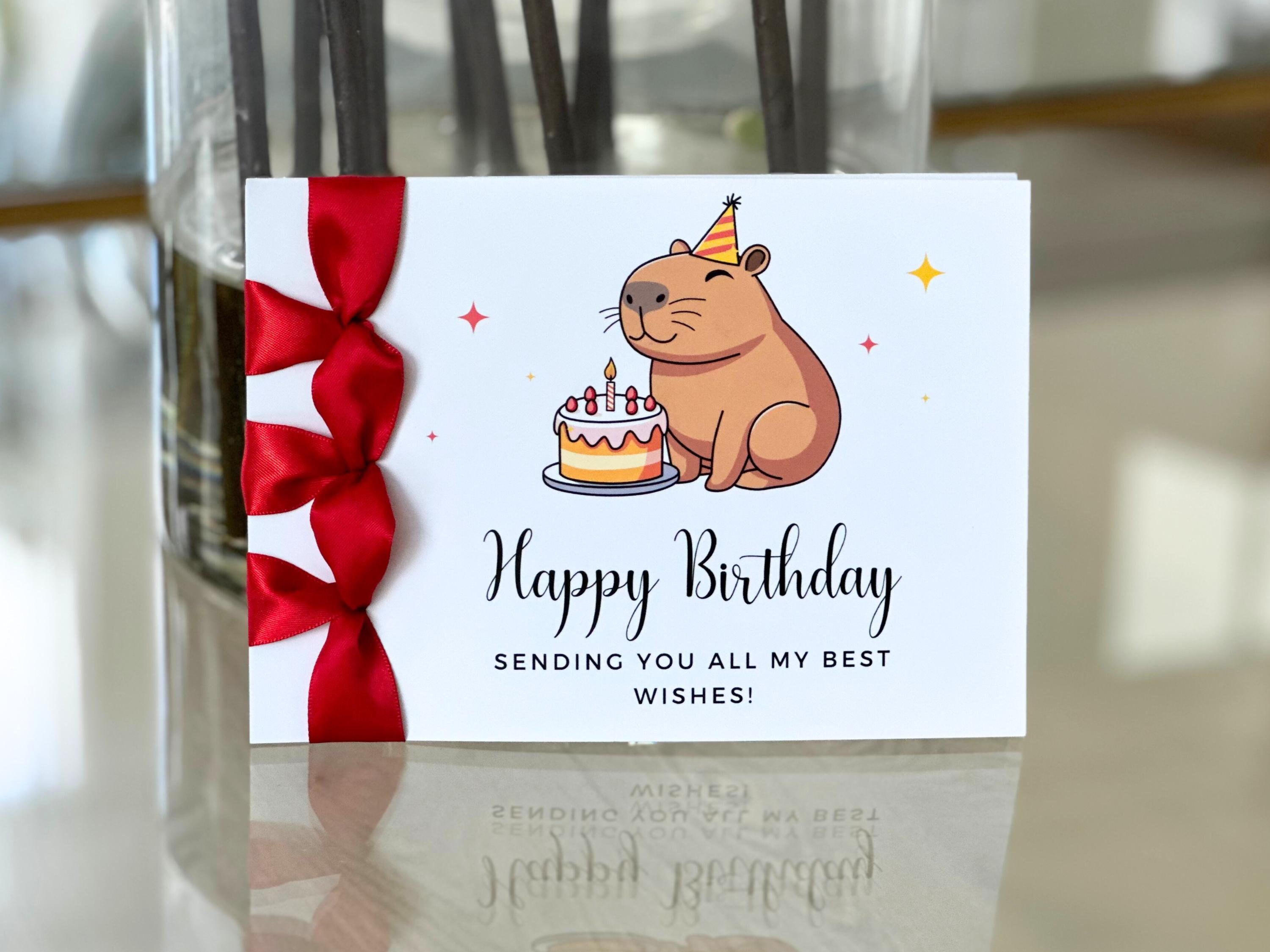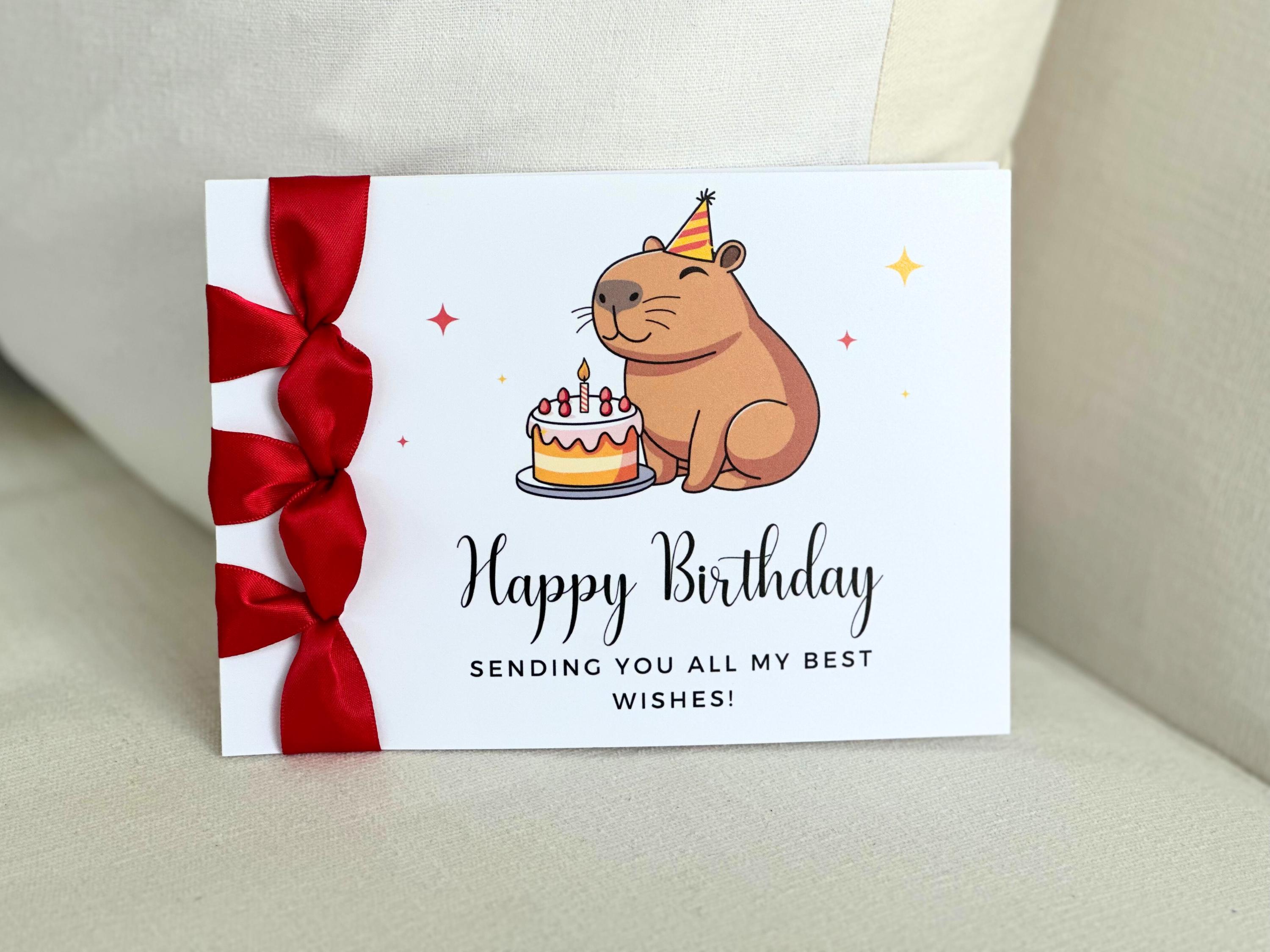 Handmade Capybara Birthday Card, Satin Ribbon, Personalized Luxury Card