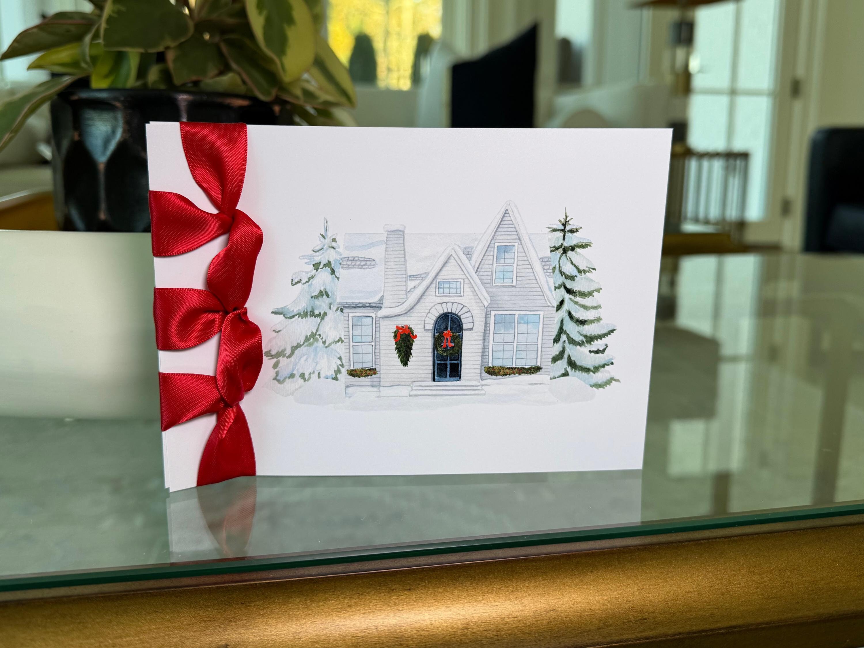 Custom Handmade Christmas Card, Satin Ribbon, Luxury Card, Happy Holidays, Home in the Snow