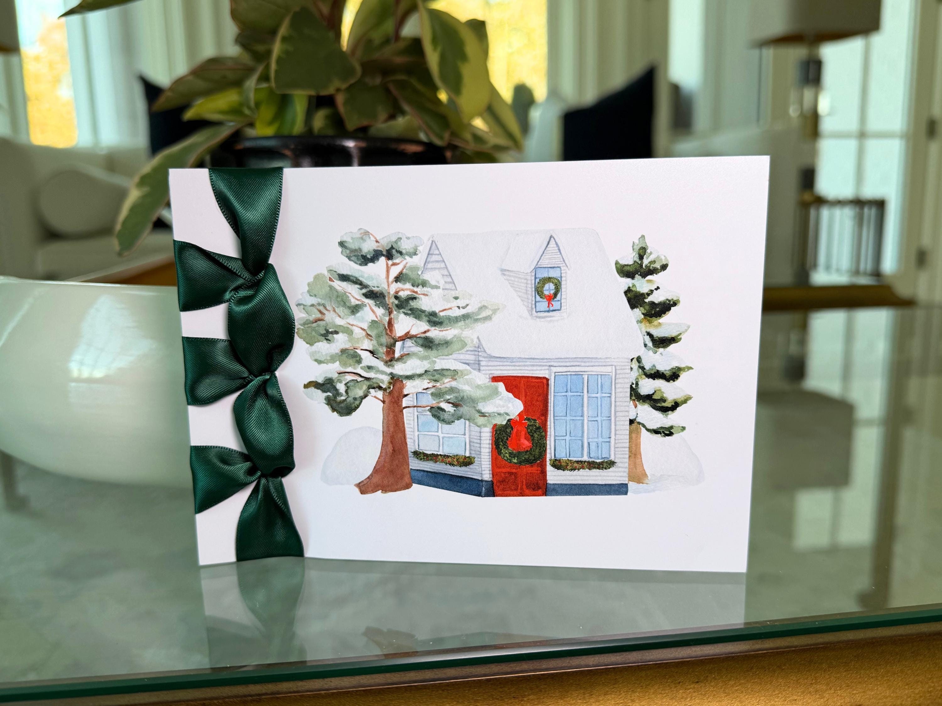 Custom Handmade Christmas Card, Satin Ribbon, Luxury Card, Happy Holidays, Home in the Snow