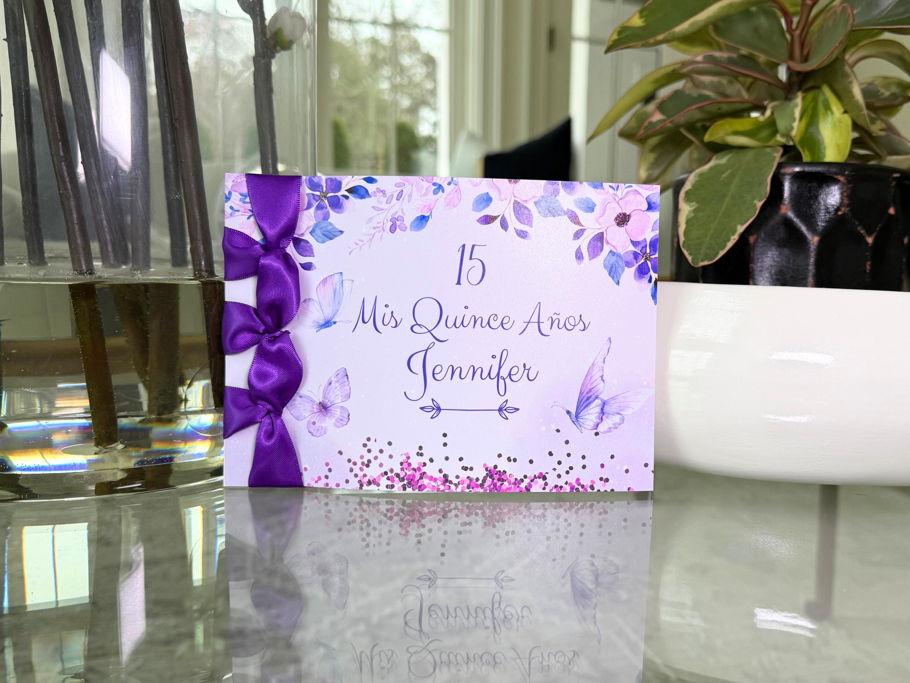 Celebrate her 15th birthday in style with this handmade luxury Miss Quince Años card, personalized with her name and finished with a satin ribbon — an elegant keepsake she’ll treasure forever.
