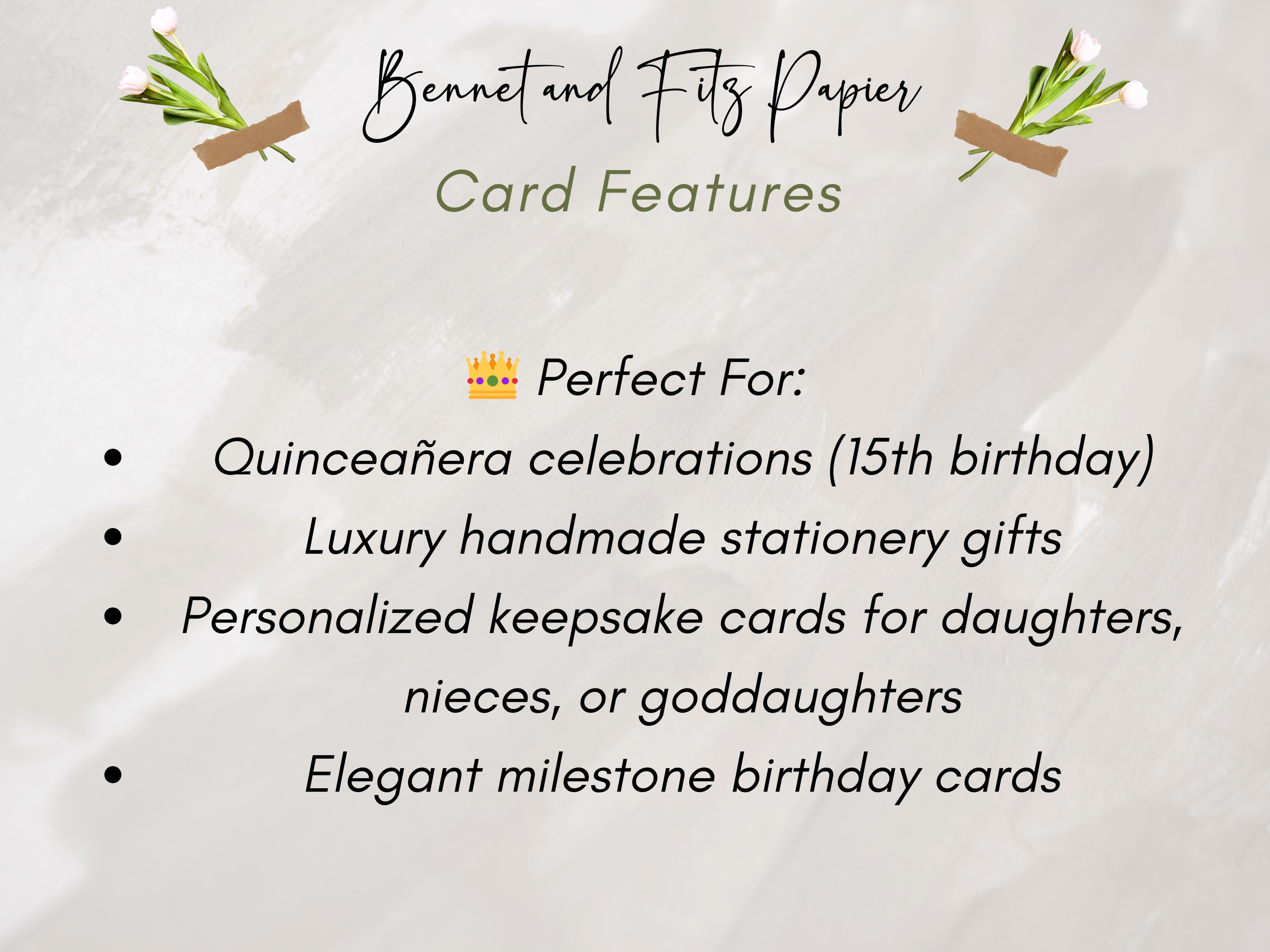 Honor her Quince Años — a moment filled with grace, beauty, and joy — with this Custom Handmade Birthday Card, designed to make her milestone celebration unforgettable.