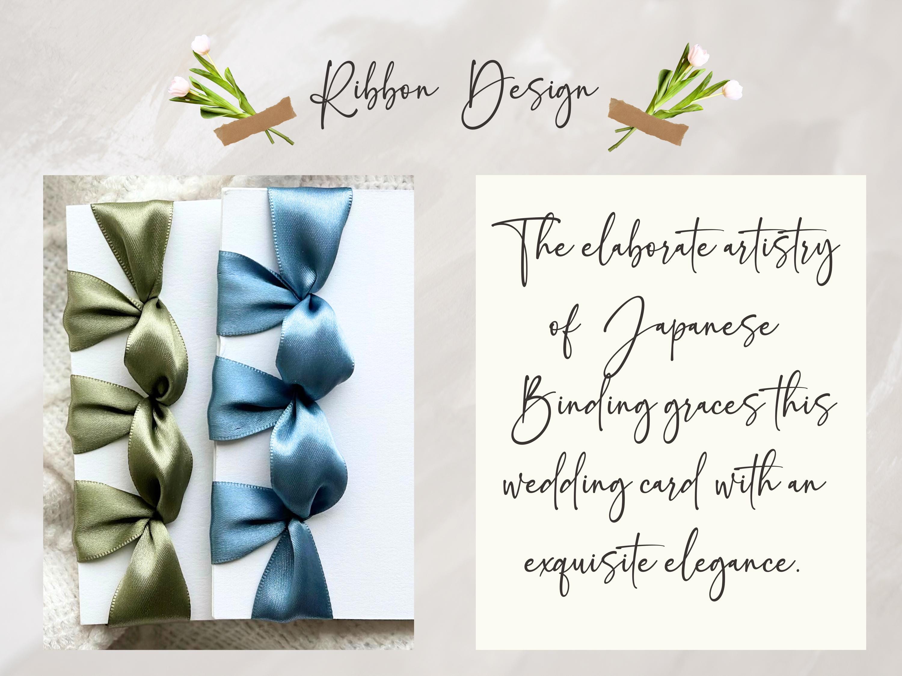 These elegant cards will be the highlight of your wedding participants. They will become favored keepsakes of your special day. They are made from quality materials and crafted with meticulous care. Japanese Binding makes the ribbon on the card very elegant.