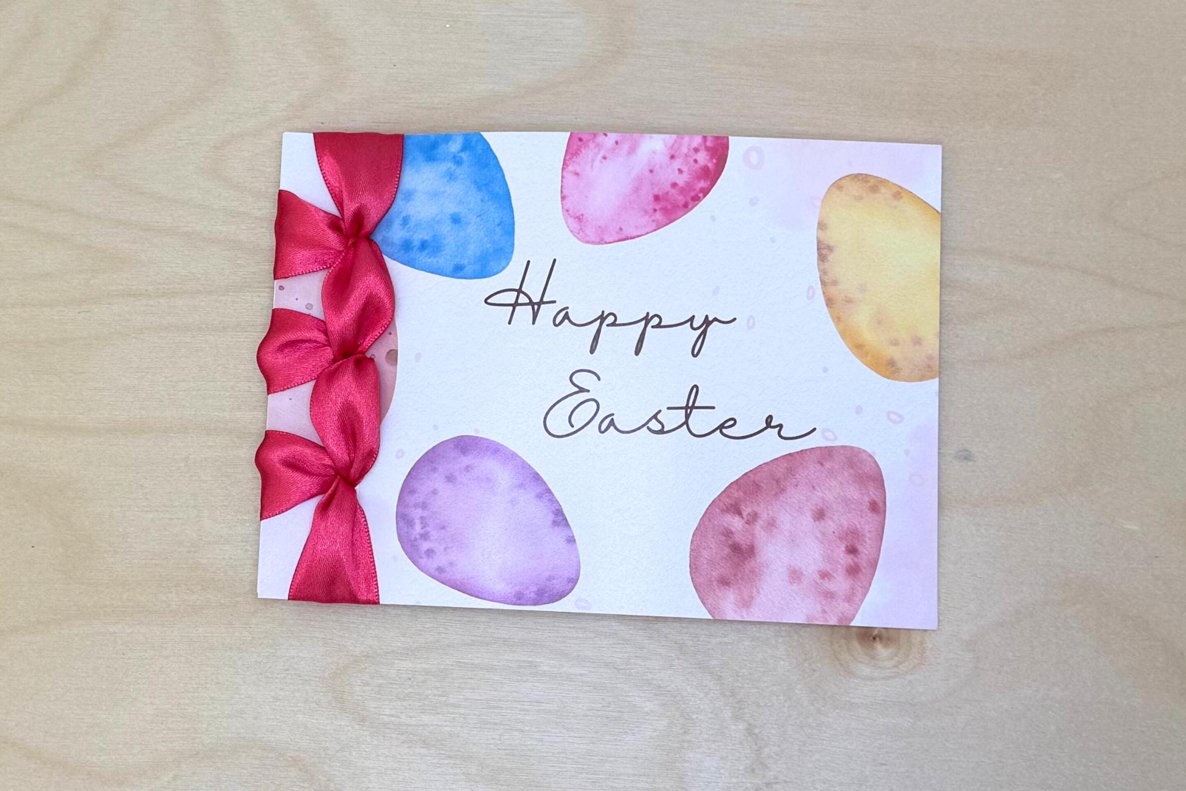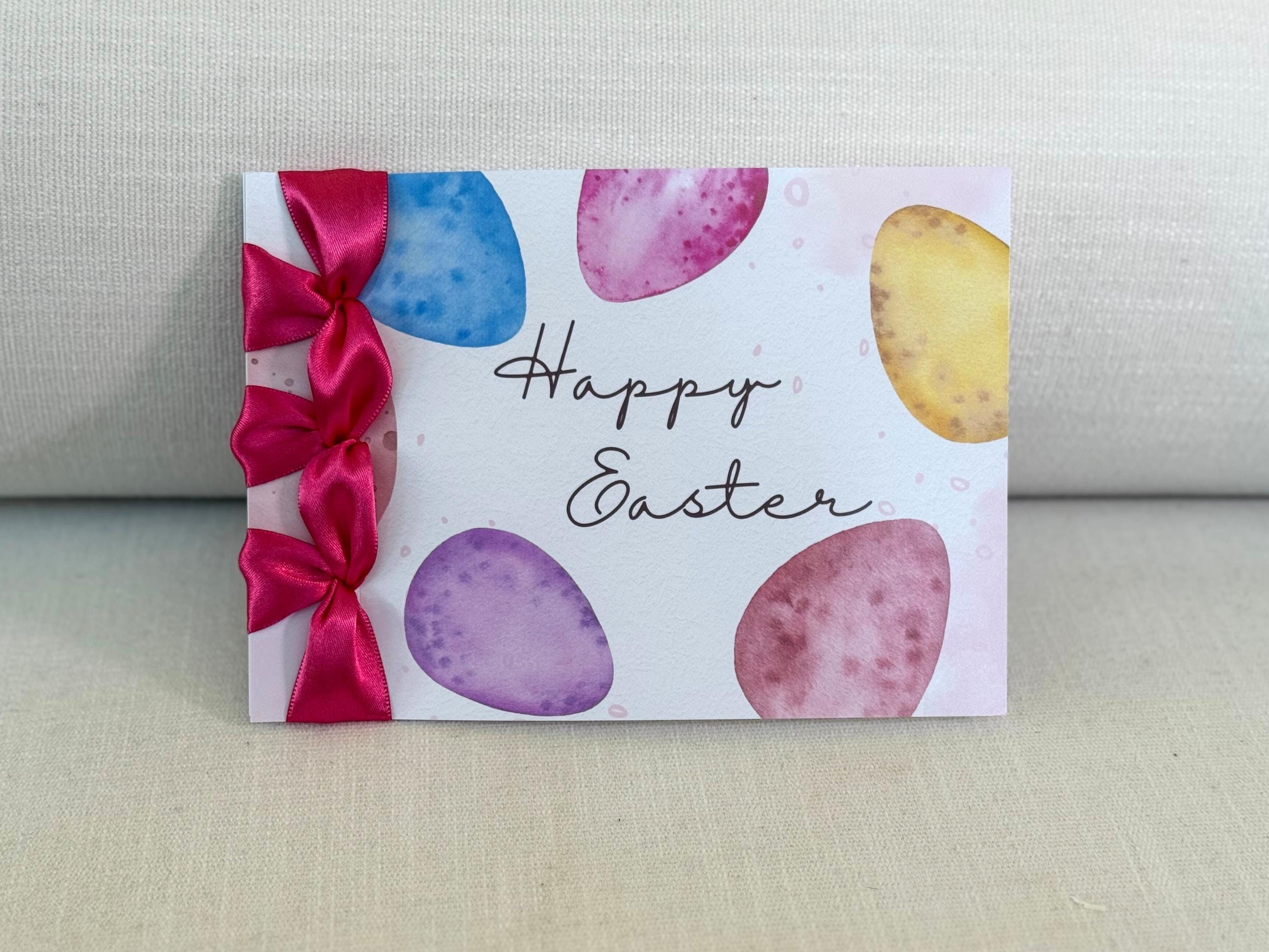 Celebrate the season of renewal with this handmade luxury Easter card, featuring elegant Easter eggs and a satin ribbon finish — a personalized Happy Easter keepsake for someone special.
