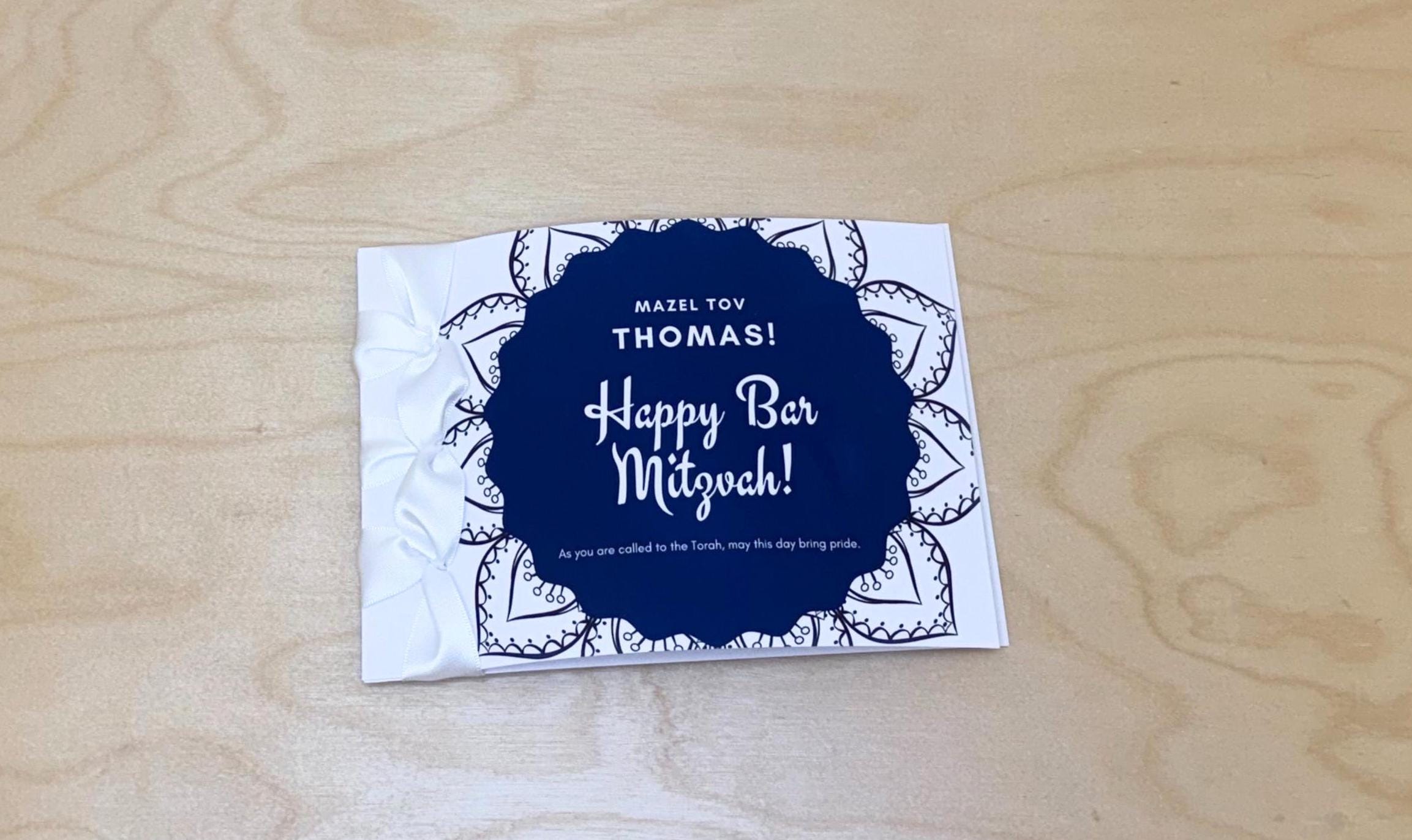 Celebrate his milestone moment with this handmade luxury Bar Mitzvah card, personalized with his name and finished with a satin ribbon — a timeless keepsake to honor faith, growth, and new beginnings.