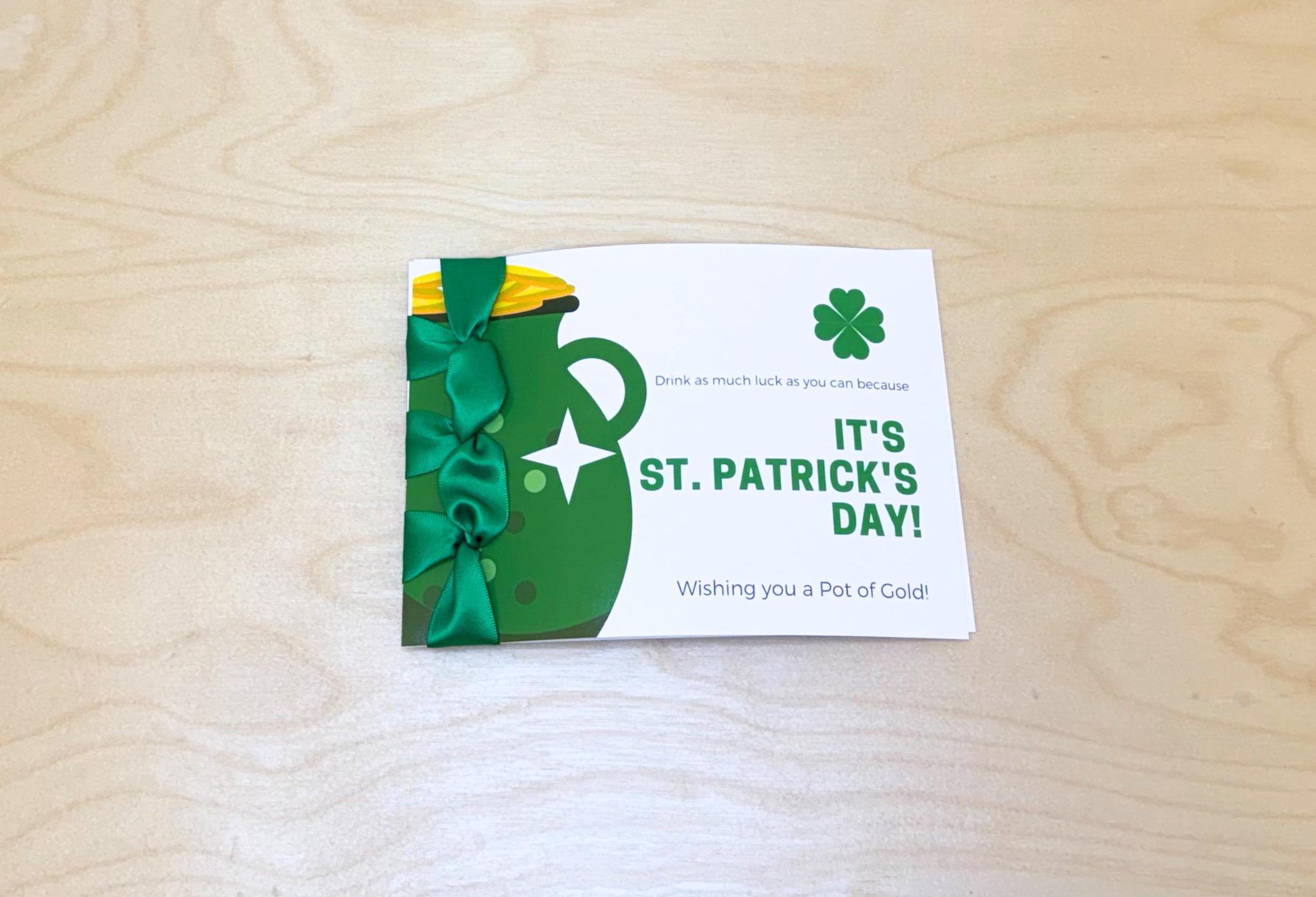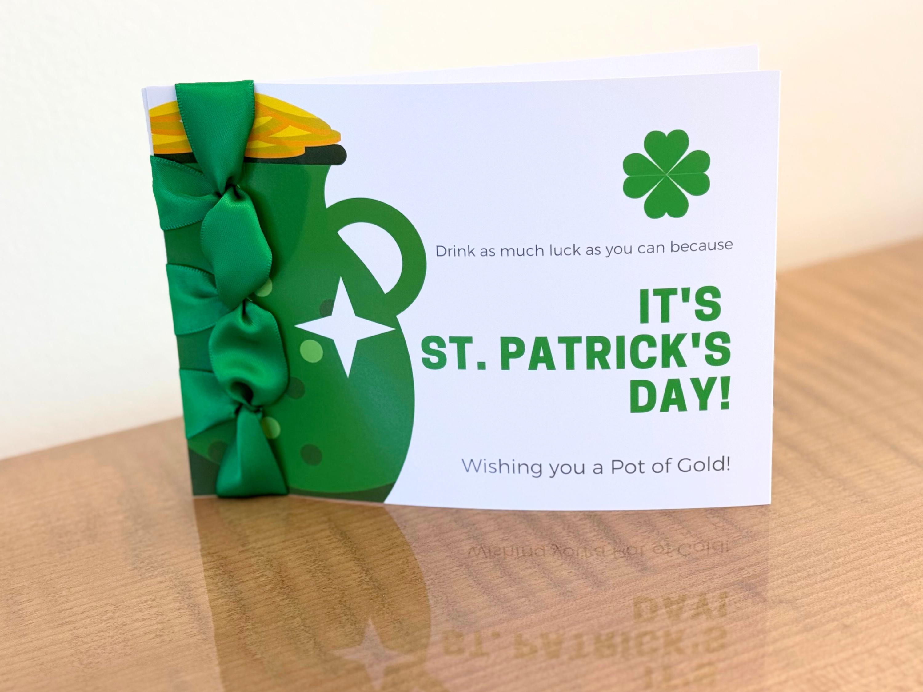 Share a bit of Irish luck with this handmade luxury St. Patrick’s Day card, adorned with a satin ribbon and optional personalization — featuring a charming pot of gold design to brighten someone’s day.