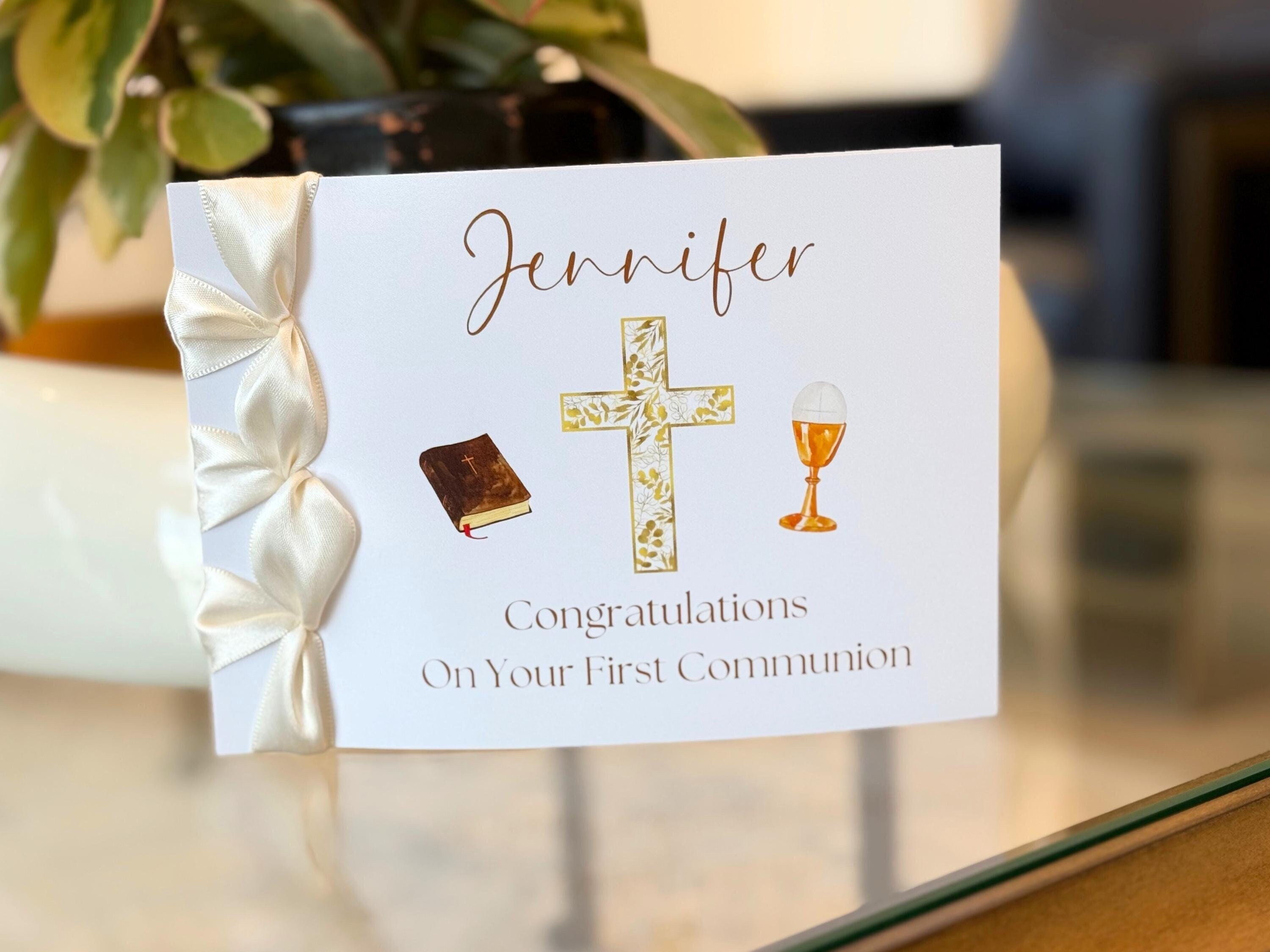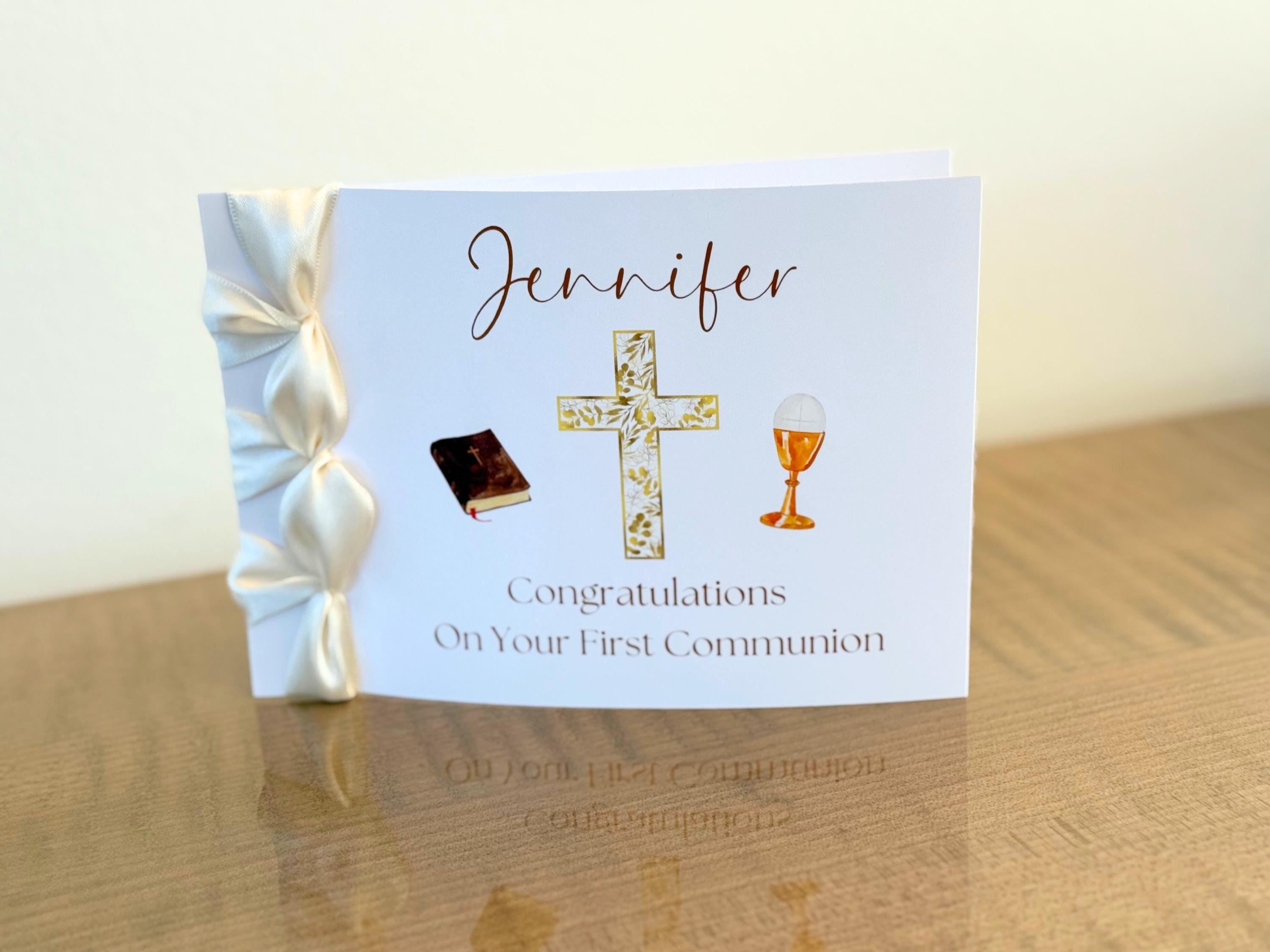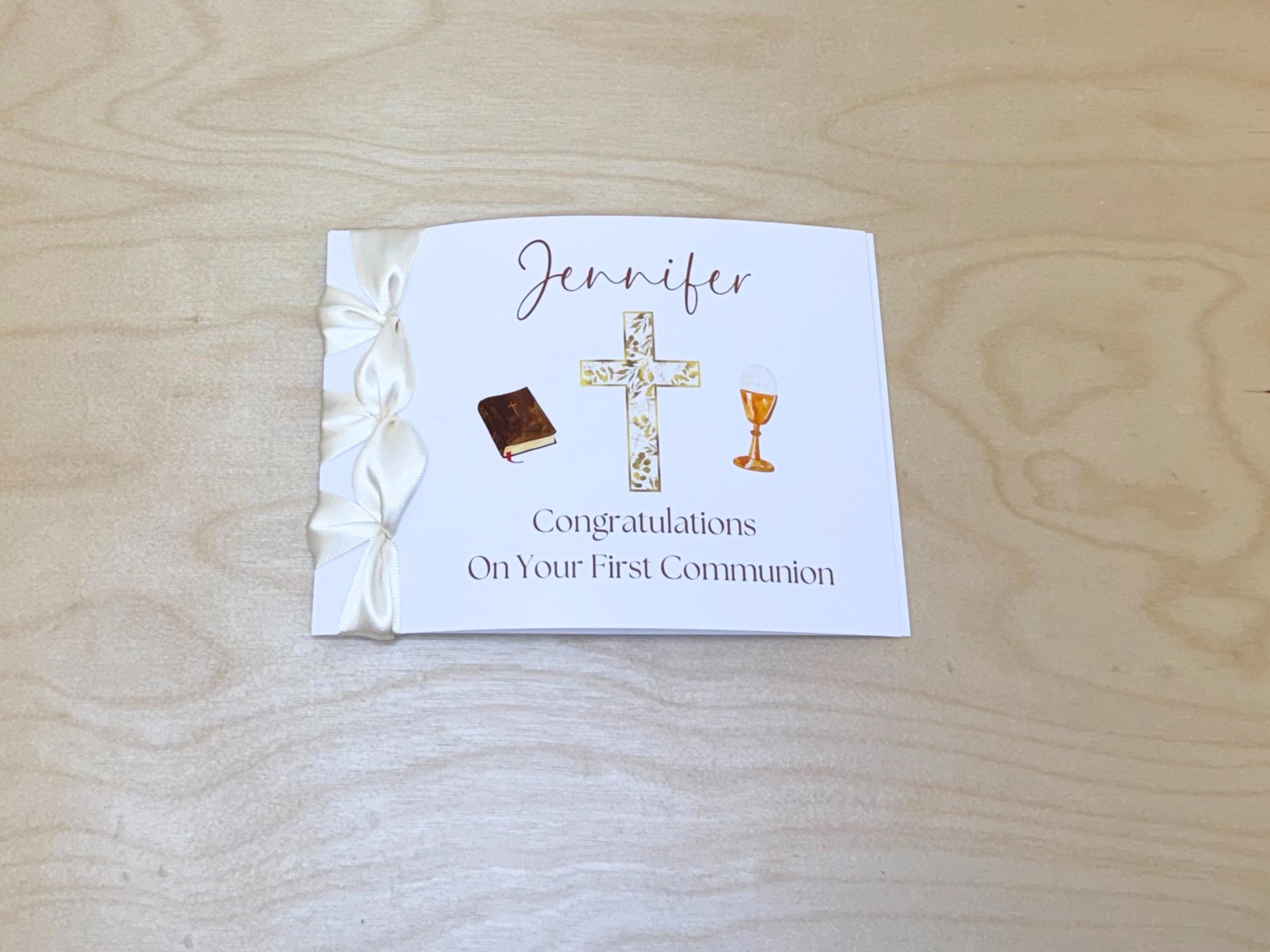 Celebrate her sacred milestone with this handmade luxury First Communion card, personalized with her name and finished with a satin ribbon — a beautiful keepsake to treasure forever.