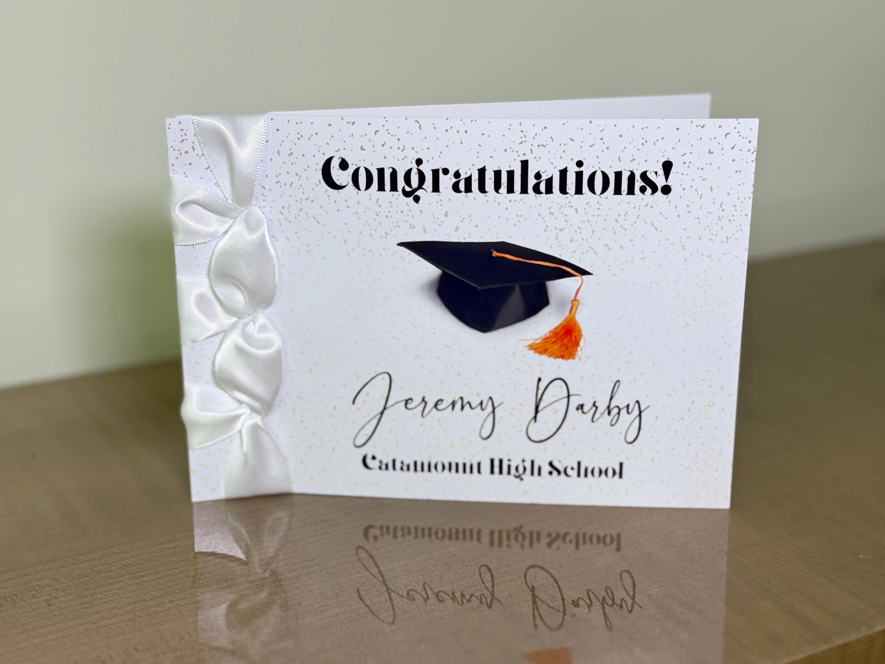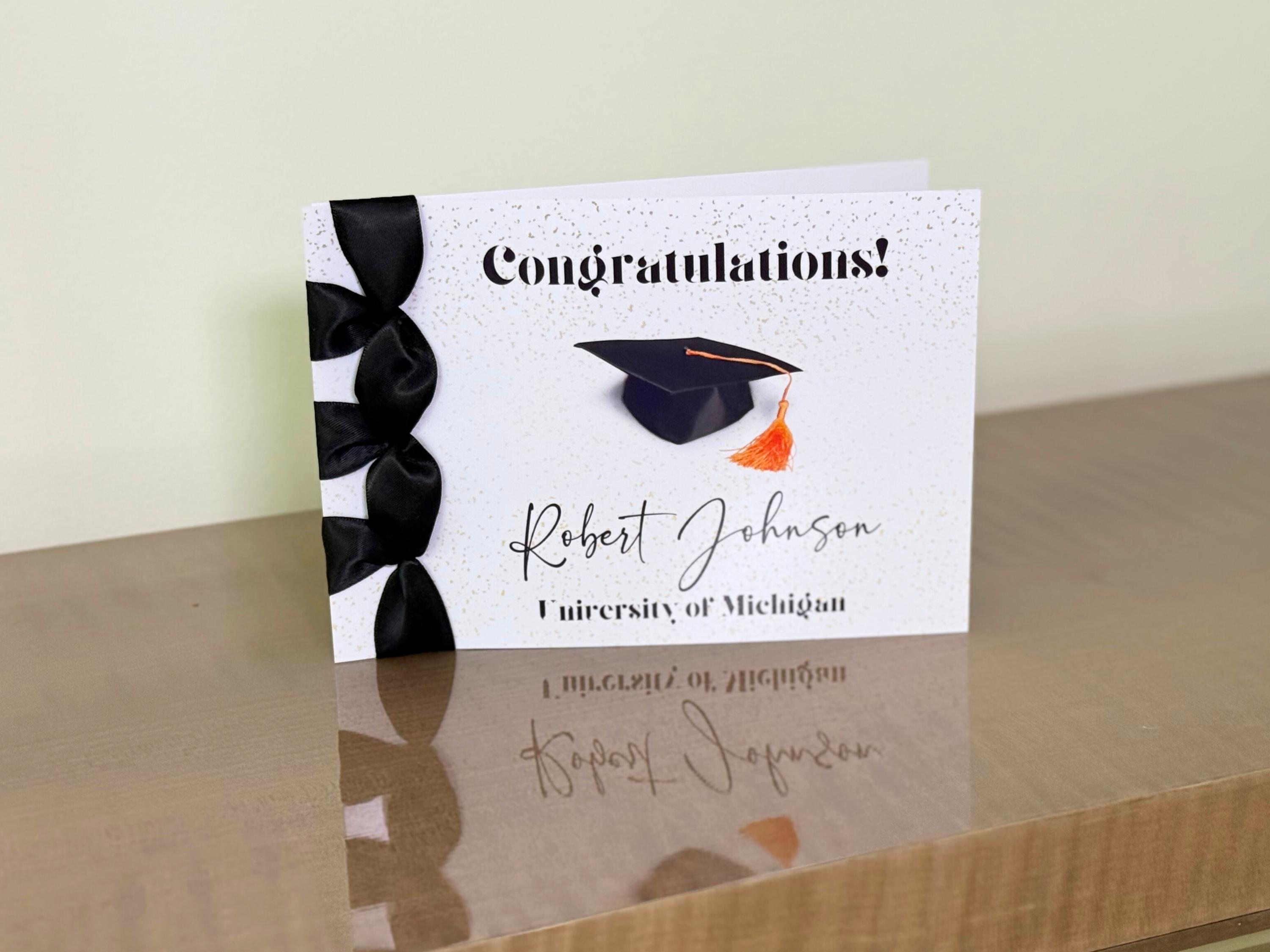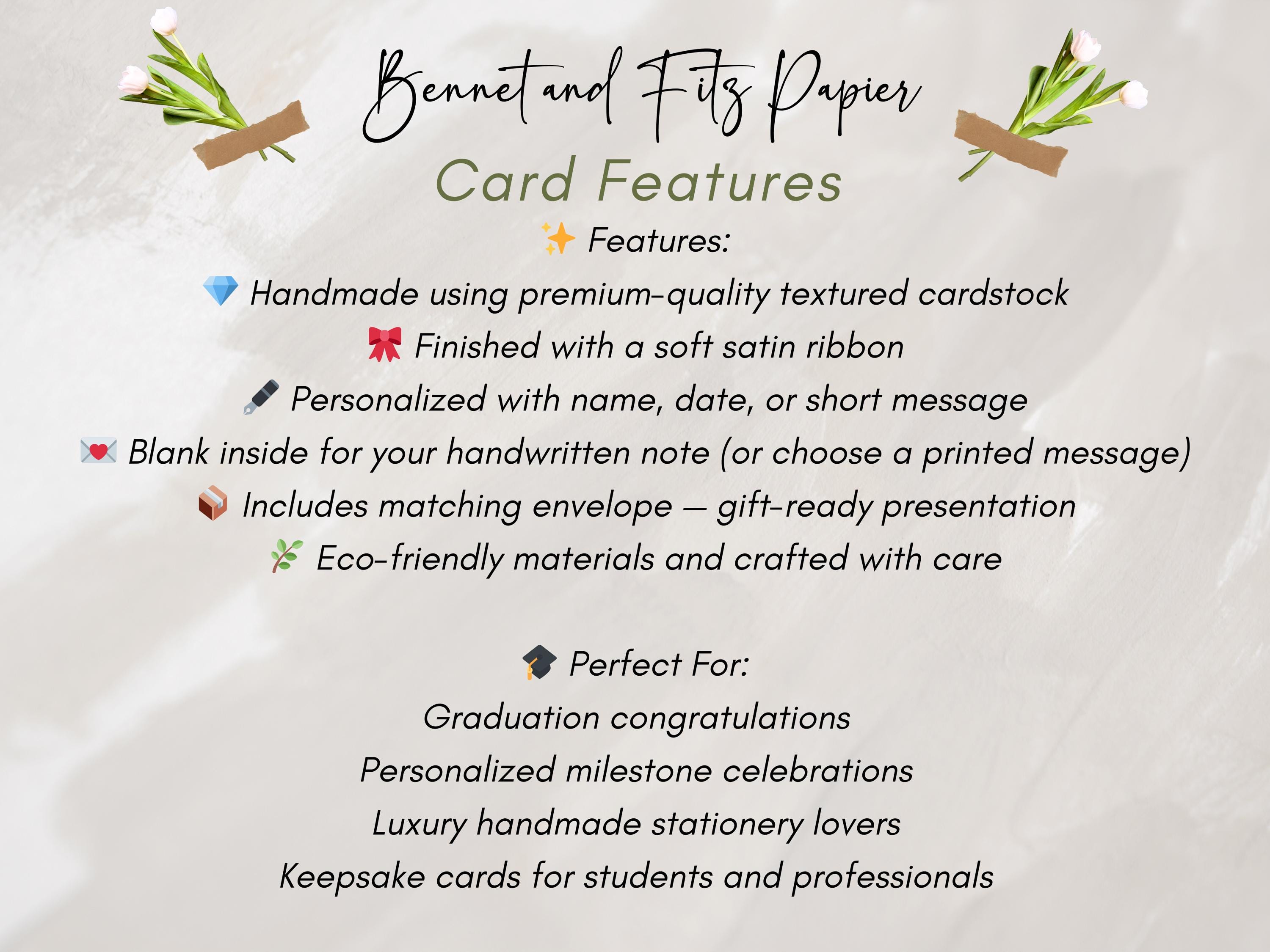 Each card is handmade with care using premium textured cardstock, adorned with a luxurious satin ribbon, and personalized with the graduate’s name, year, or short message for a unique and meaningful touch.