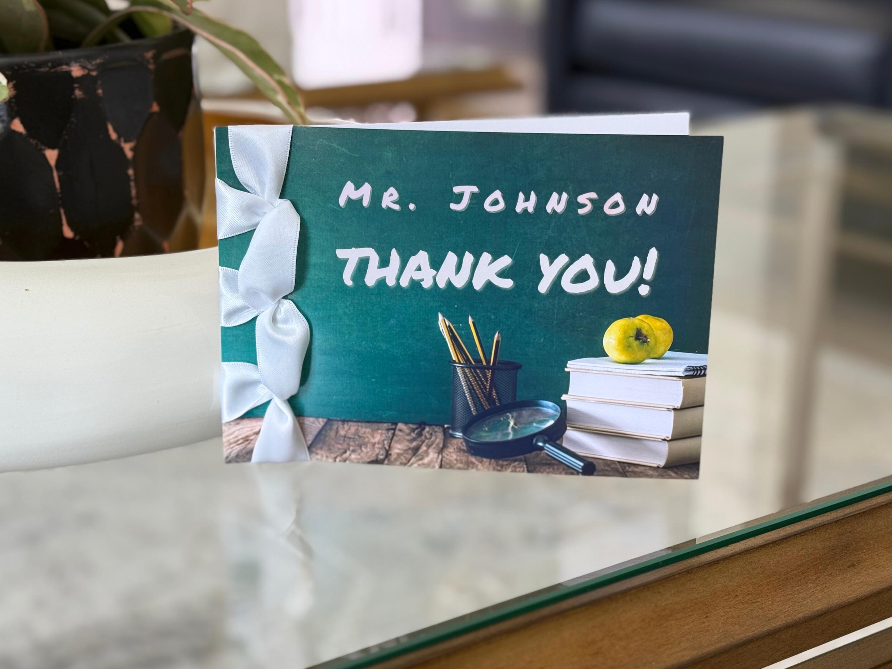 Say thank you in style with this handmade teacher appreciation card, beautifully crafted with premium cardstock and finished with a satin ribbon — the perfect personalized way to honor a special teacher.