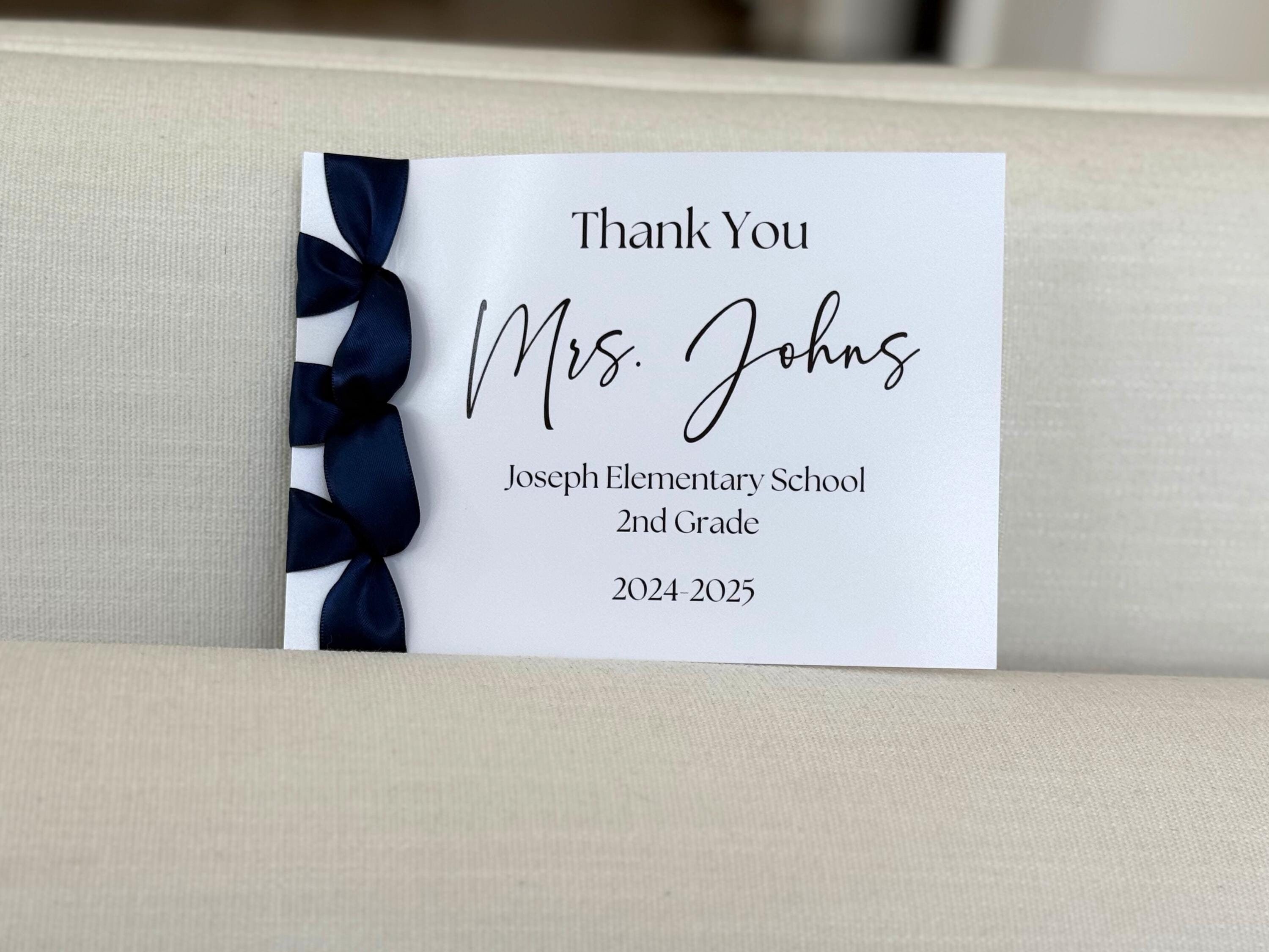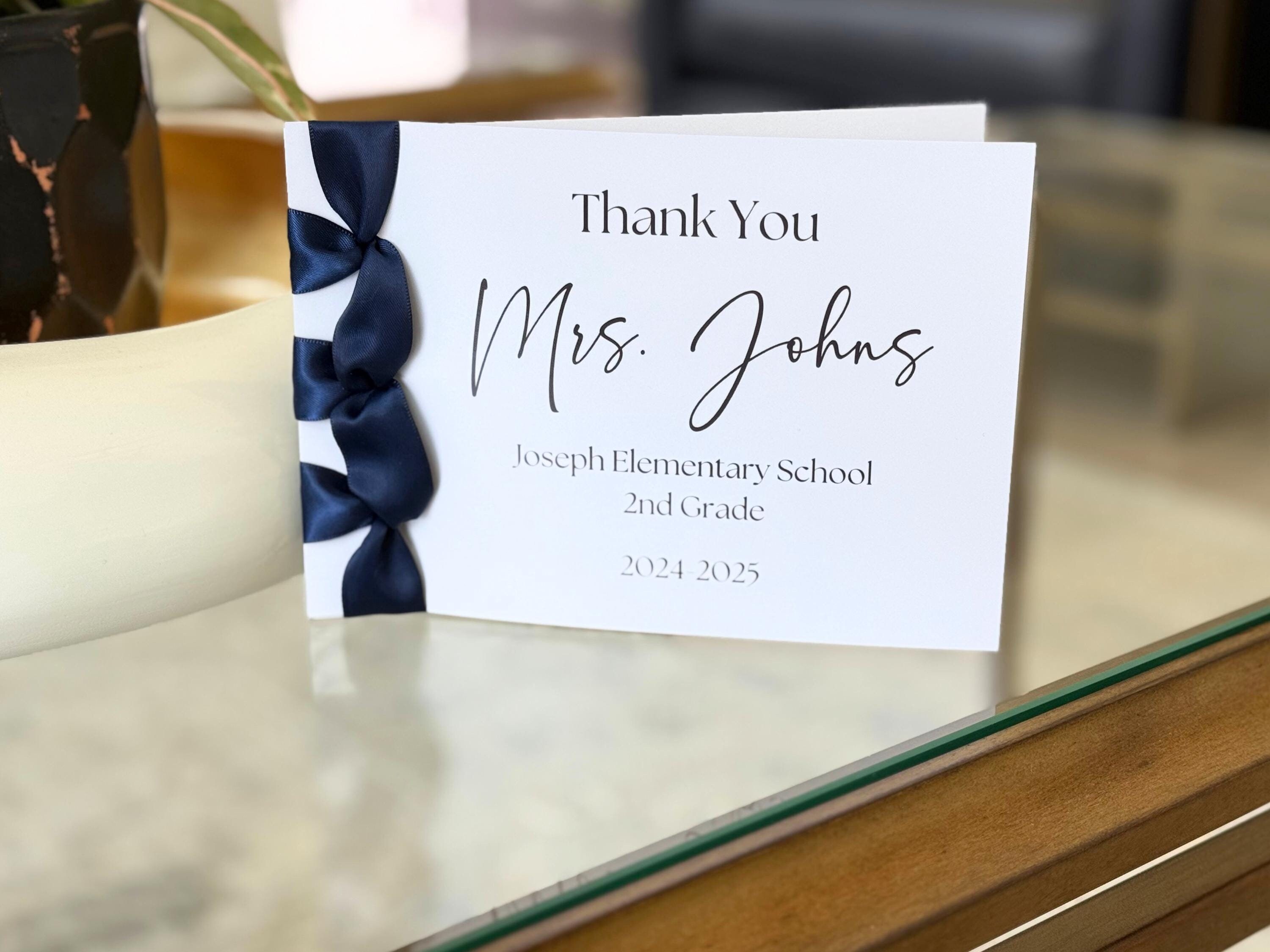 Say thank you in style with this handmade teacher appreciation card, beautifully crafted with premium card stock and finished with a satin ribbon — the perfect personalized way to honor a special teacher.