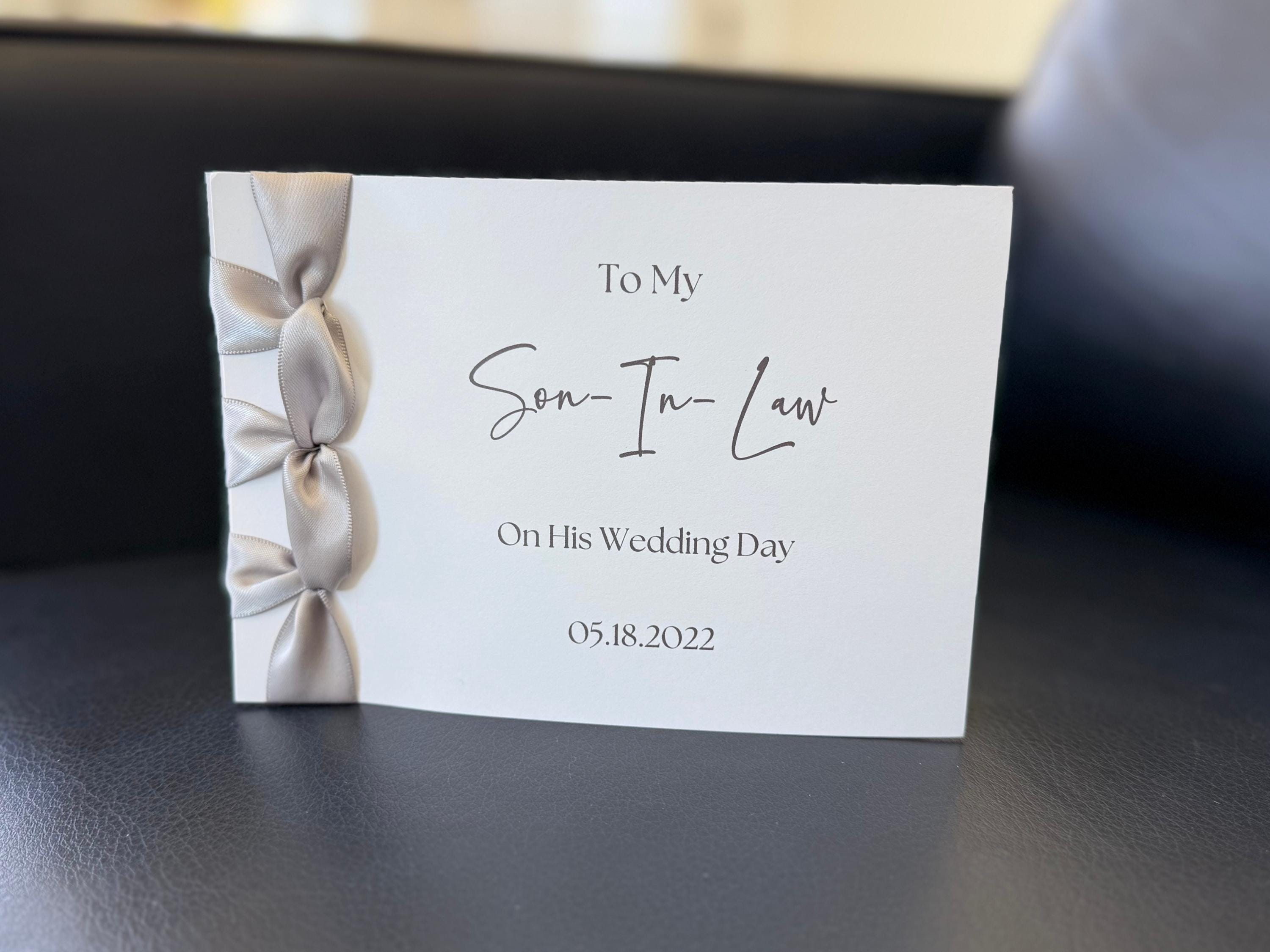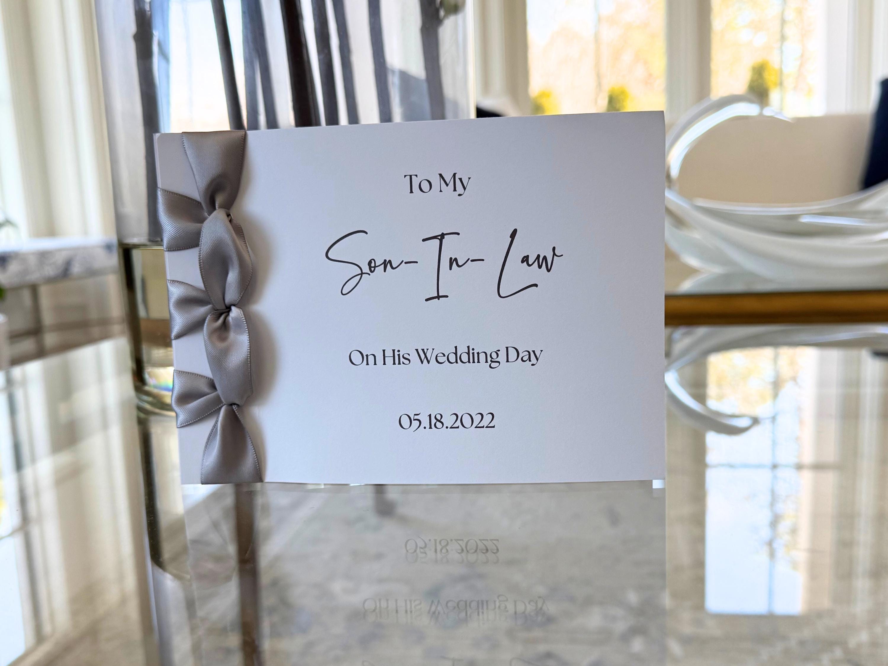 Each card is handmade with premium textured cardstock, bound using the traditional Japanese binding technique, and finished with a luxurious satin ribbon for an elegant, refined look. Personalize it with your son-in-law’s name, wedding date, or short message to make it a one-of-a-kind keepsake.