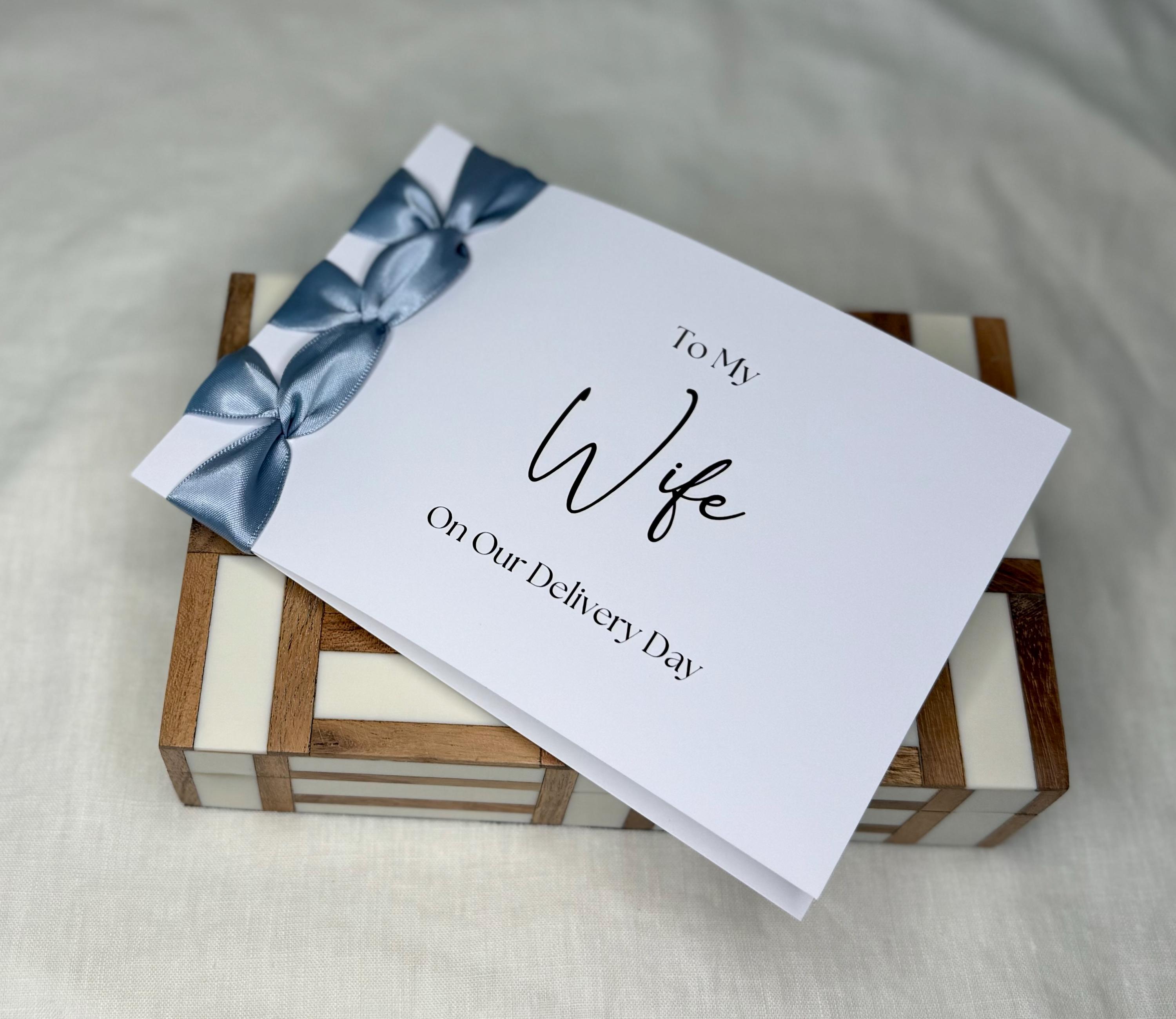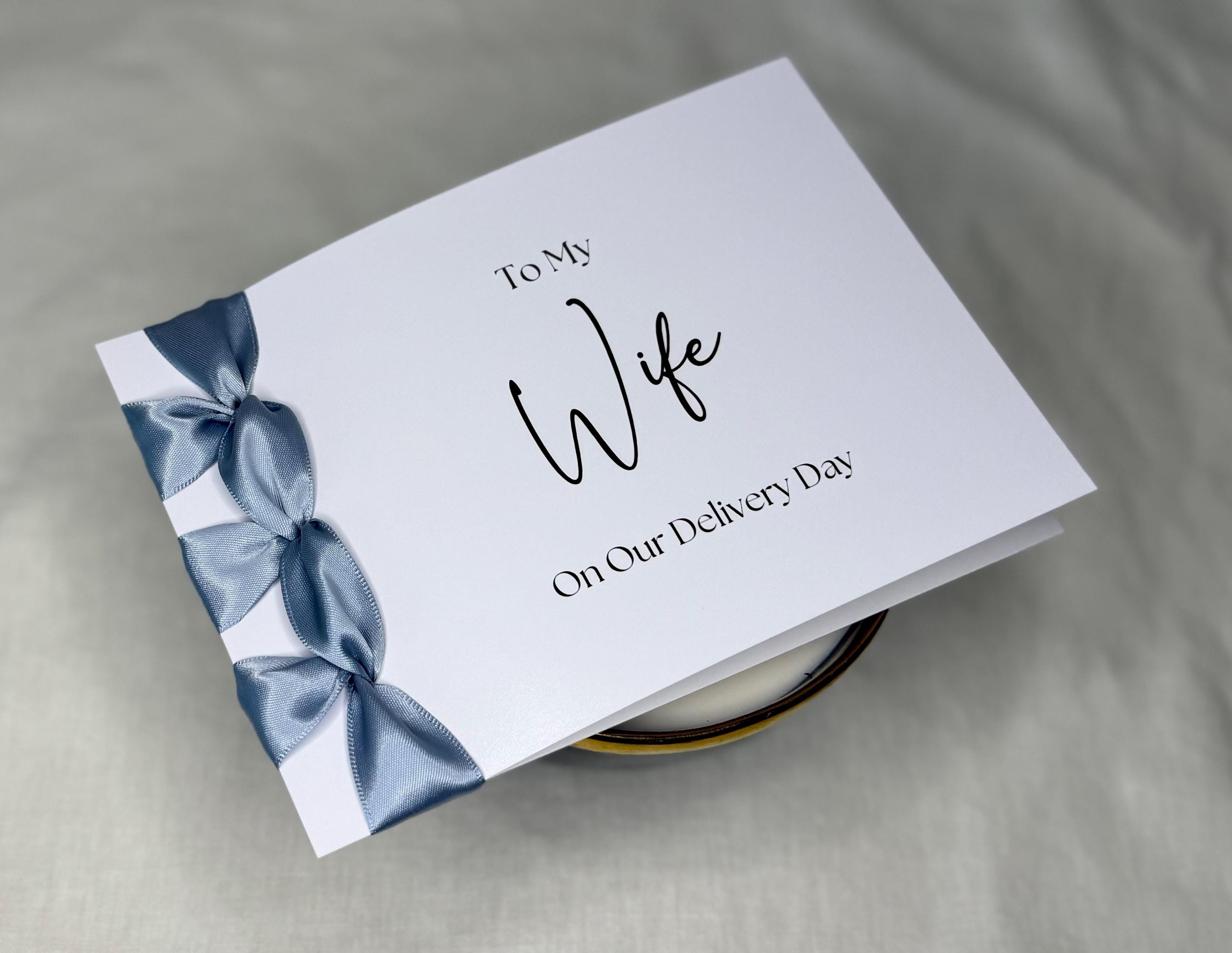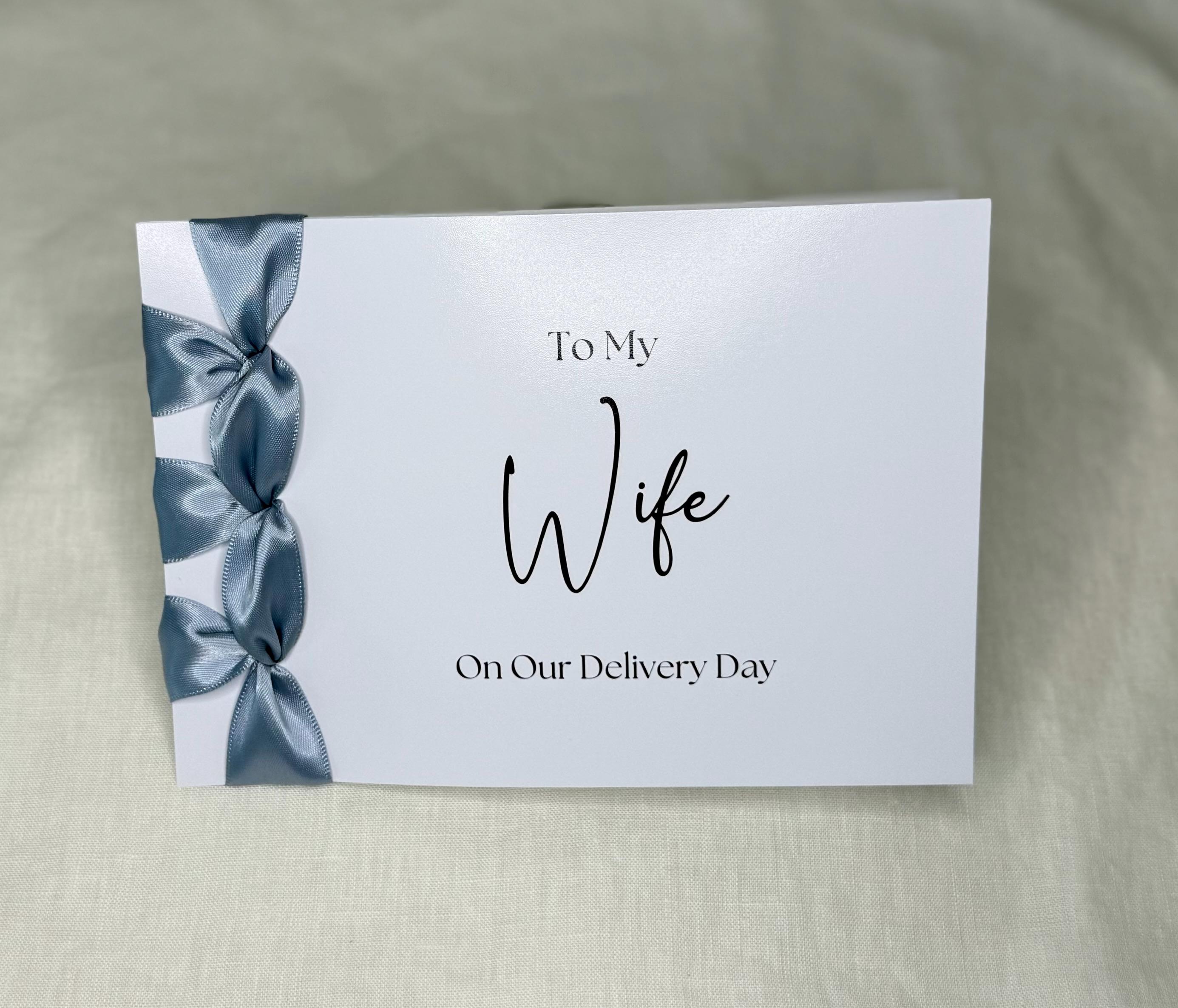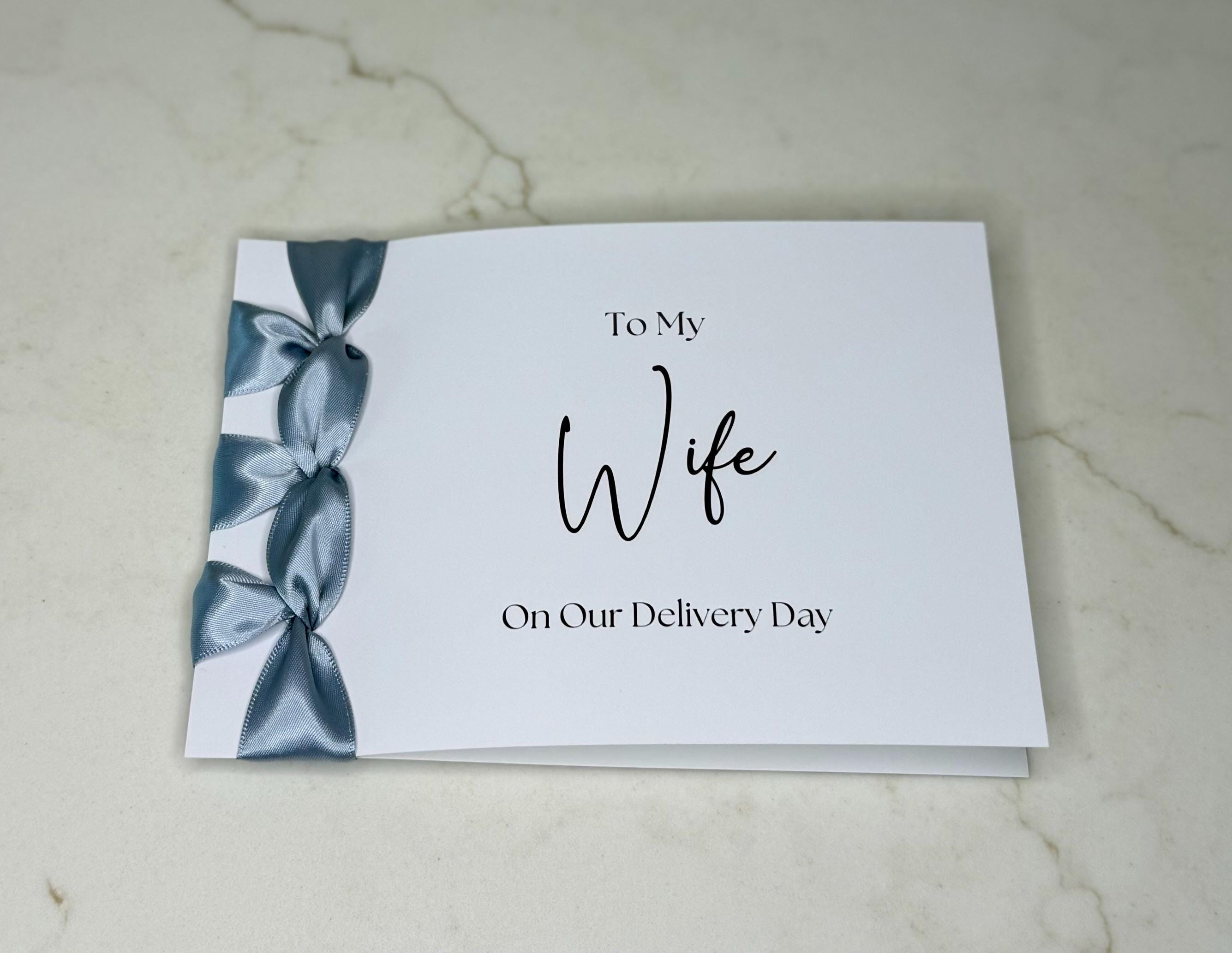 Handmade Congratulations Card: Satin Ribbon, Personalized Keepsake, Wife on Delivery Day, For New Baby