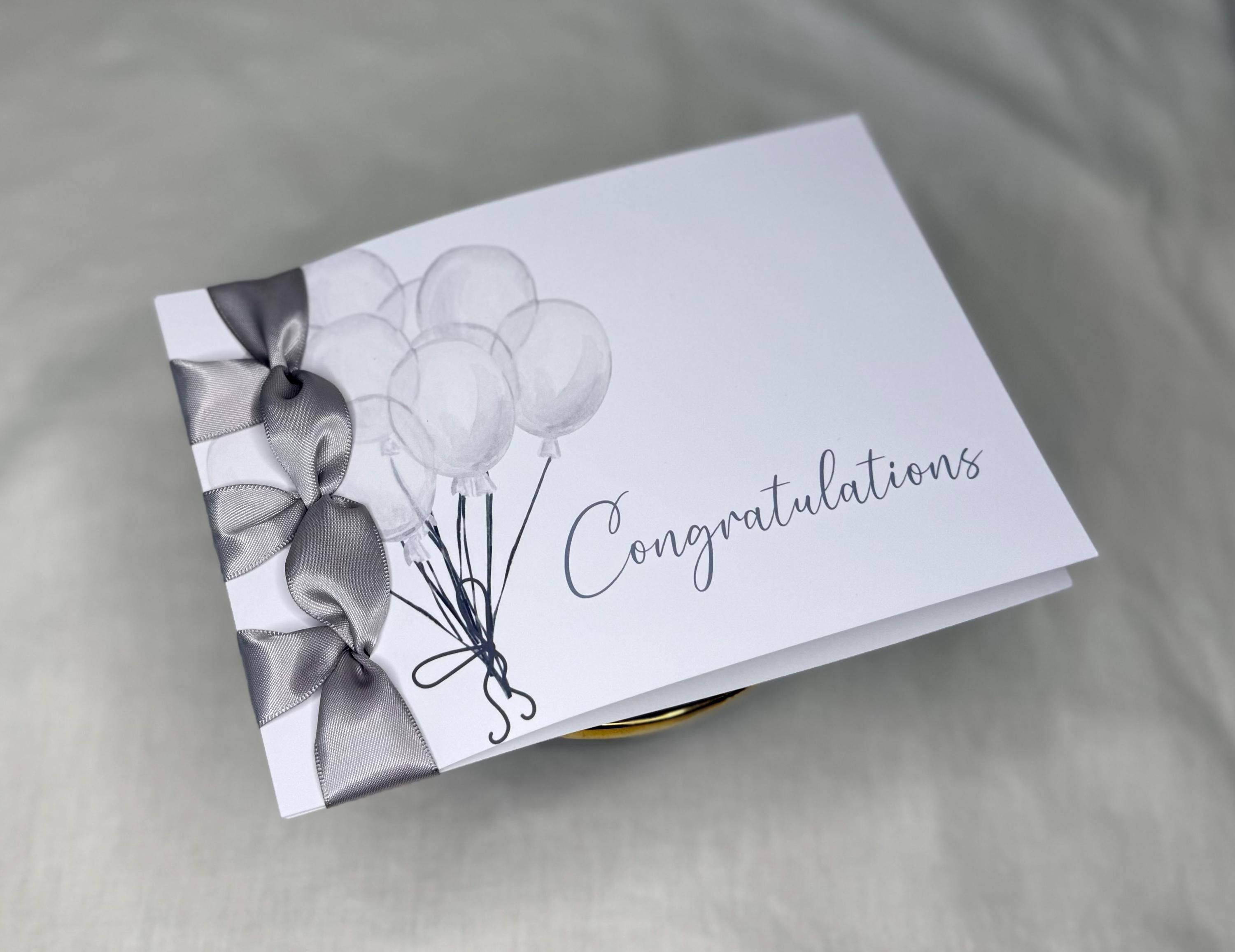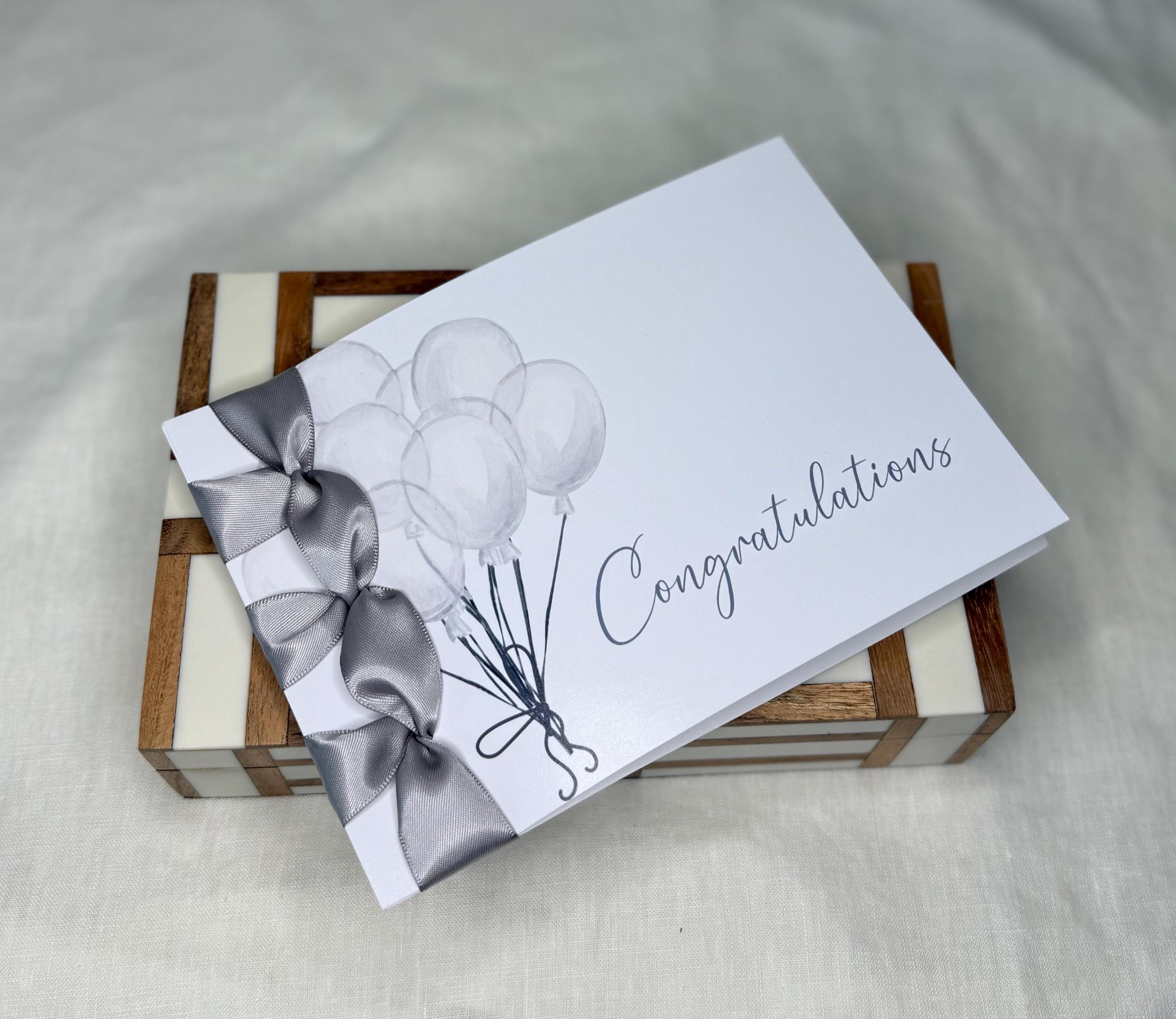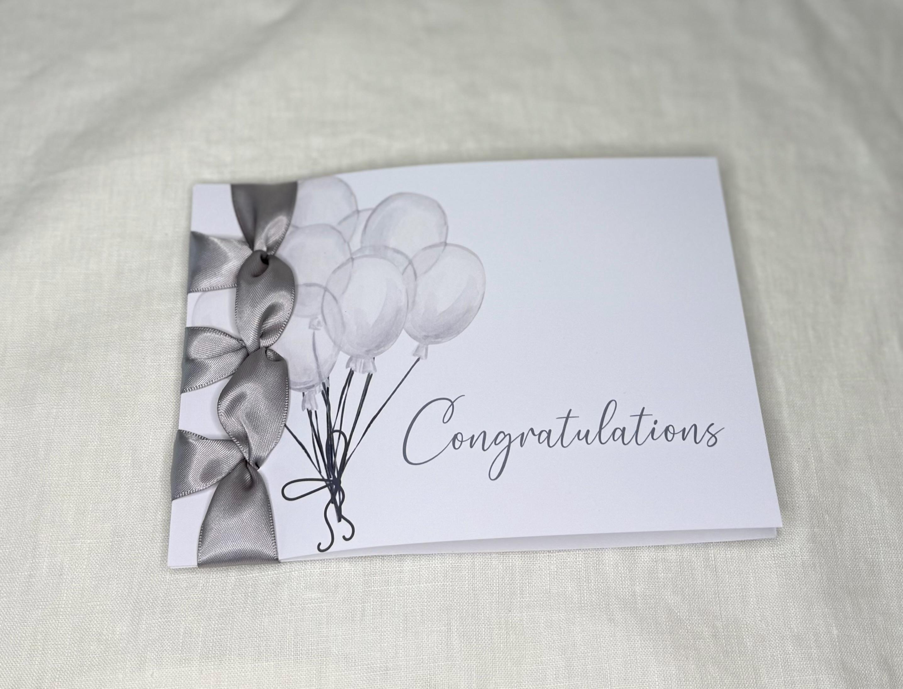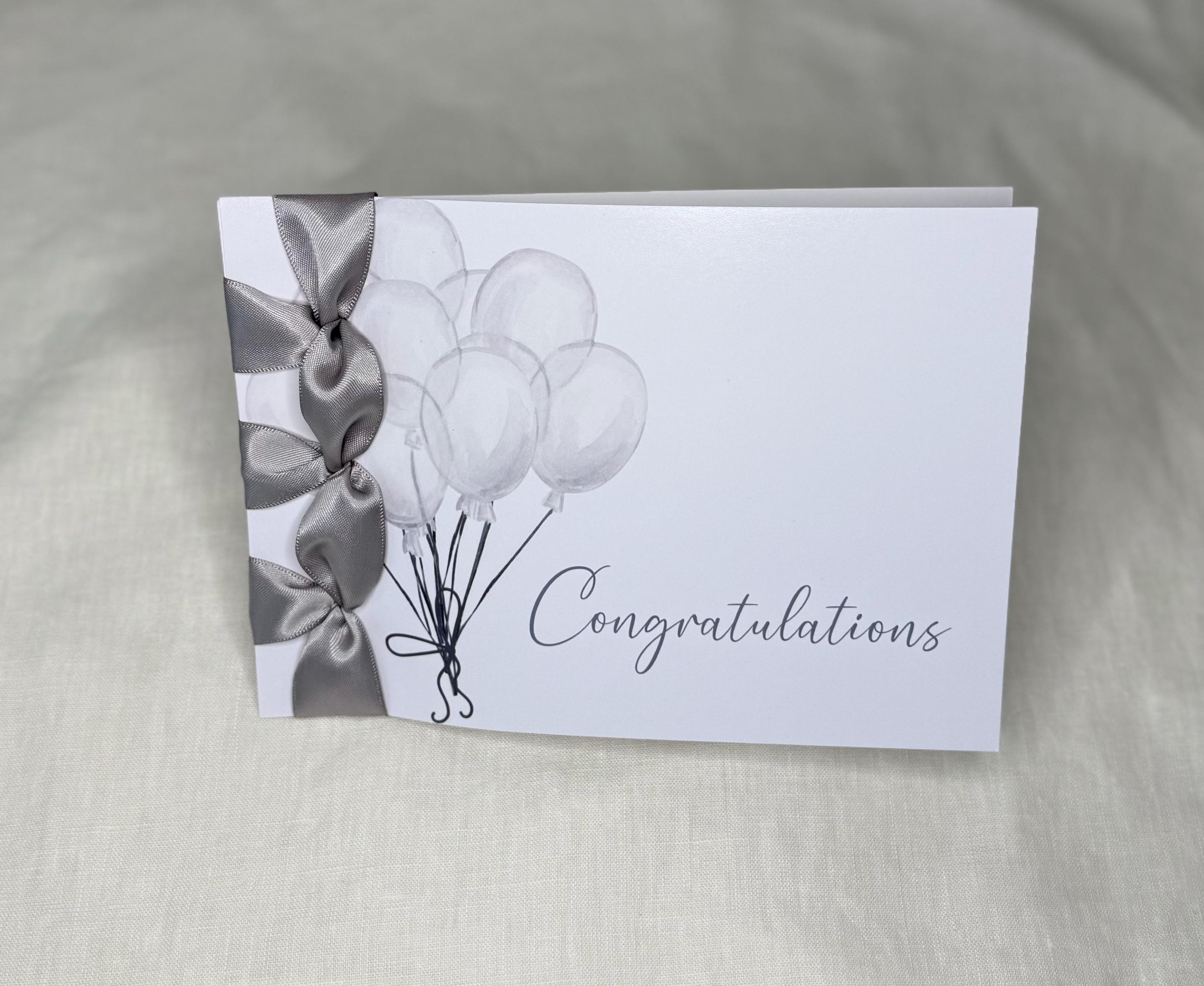 Custom Handmade Congratulations Card: Satin Ribbon & Silver Balloons