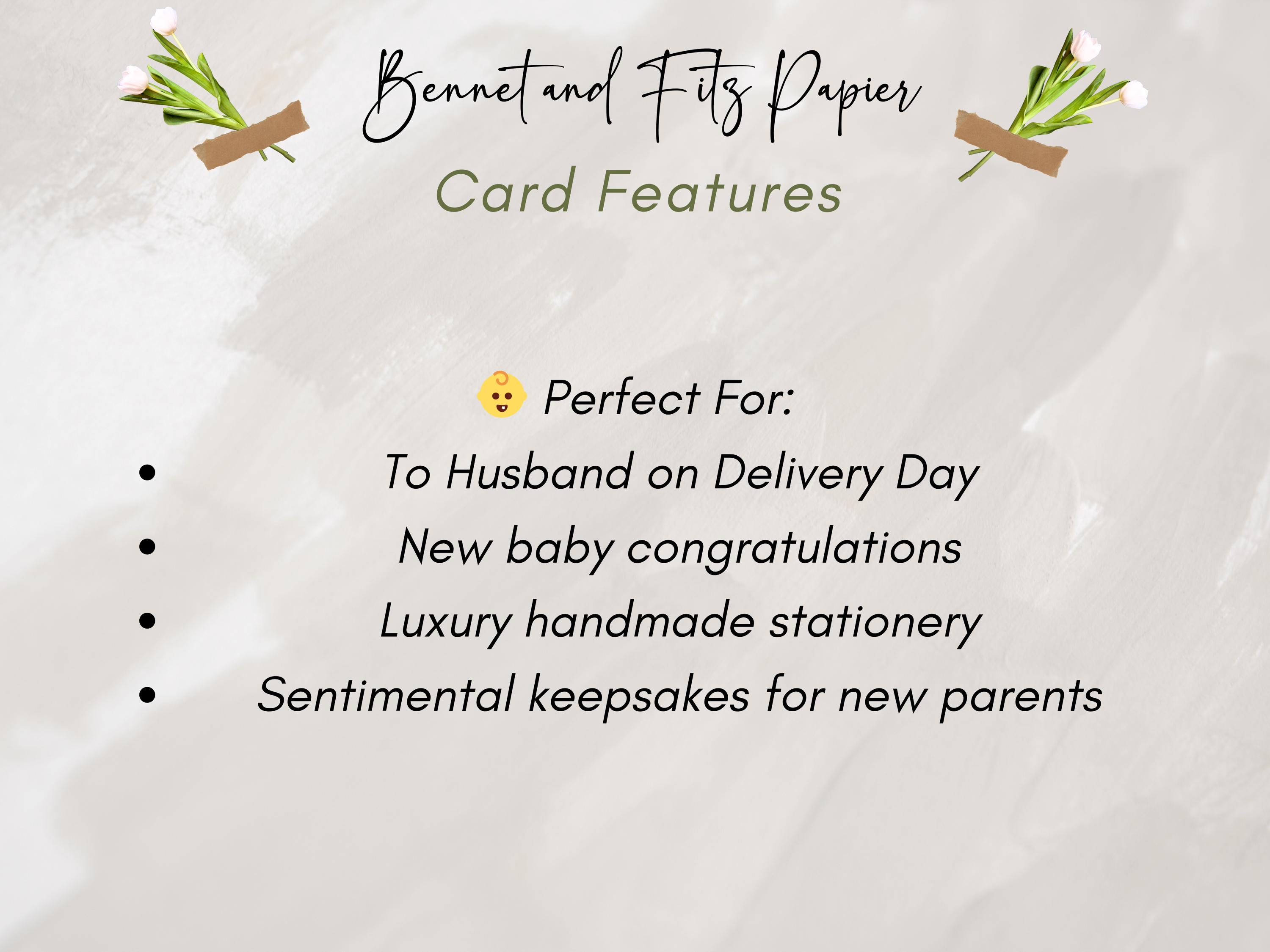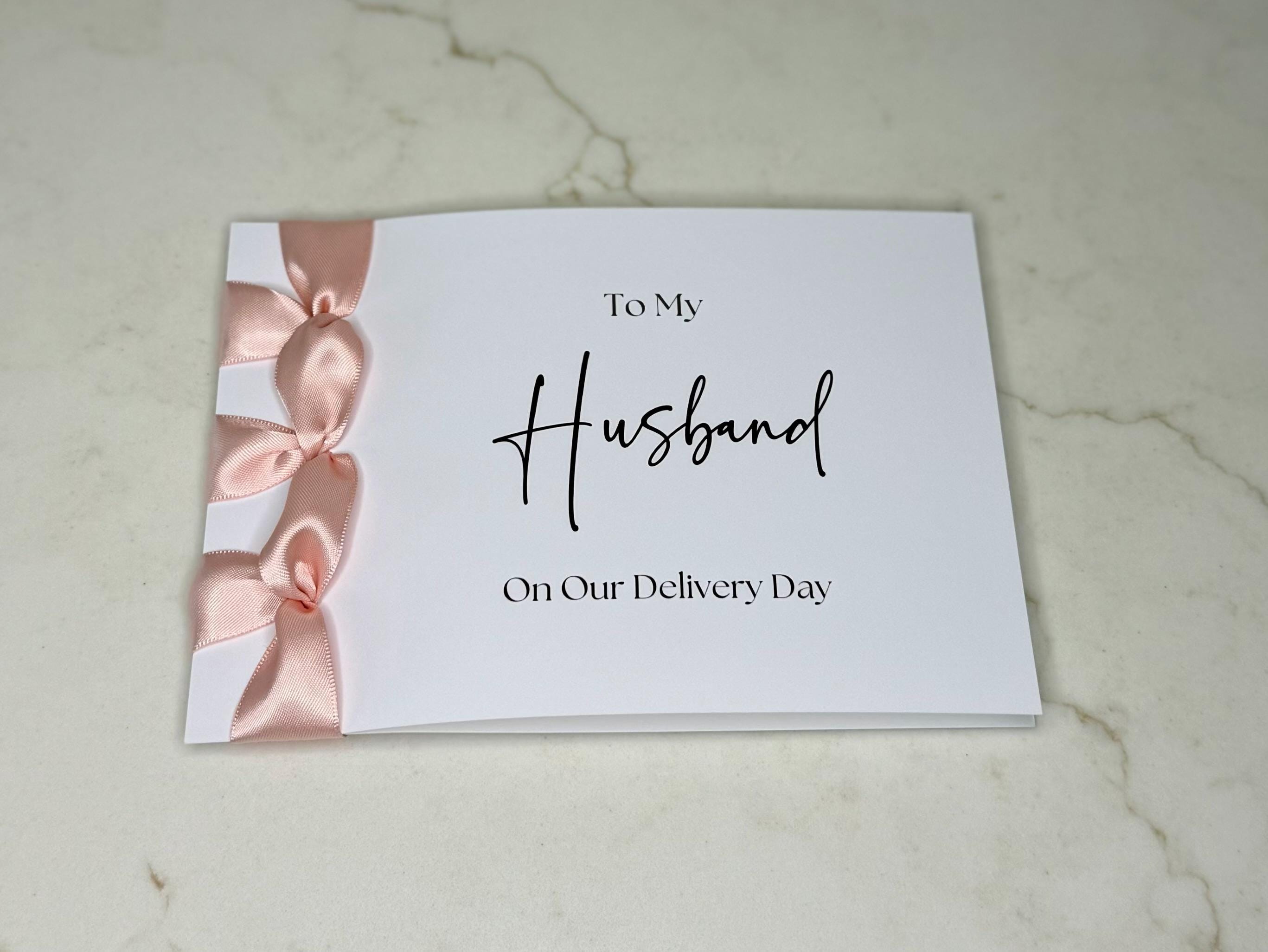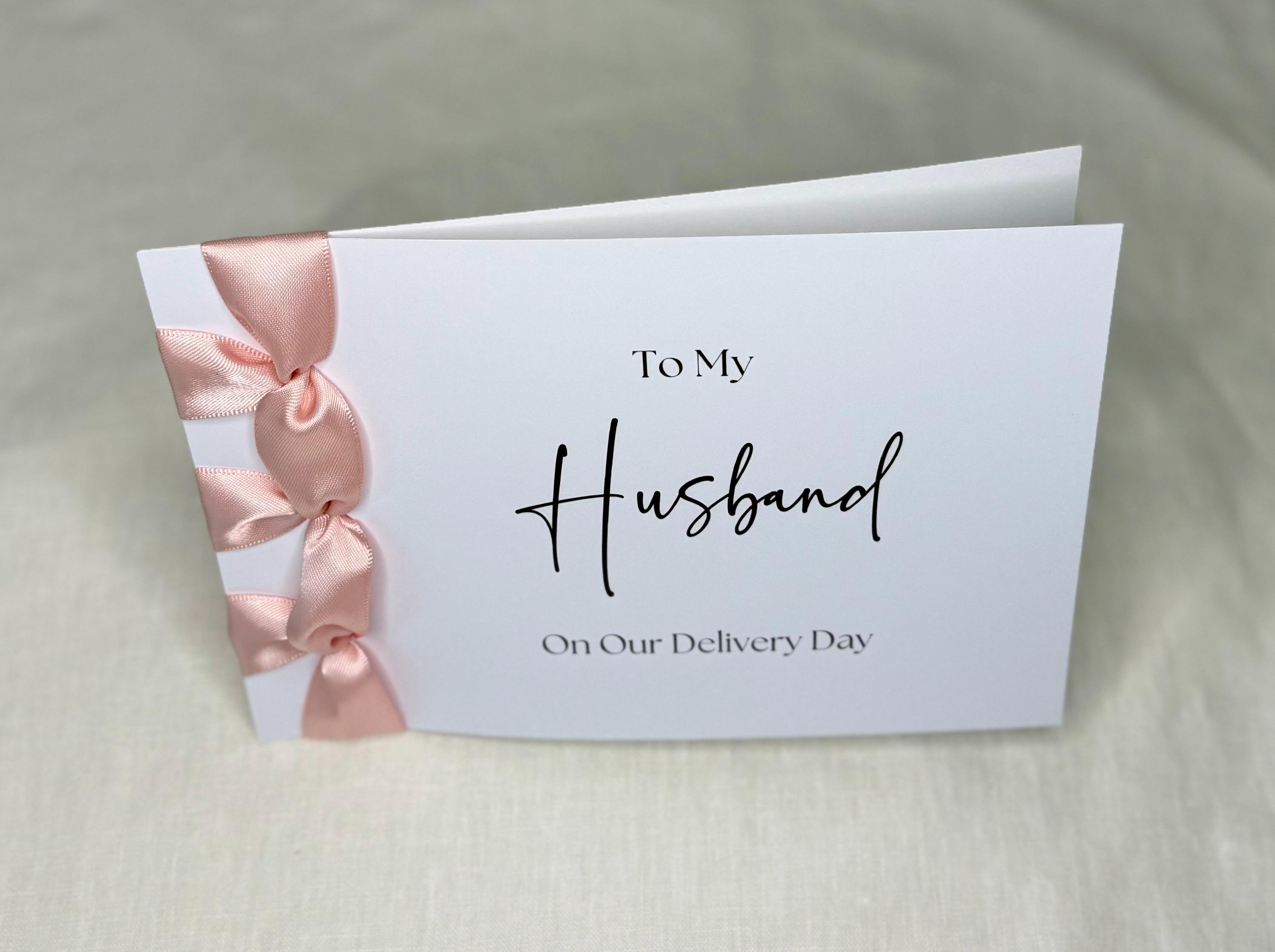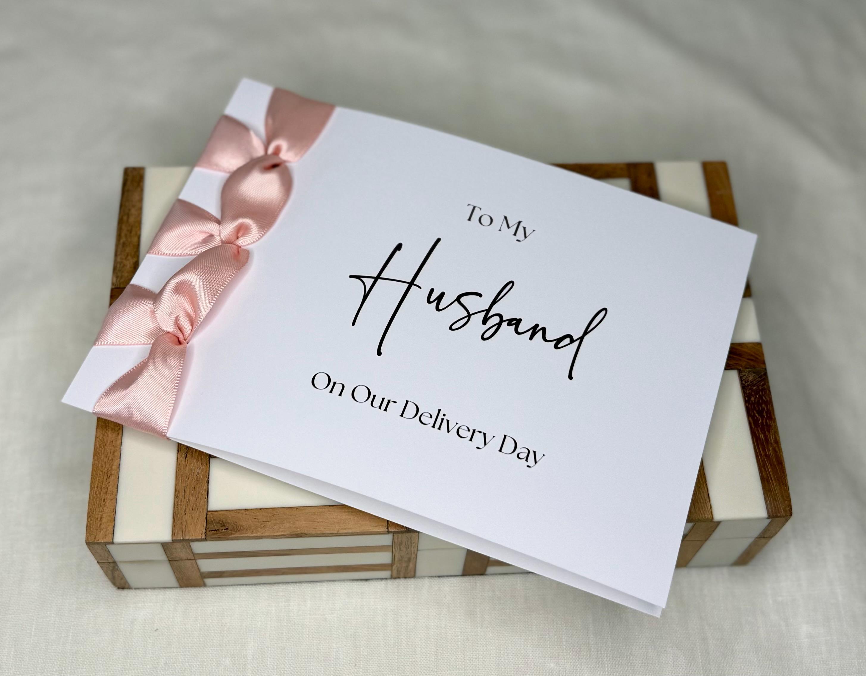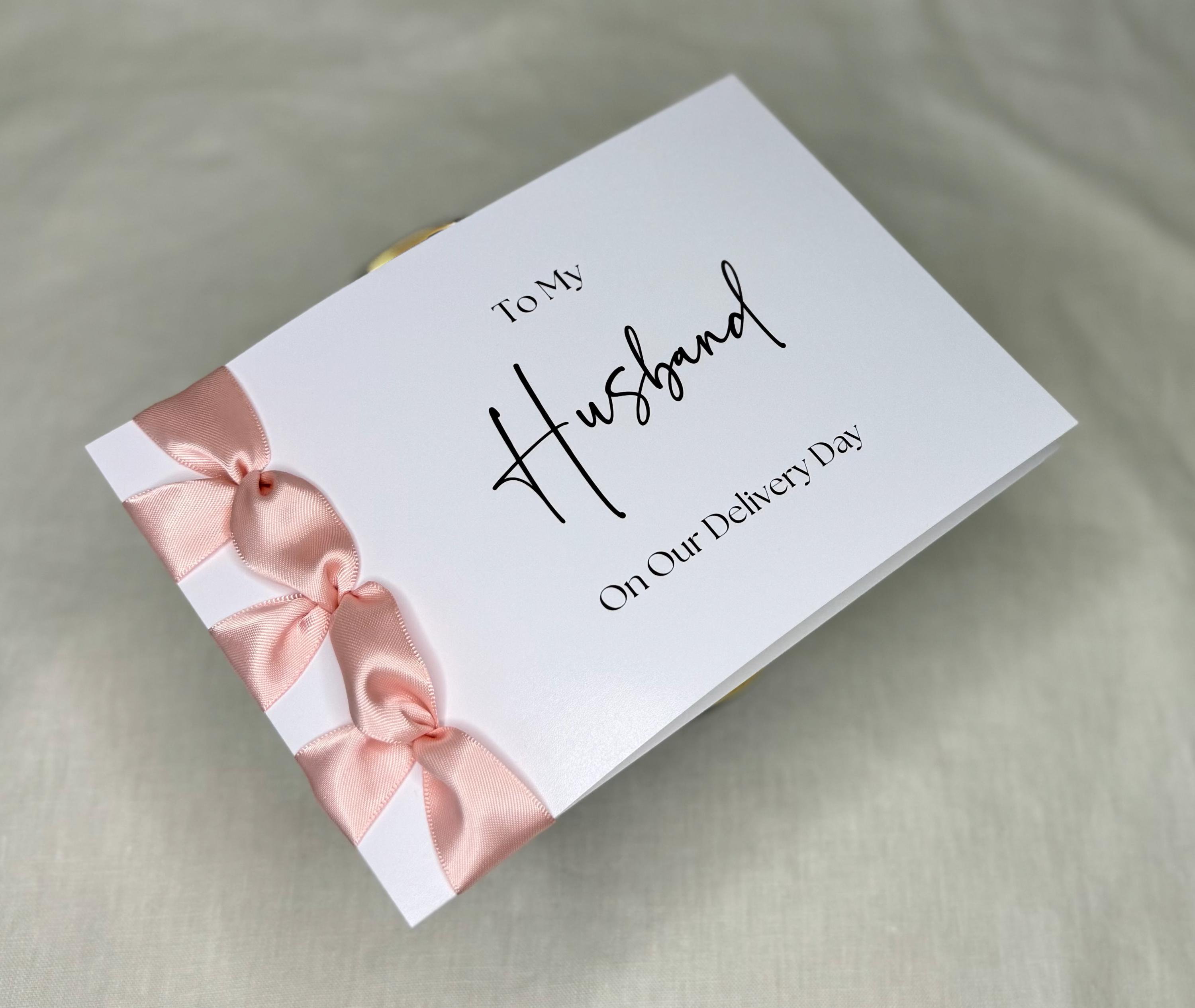 Celebrate this beautiful milestone with a handmade luxury card for your husband on delivery day, finished with a satin ribbon and personalized message — a heartfelt Congratulations on our new baby! keepsake he’ll cherish forever.