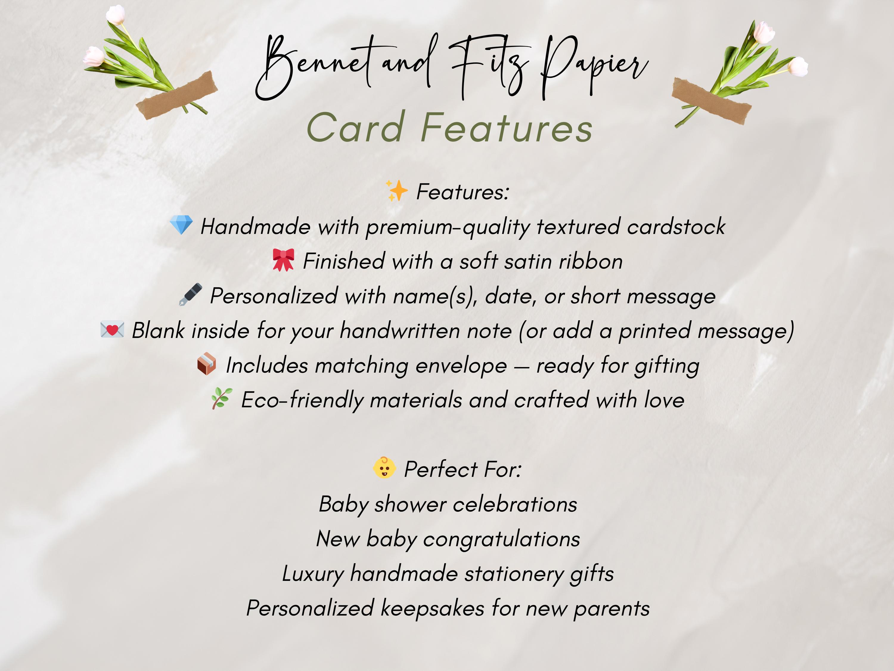 Each card is lovingly handmade using premium textured cardstock, adorned with a beautiful satin ribbon, and personalized with the baby’s name, parents’ names, or short message. Elegant yet sweet, it’s perfect for celebrating expecting parents, welcoming a newborn, or honoring the excitement of a baby shower.