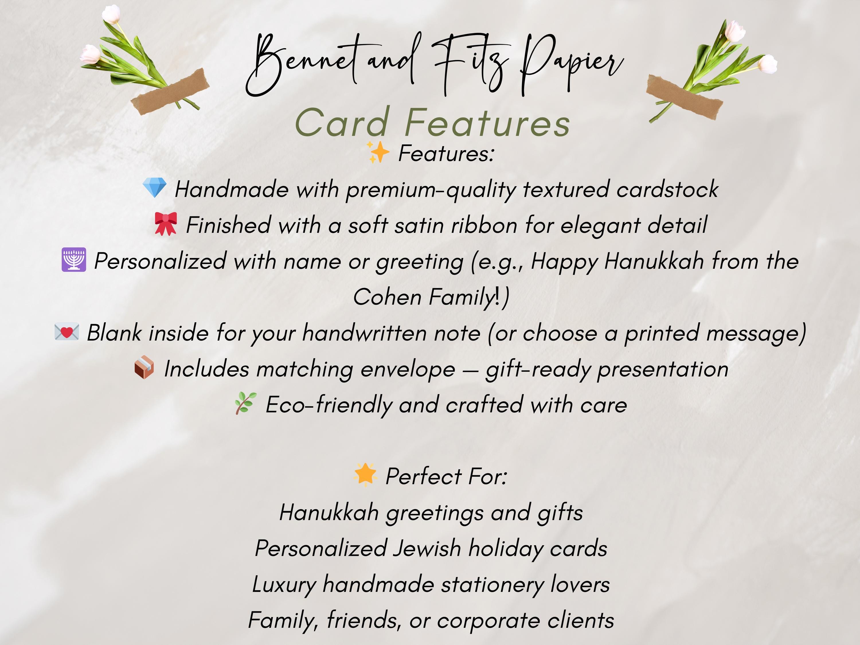 Each card is individually handmade using premium textured cardstock, adorned with a luxurious satin ribbon, and personalized with your name or family greeting for a thoughtful, one-of-a-kind design. Elegant, modern, and heartfelt — this luxury handmade card makes every Hanukkah message feel extra special.
