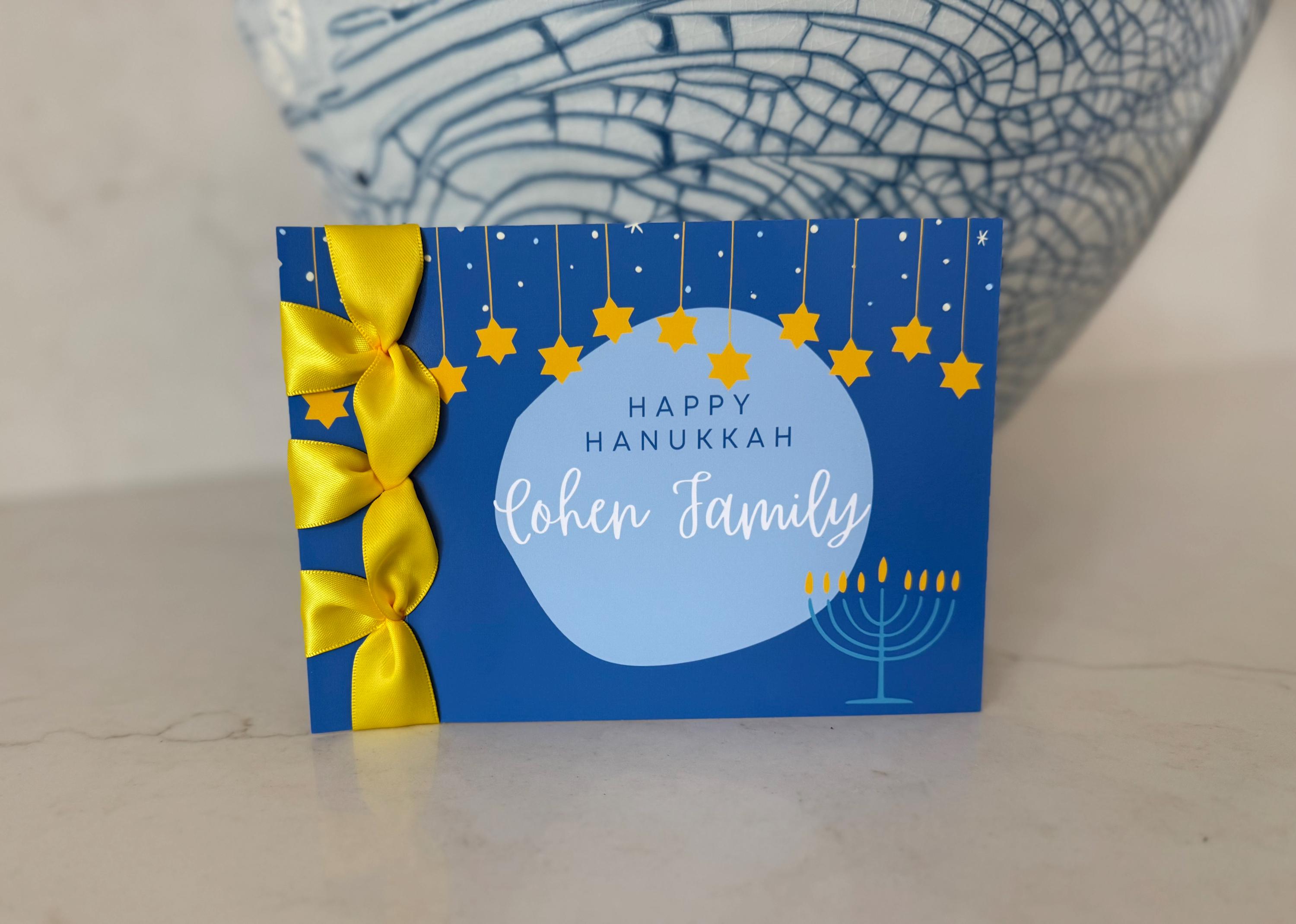 Celebrate the Festival of Lights with this handmade luxury Hanukkah card, personalized with a name and finished with a satin ribbon accent — a timeless keepsake that shines with joy and elegance.