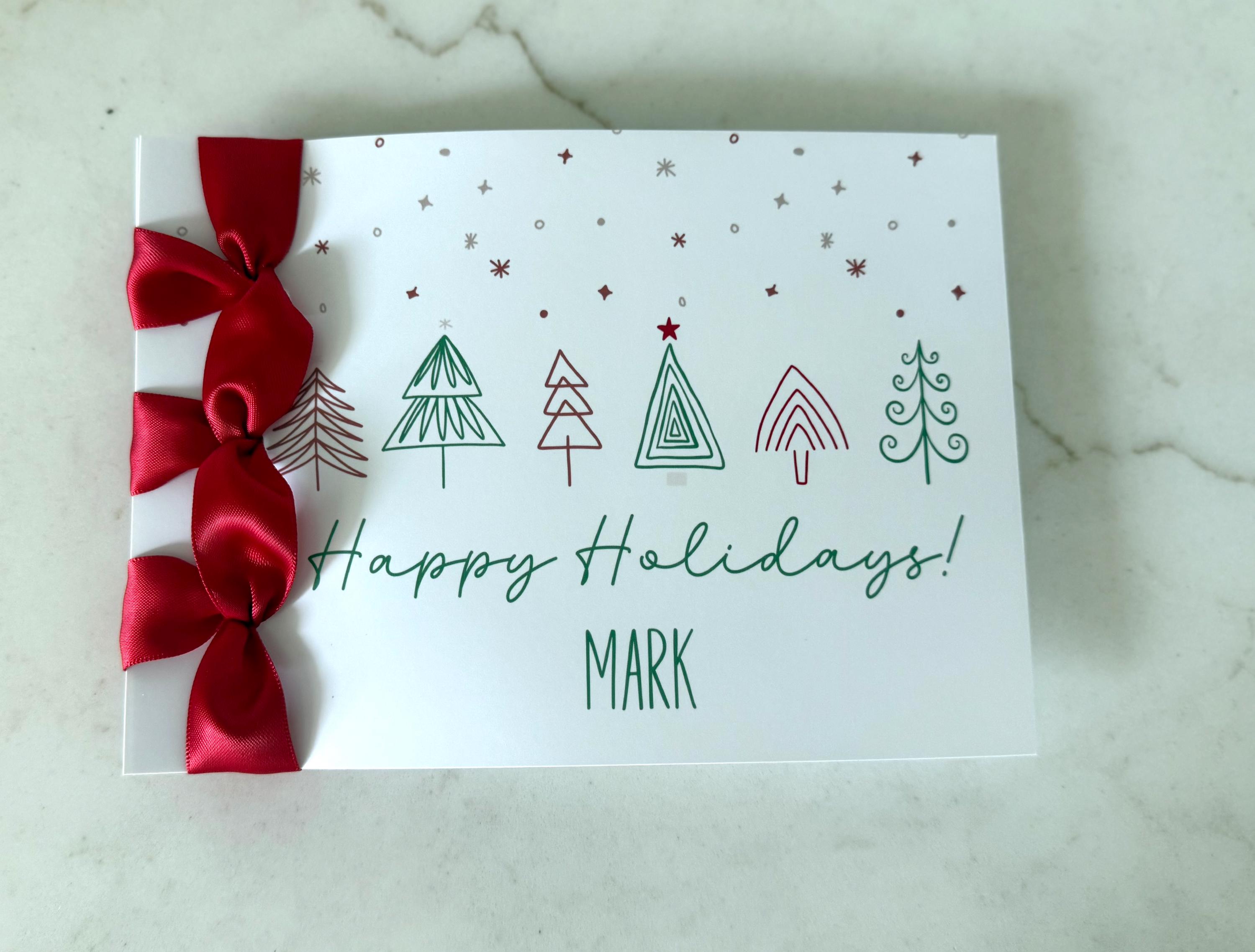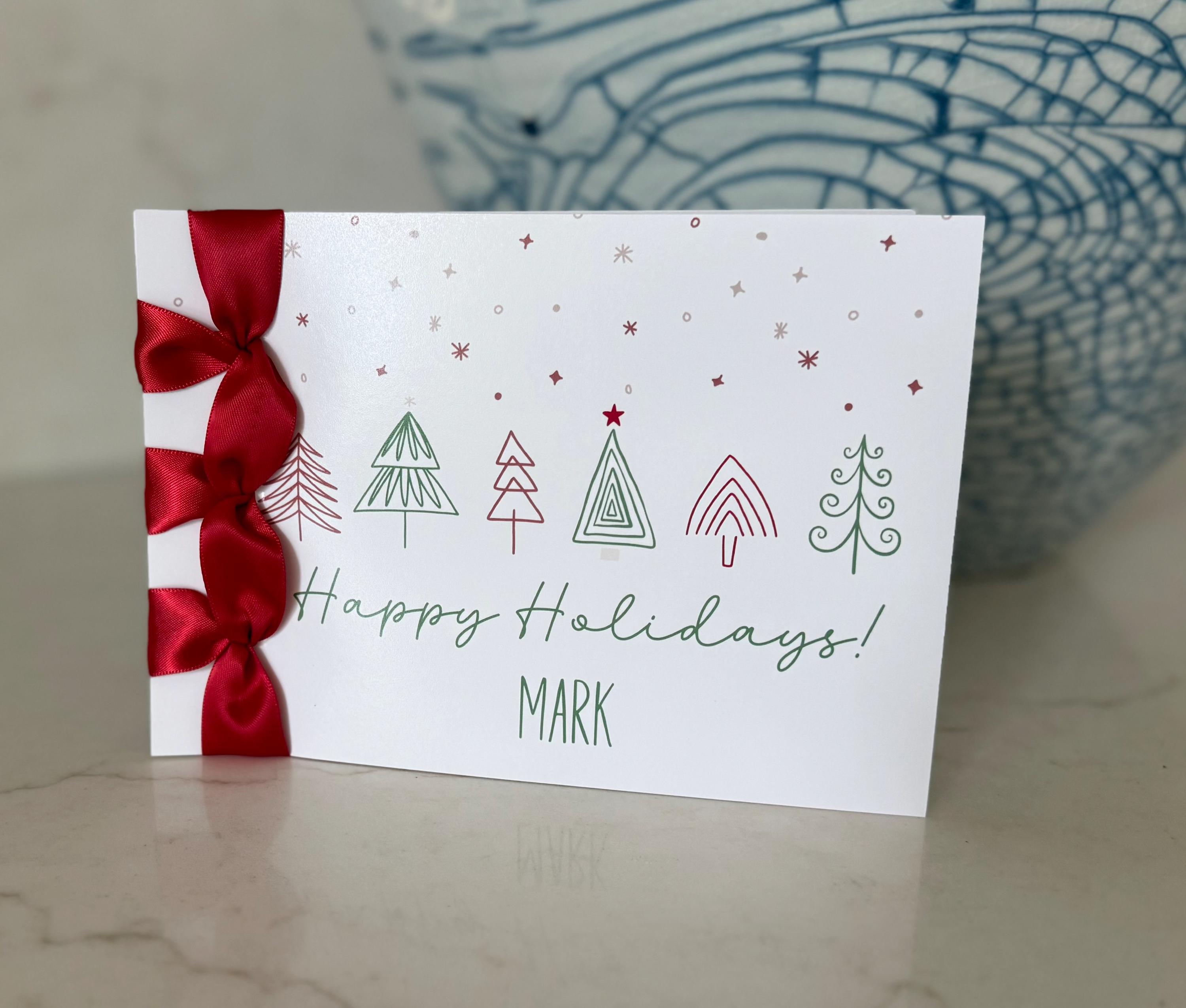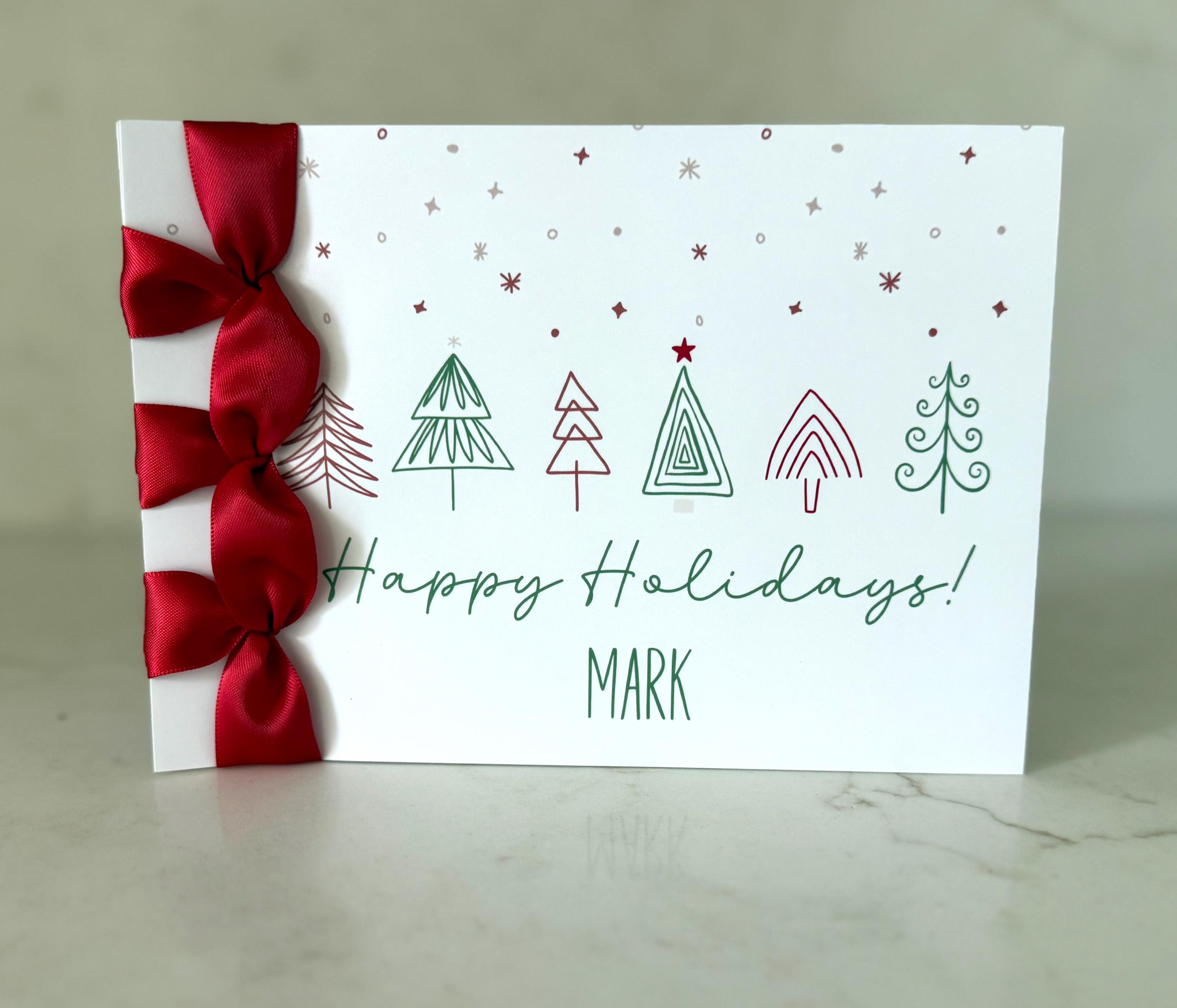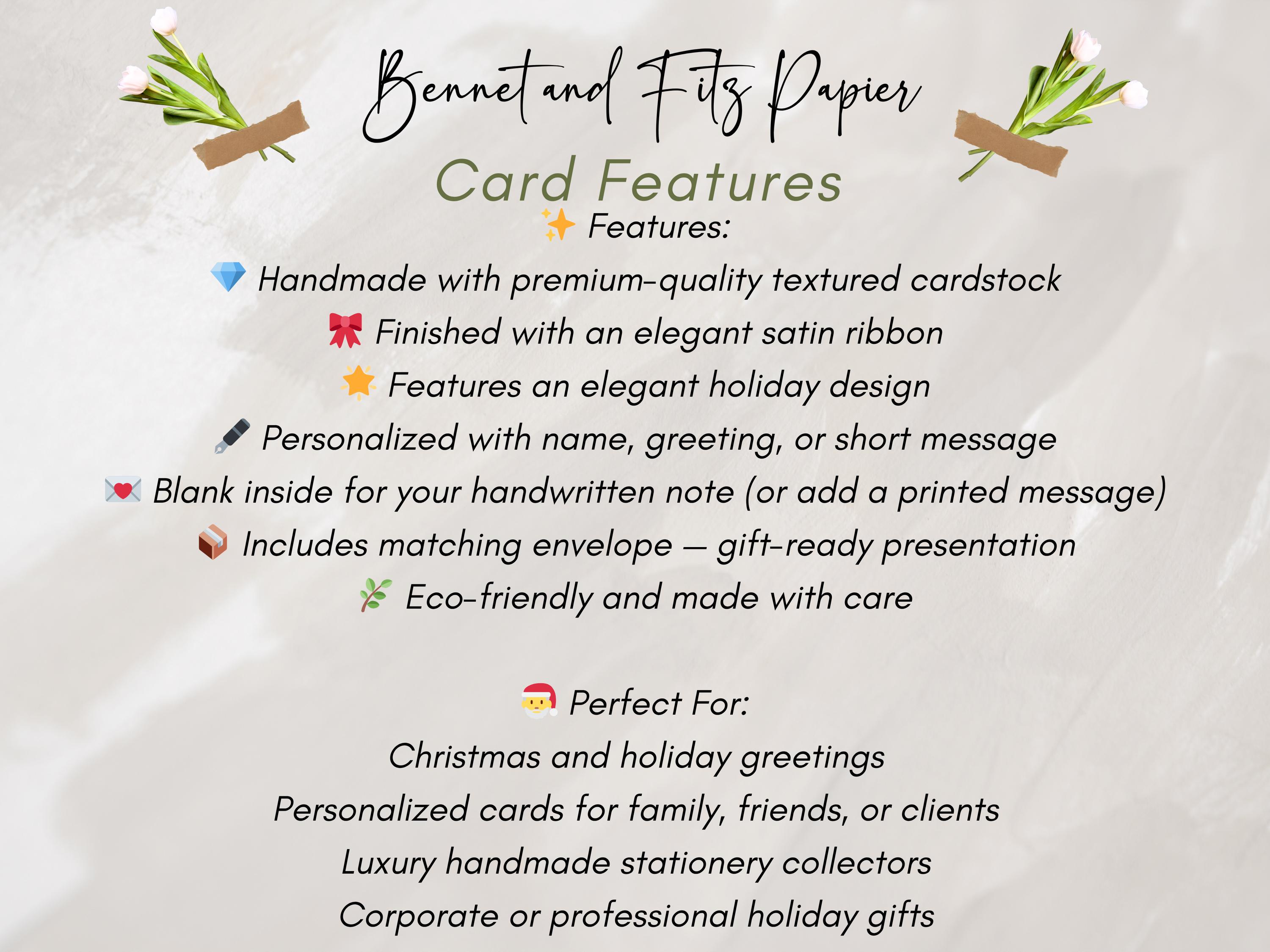 Each card is handmade with care using premium textured cardstock, accented with a beautiful satin ribbon, and designed with elegant holiday details for a refined, timeless look. Personalize it with your name, greeting, or family message to create a truly unique card that stands out under the tree.