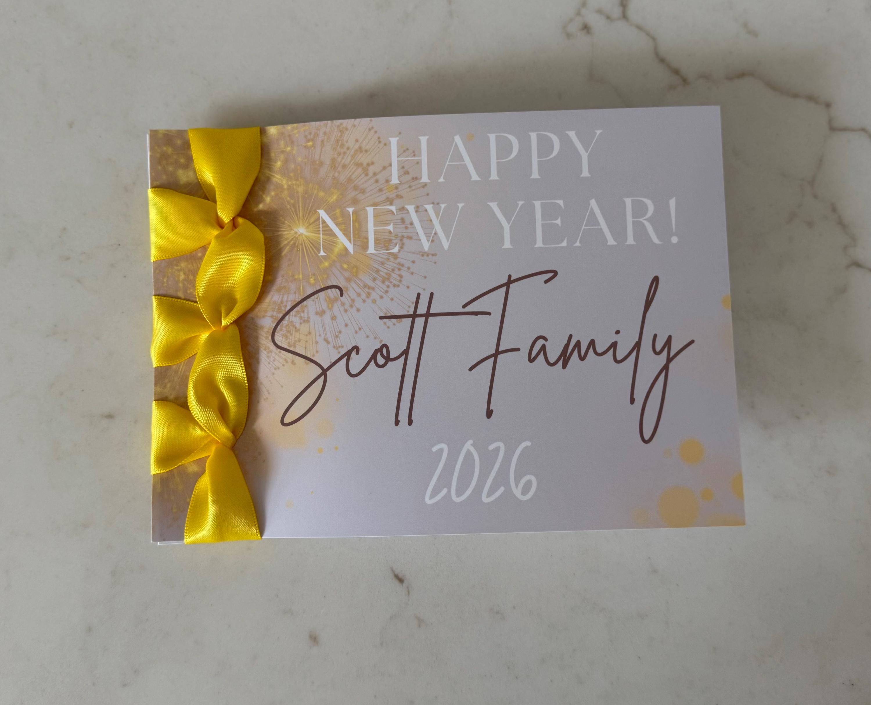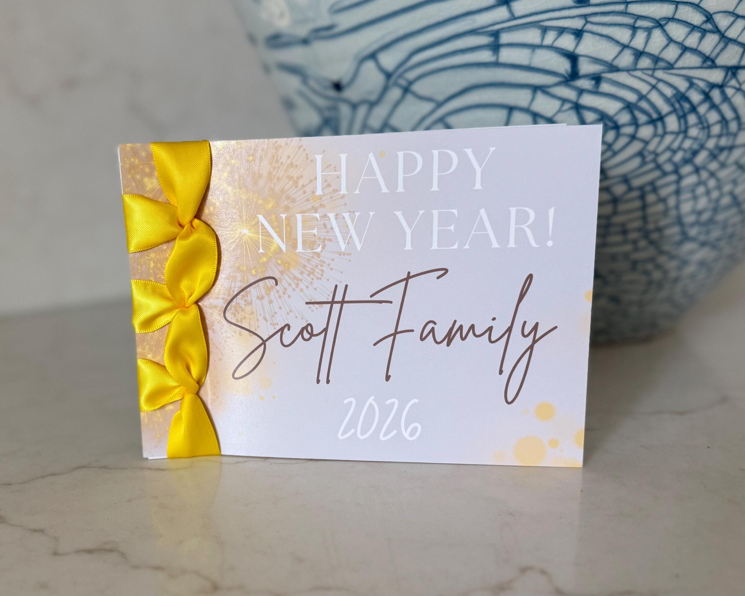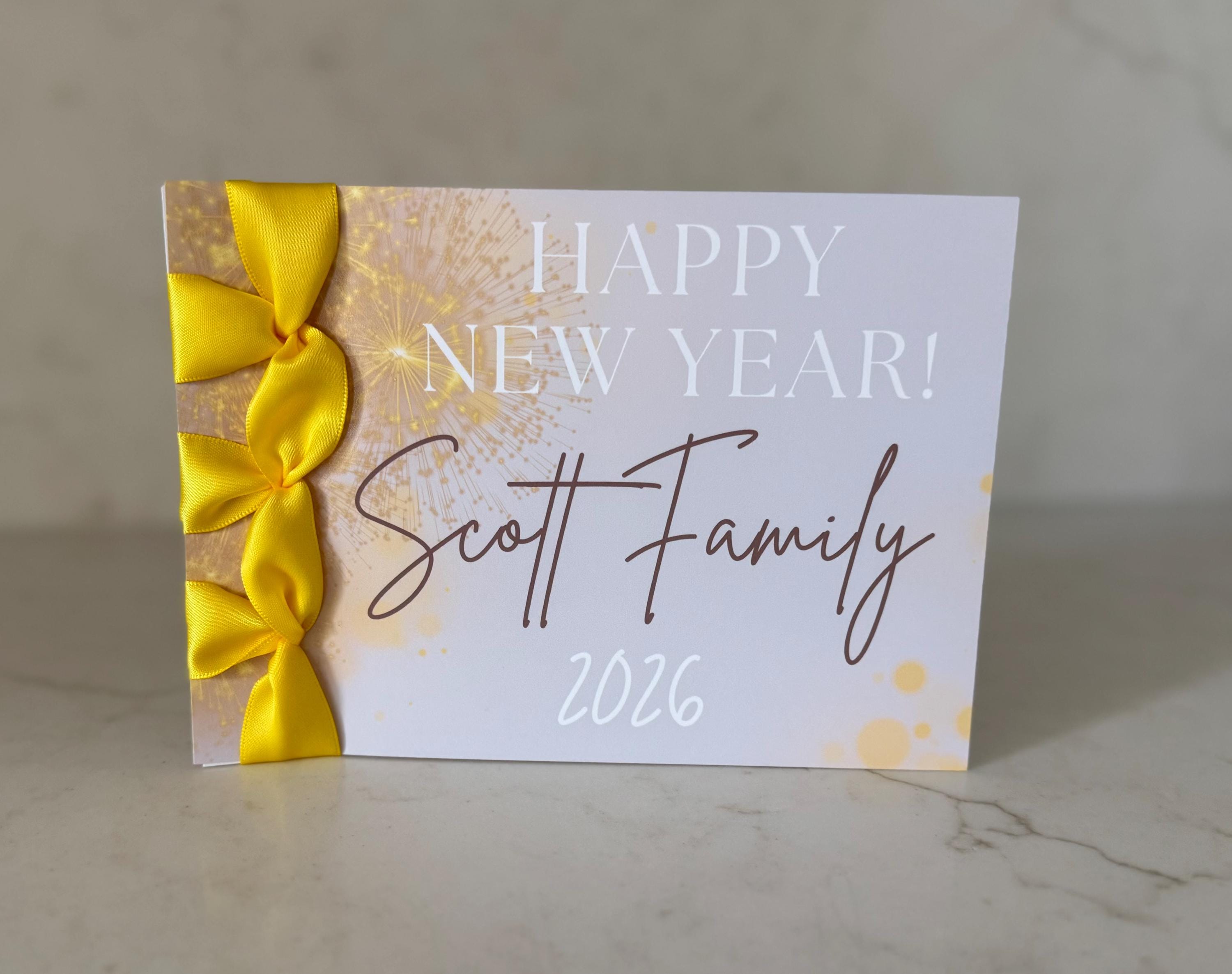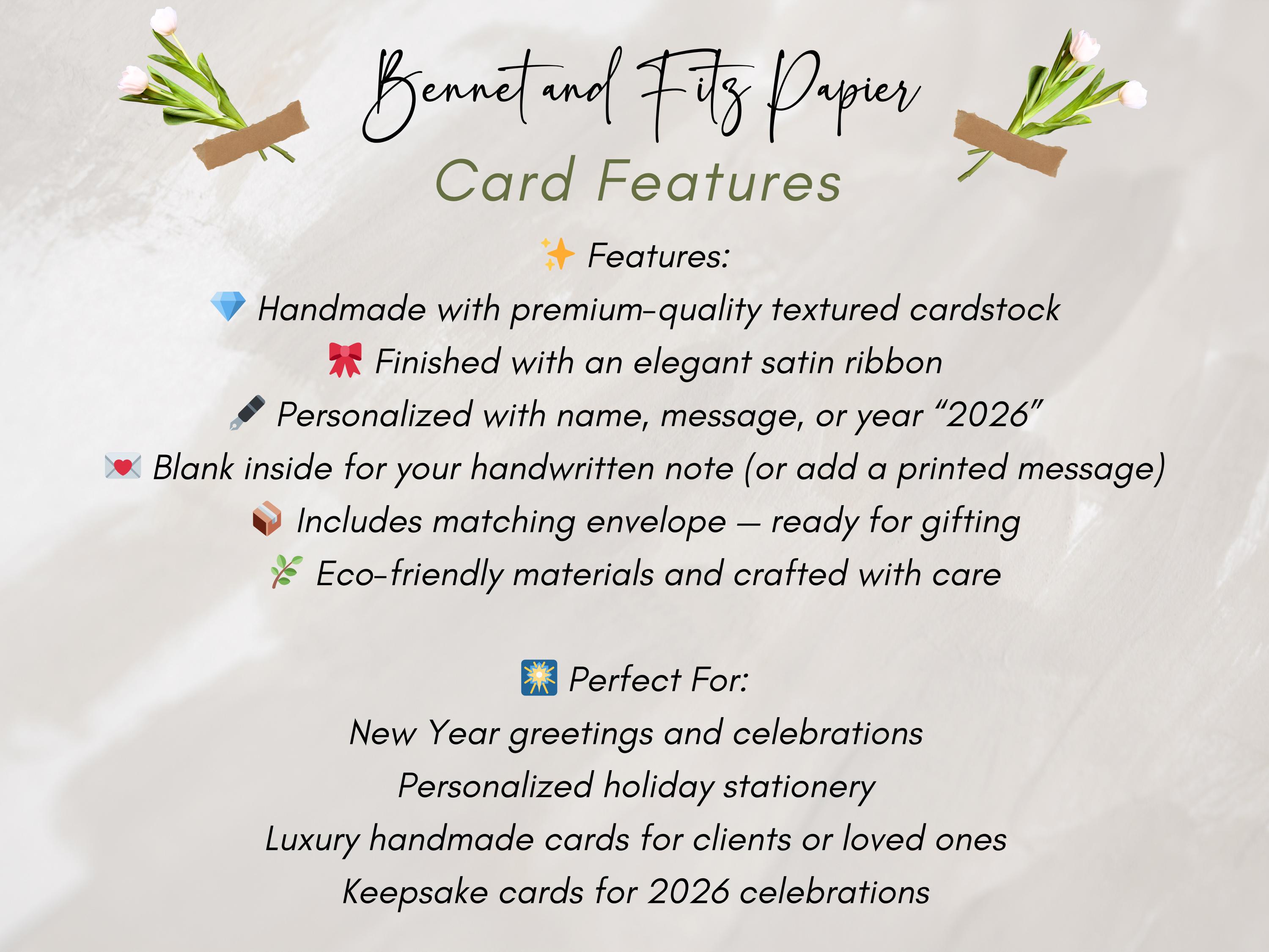 YWelcome 2026 in style with this handmade luxury New Year card, featuring a satin ribbon accent and personalized details — a timeless keepsake to celebrate fresh beginnings.