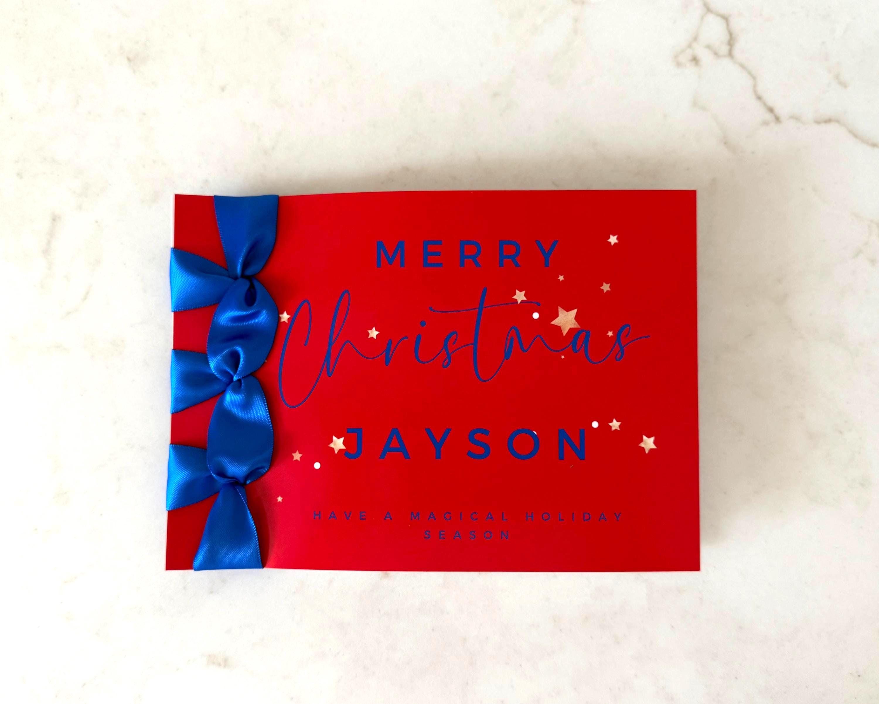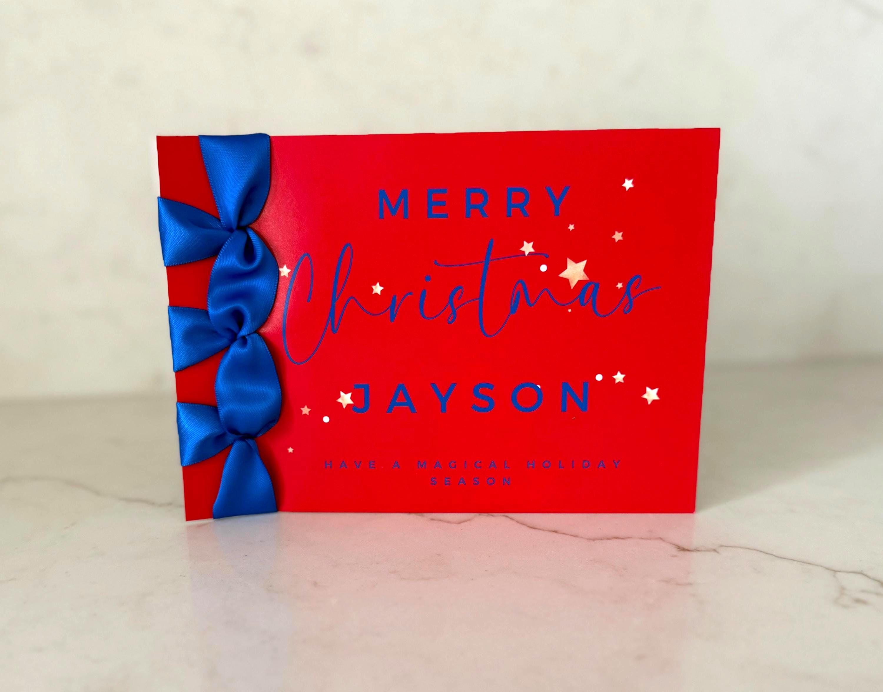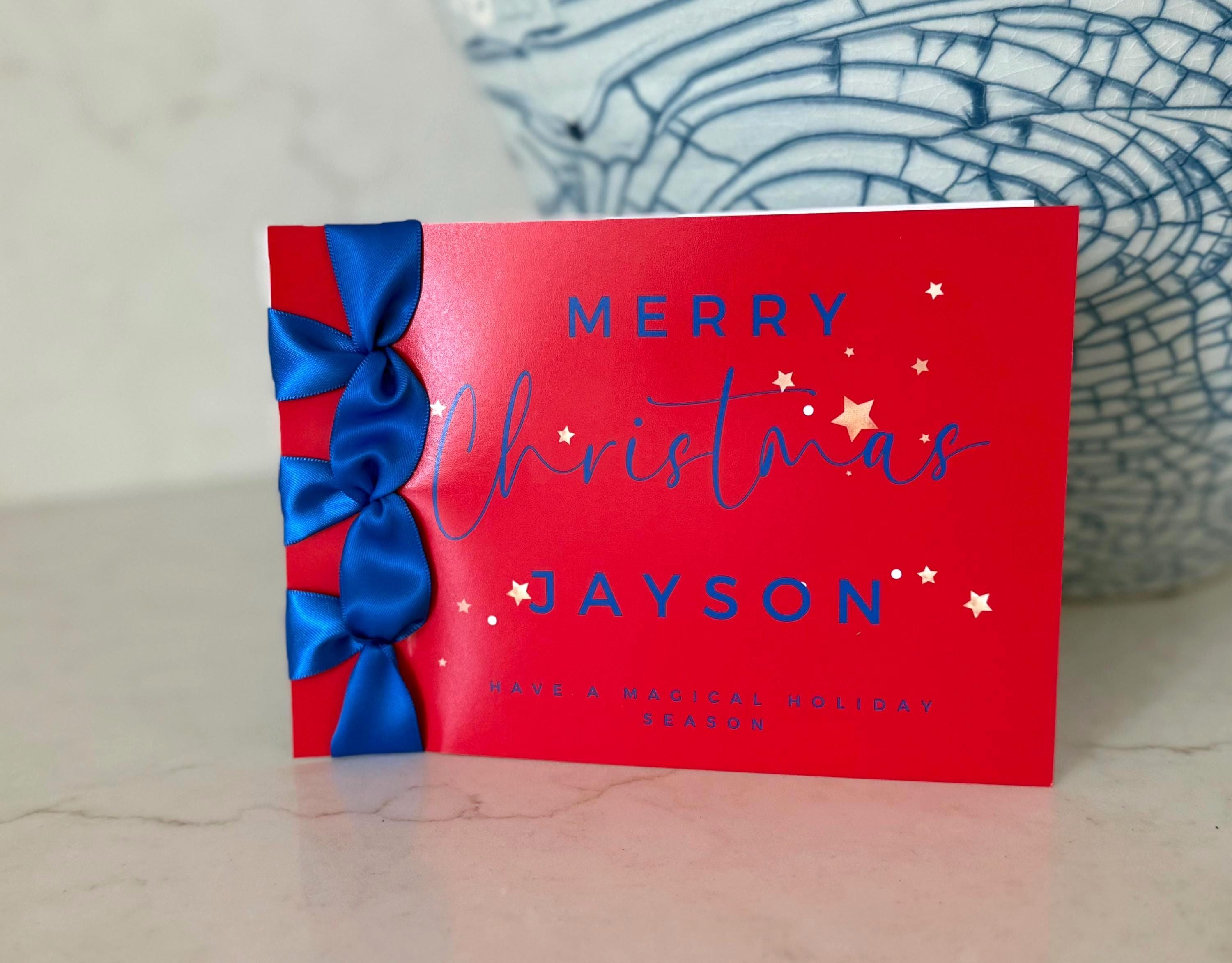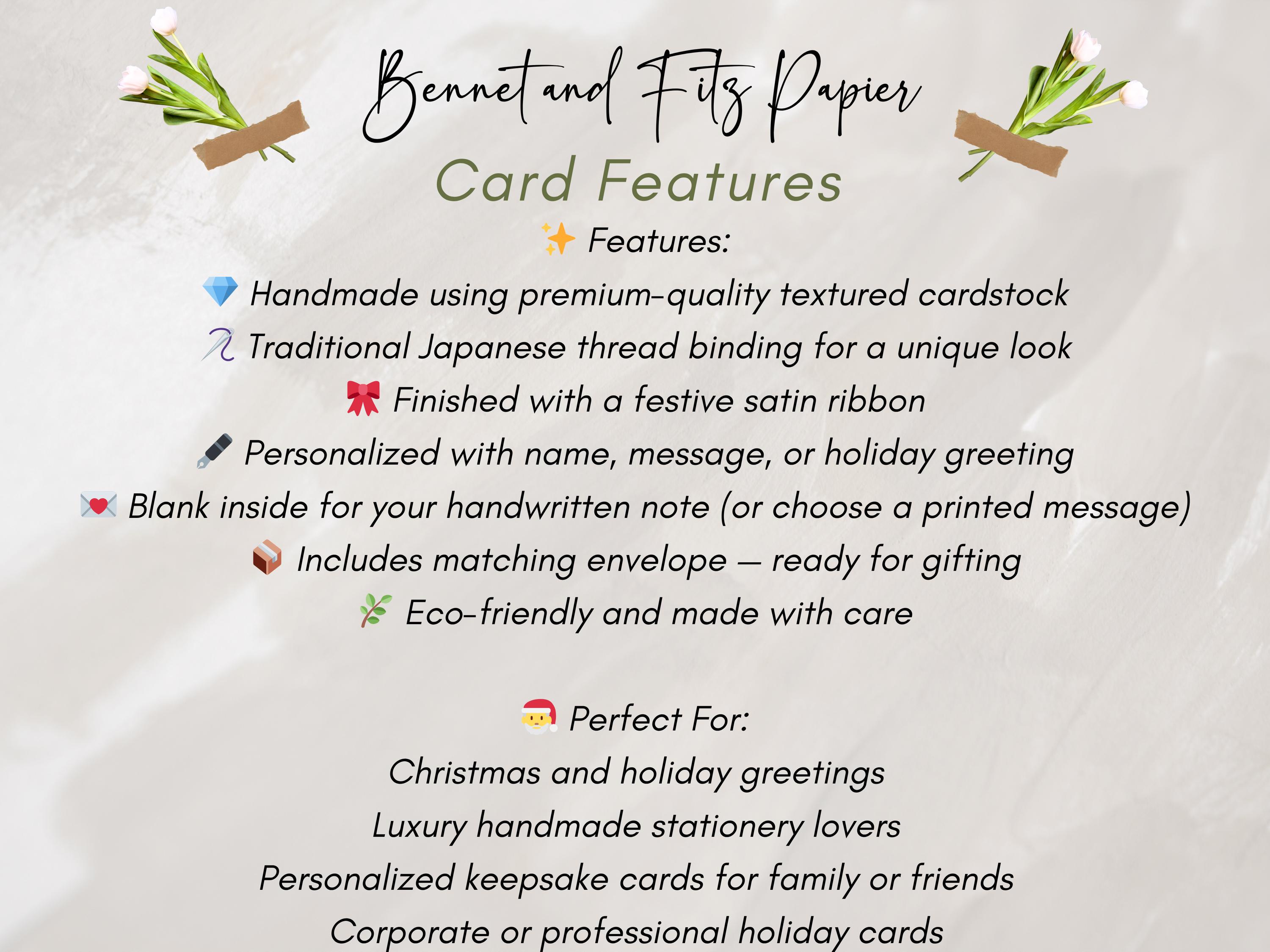 Send joy and elegance this season with this handmade Christmas card, featuring Japanese binding, a satin ribbon accent, and your personalized name — a luxury keepsake for the holidays.