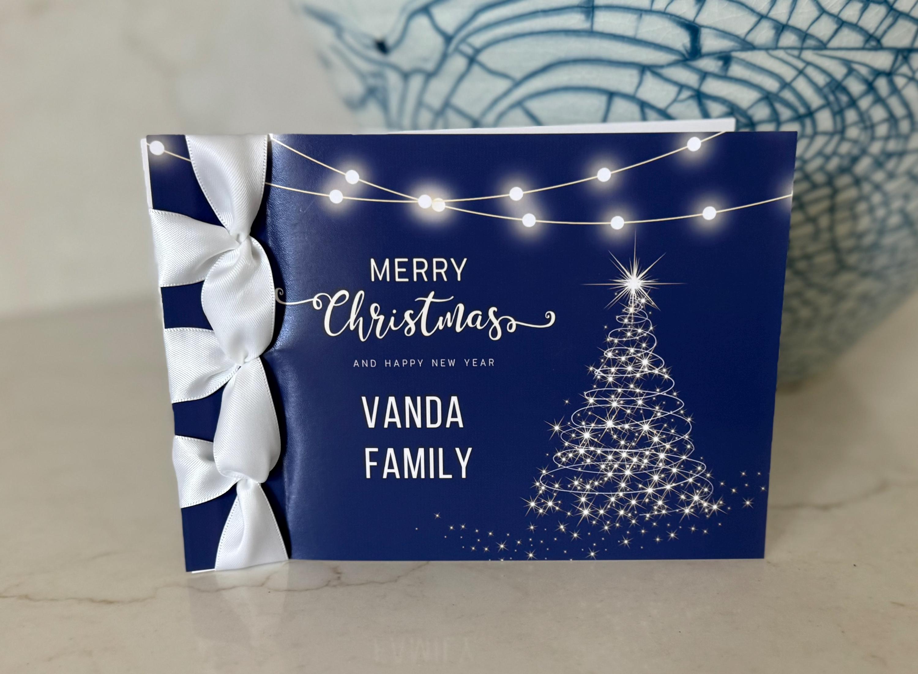 handmade christmas card, personalized christmas card, japanese binding card, satin ribbon card, luxury holiday greeting card, handmade holiday card, elegant christmas card, custom handmade card, christmas stationery gift, festive handmade card, holiday keepsake card, unique christmas card, luxury handmade card, christmas card for family, christmas card for clients