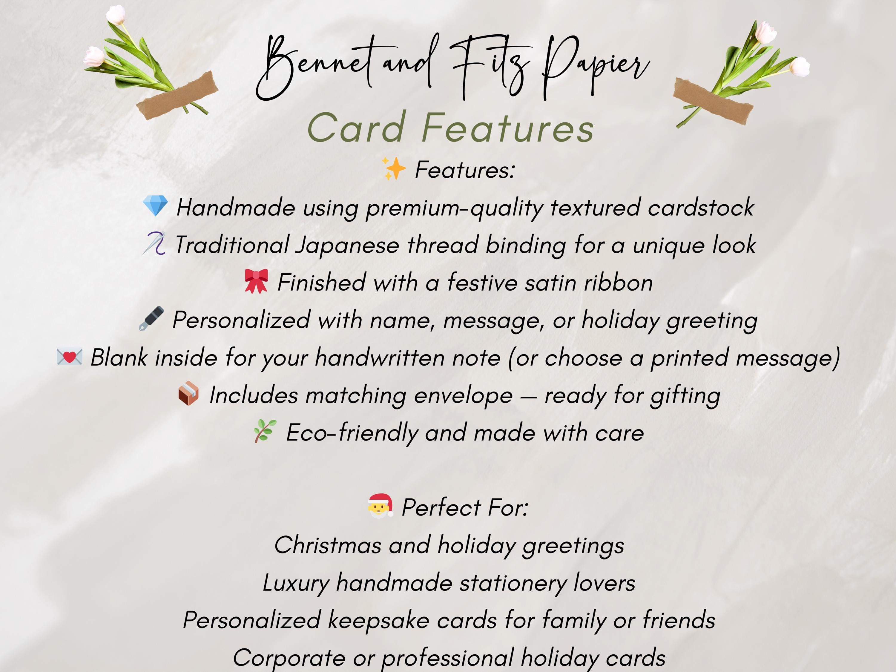 Each card is lovingly handmade using premium textured cardstock, bound with the traditional Japanese binding technique, and finished with a beautiful satin ribbon for a sophisticated touch. Personalize it with a name, family greeting, or holiday message to make it truly one-of-a-kind.