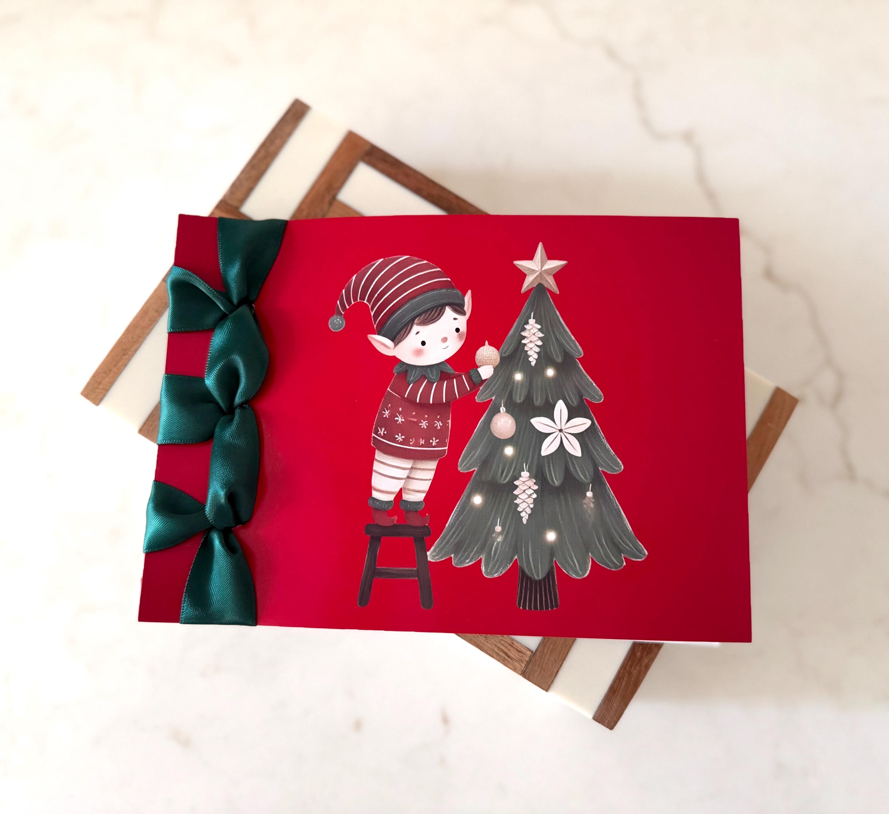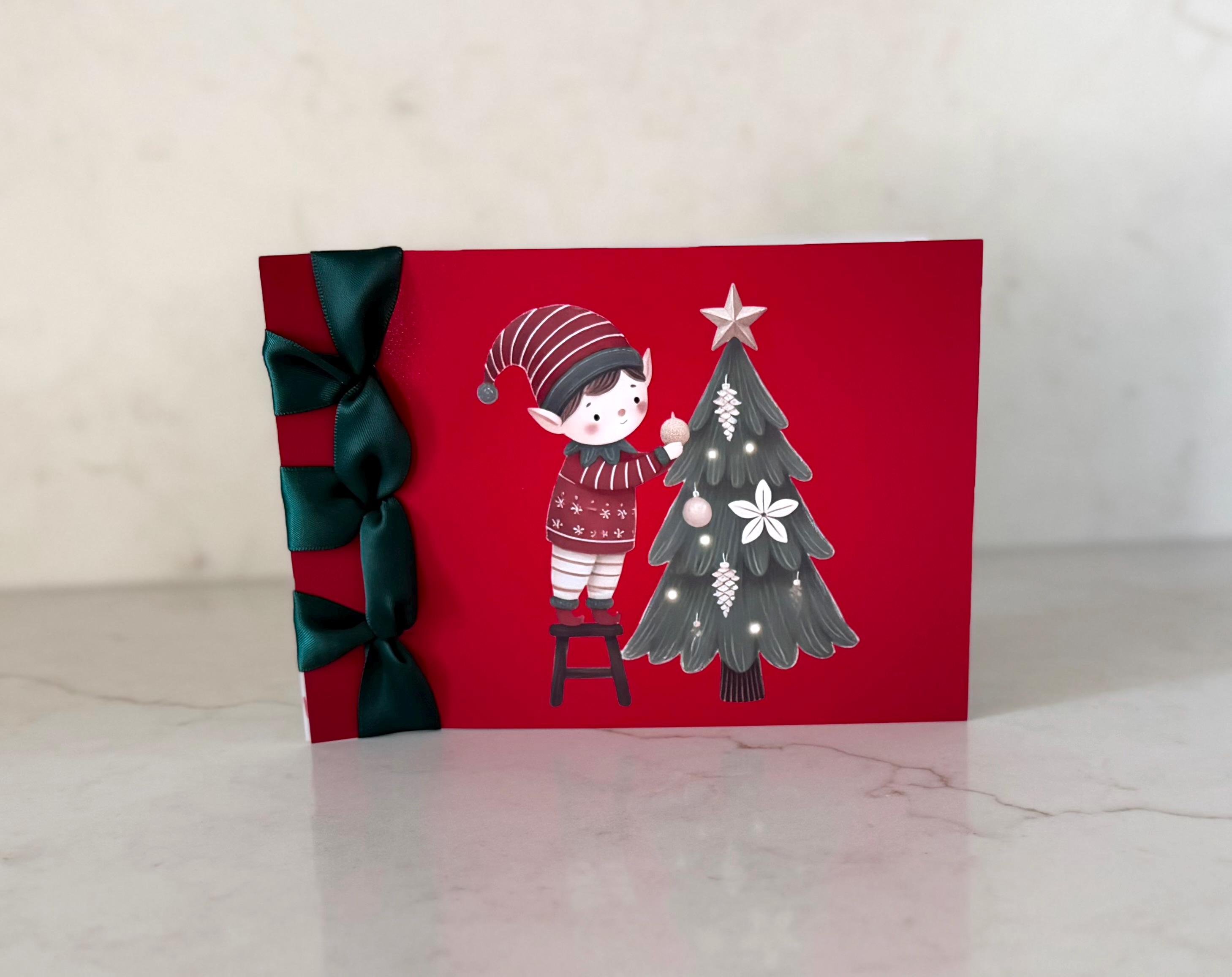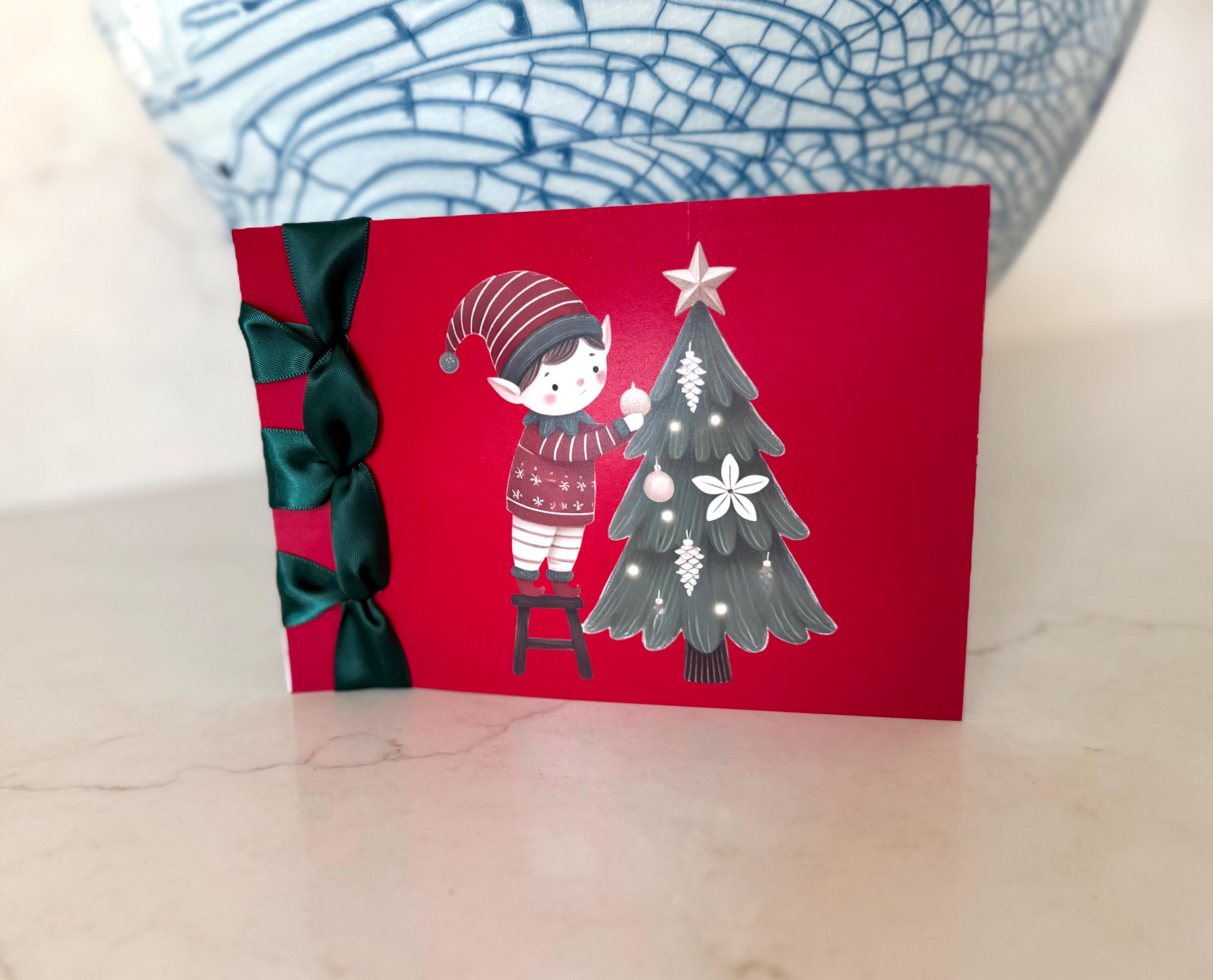 Celebrate the season with this handmade luxury Christmas card, featuring a charming elf and Christmas tree design and finished with a satin ribbon — a heartfelt Happy Holidays keepsake that can be personalized just for you.