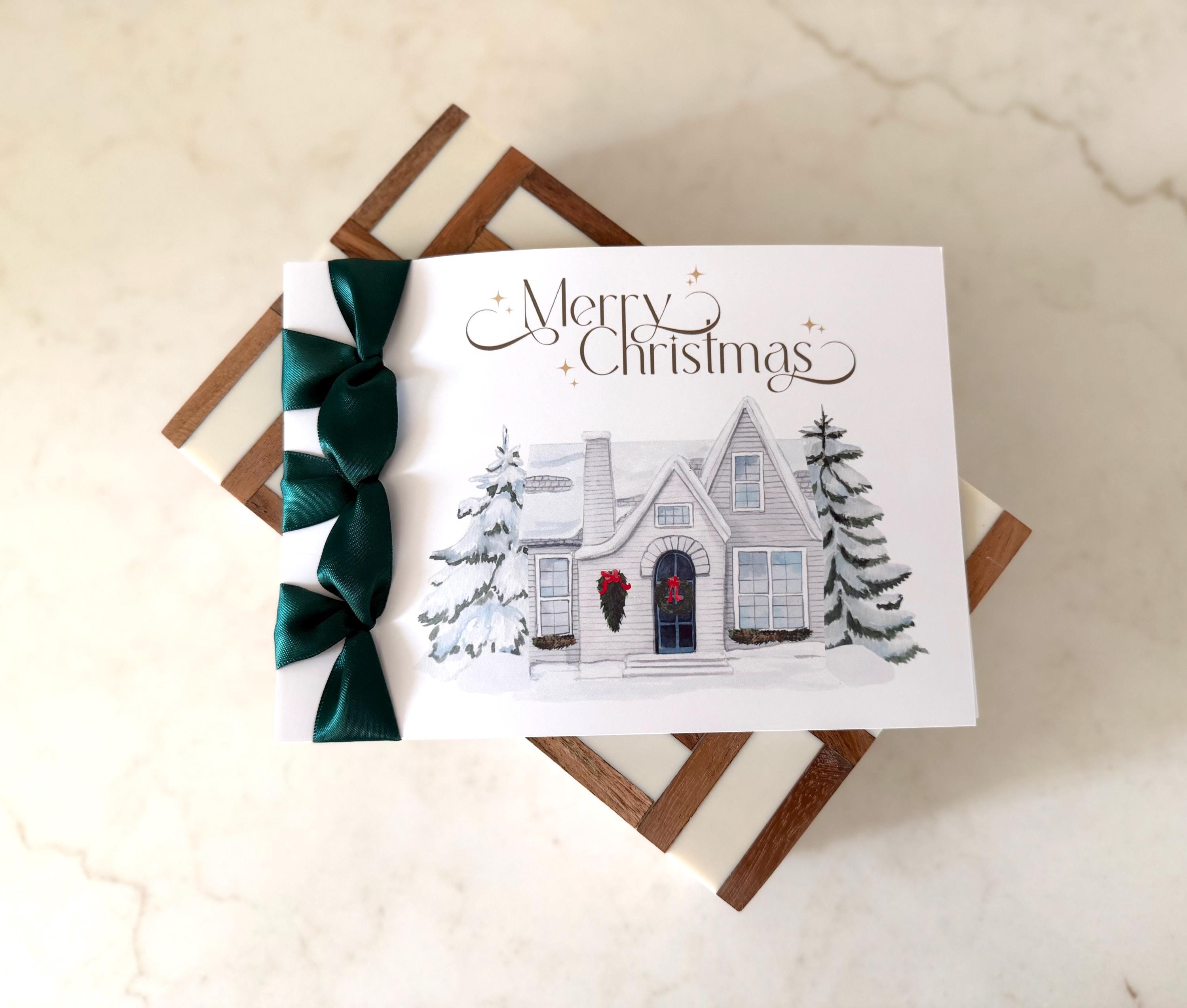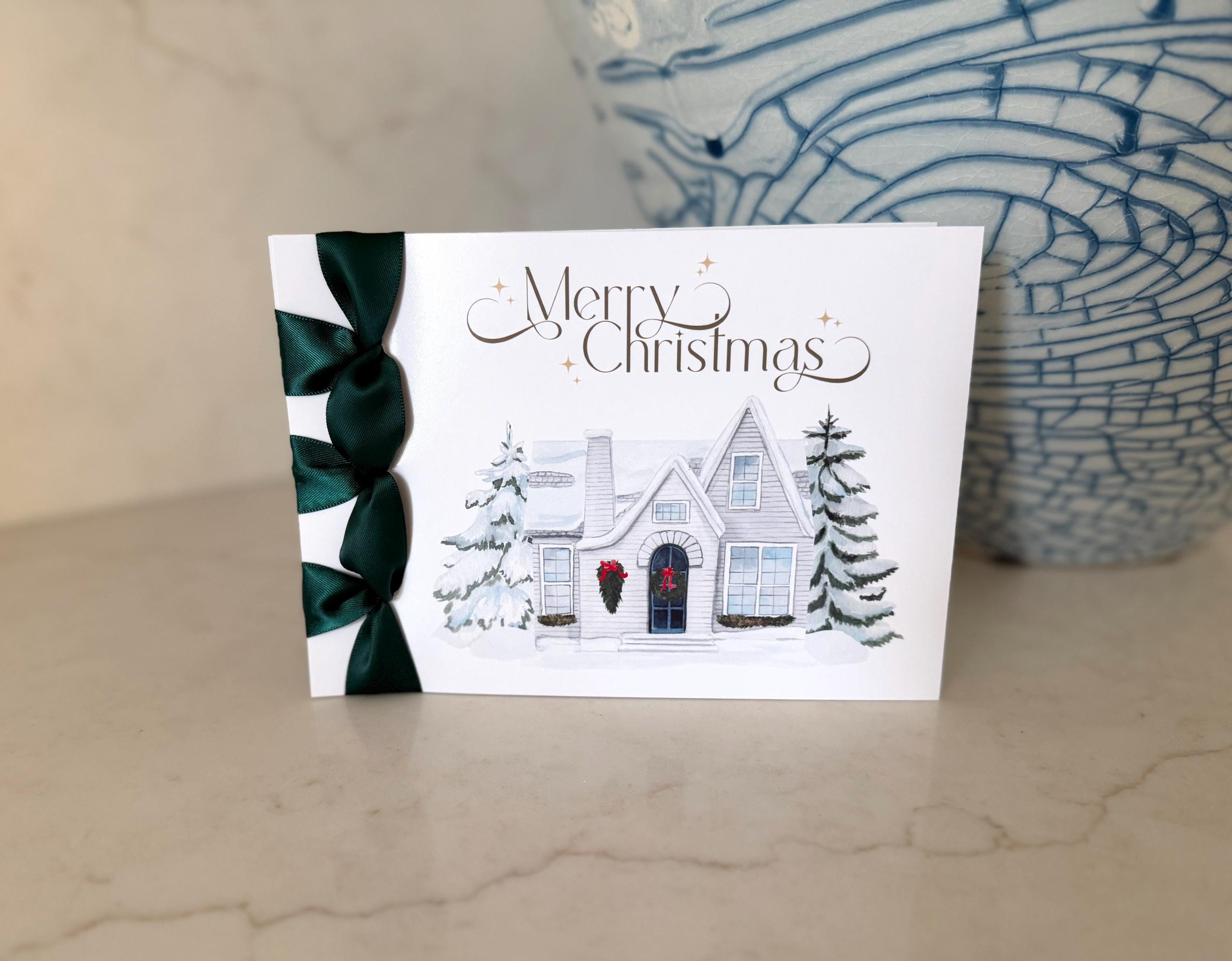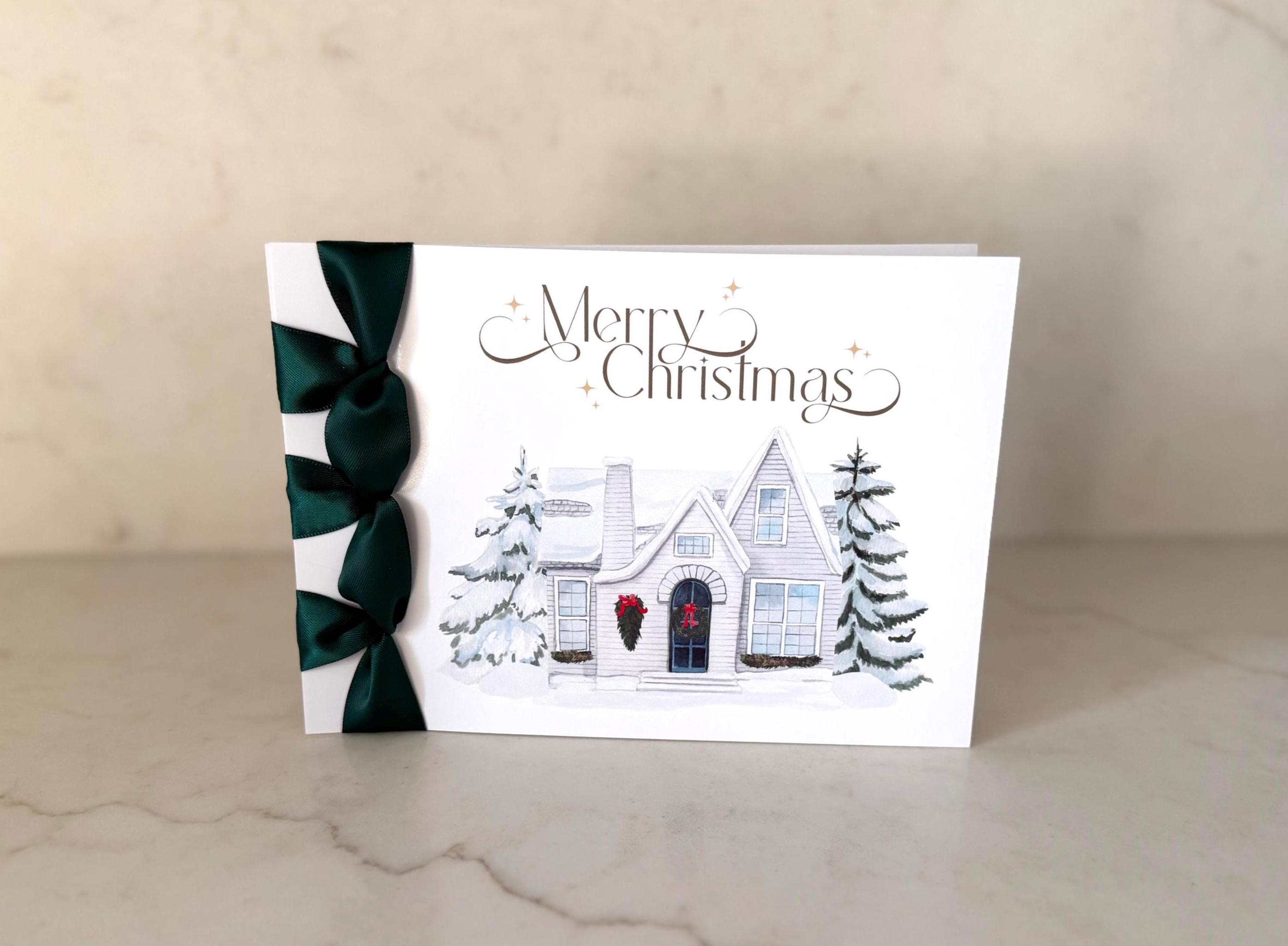 Send warmth and joy this season with this handmade luxury Christmas card, featuring a cozy home in the snow design and elegant satin ribbon finish — a heartfelt Happy Holidays keepsake that can be personalized just for you.