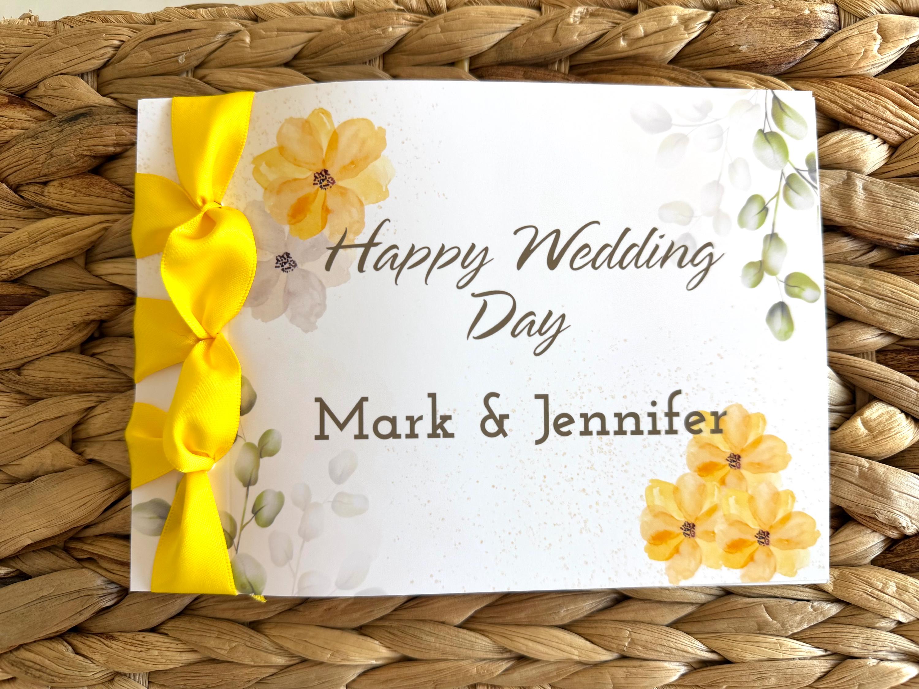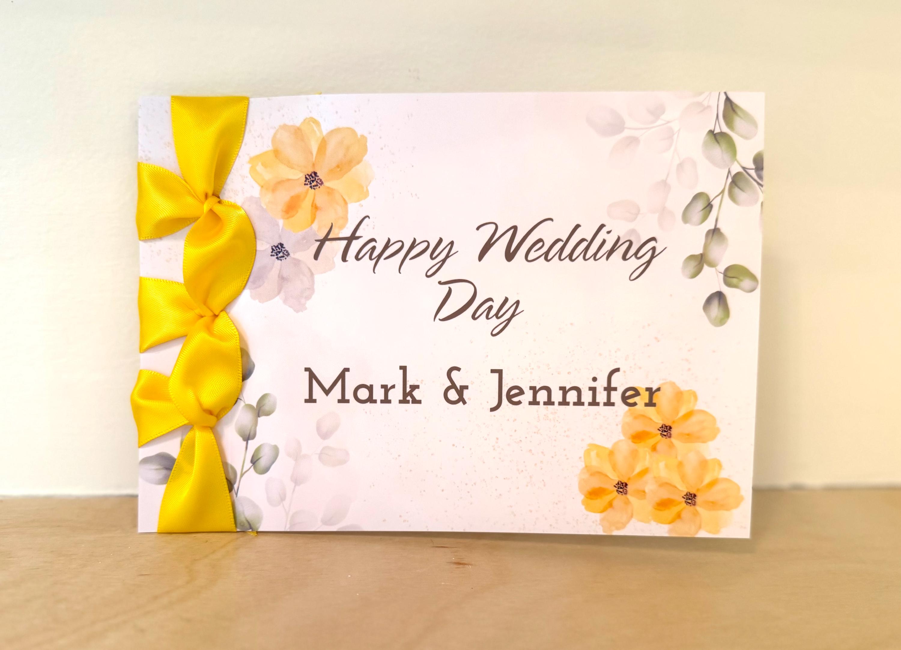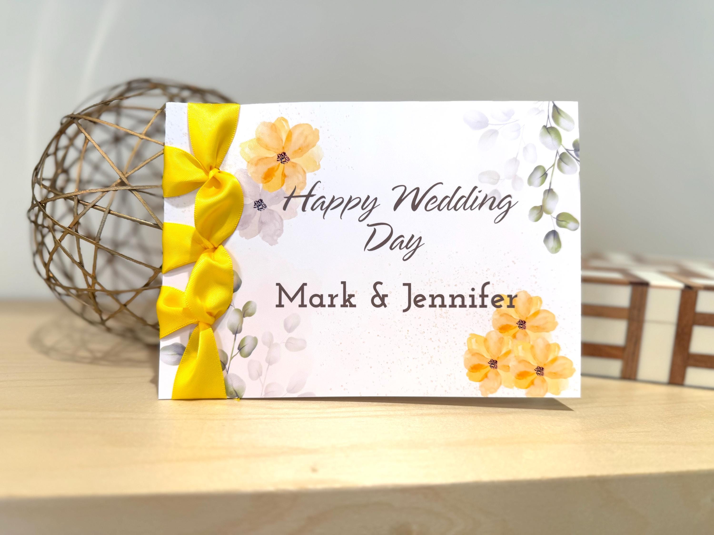 Celebrate love and new beginnings with this handmade luxury wedding card, adorned with a satin ribbon and personalized details — a timeless congratulations card perfect for the happy couple.