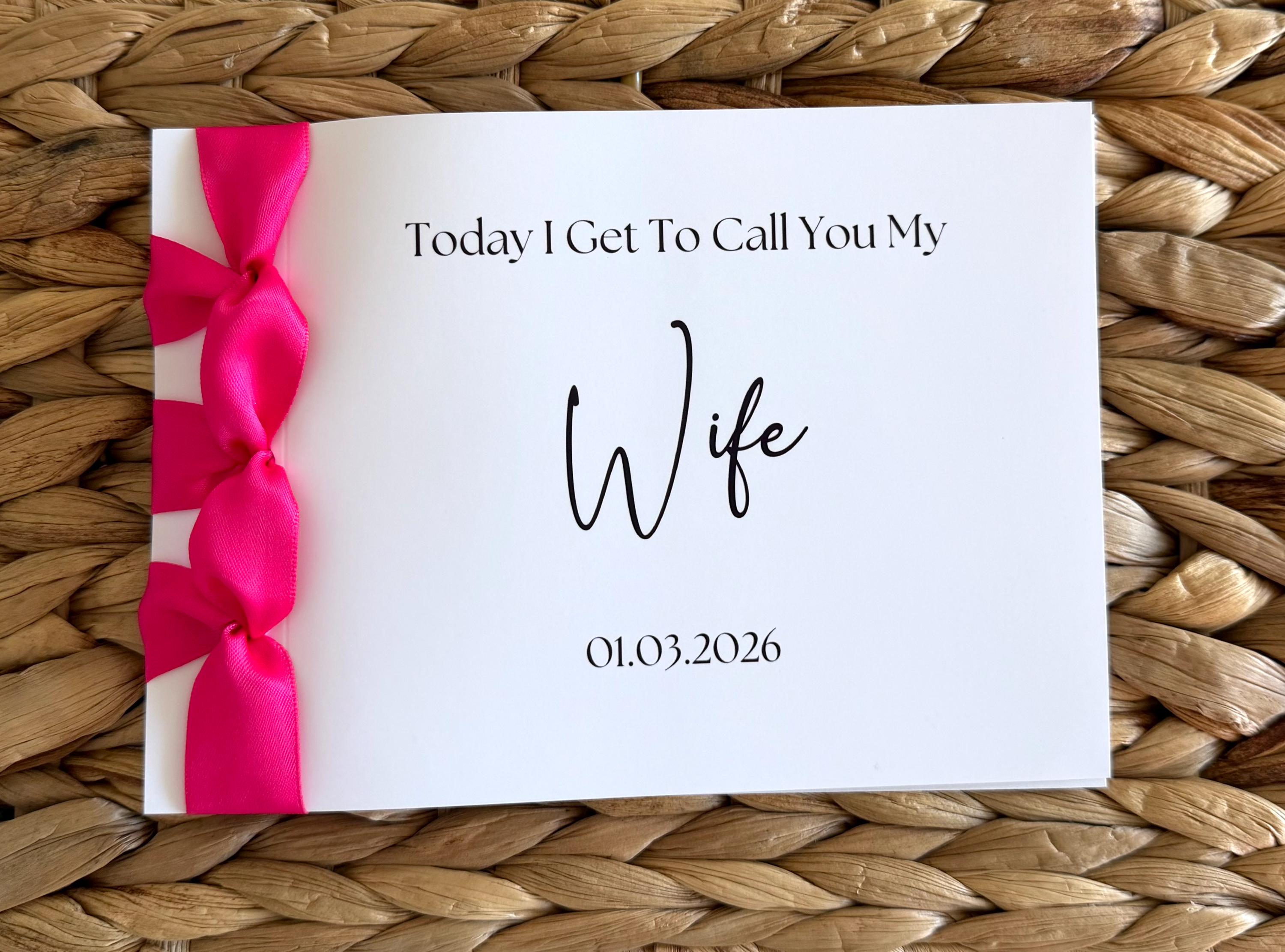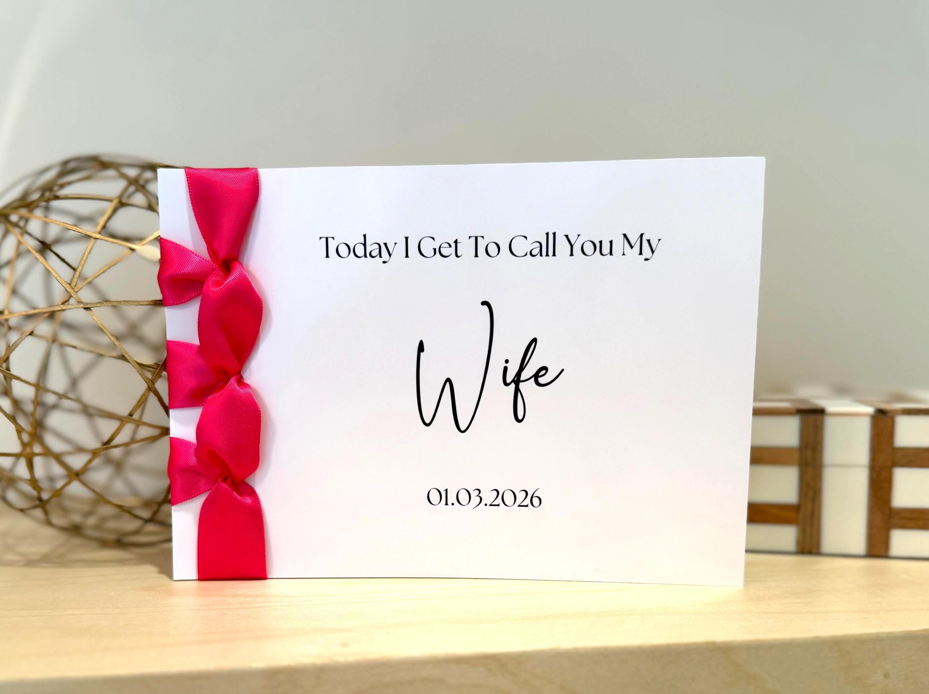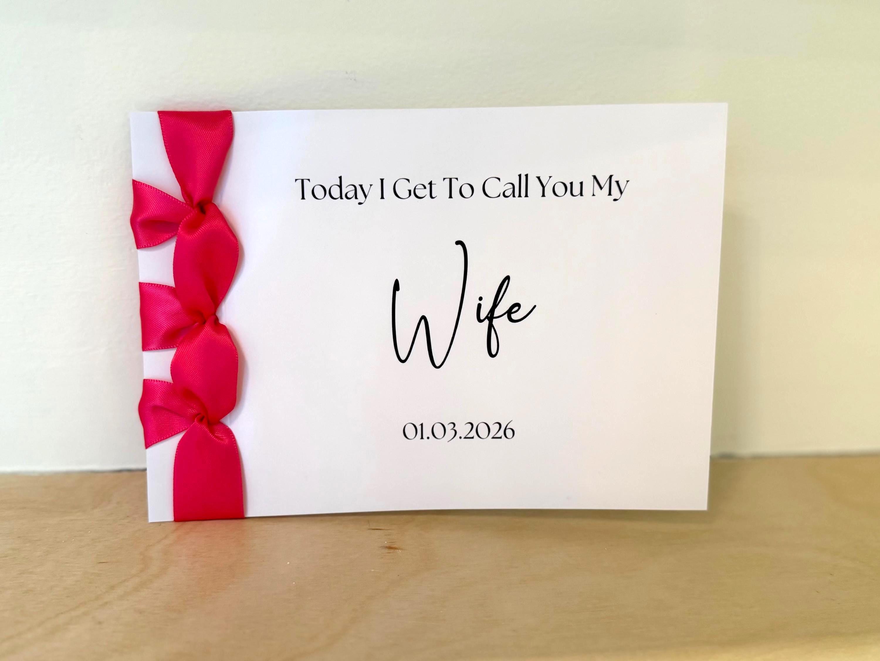 Celebrate your wedding day with this handmade luxury card, featuring the romantic message “Today I Get to Call You My Wife” — personalized with your details and finished with a satin ribbon for timeless elegance.