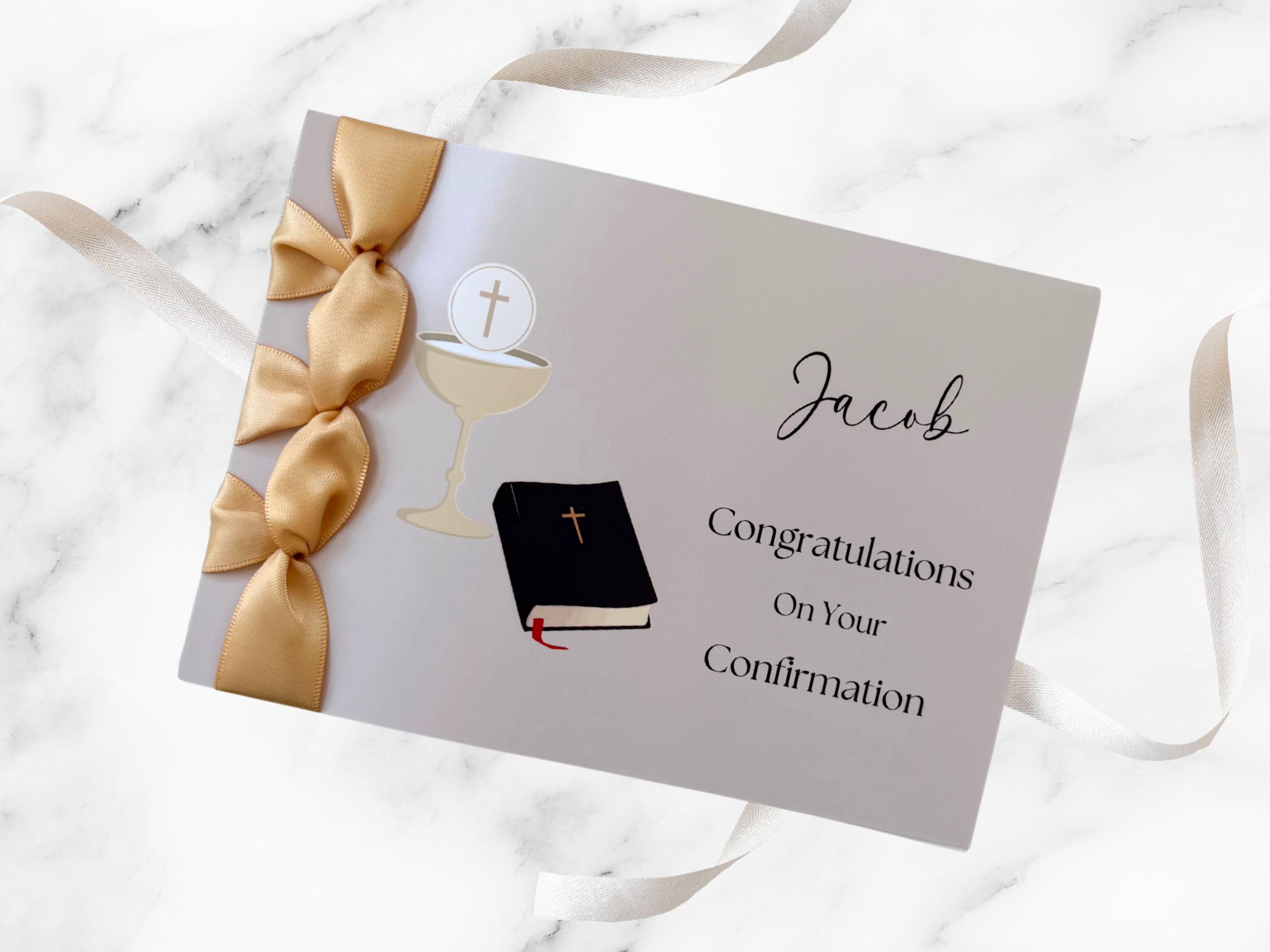 Celebrate his special day with this handmade luxury card, personalized with his name and date and finished with a satin ribbon — a meaningful keepsake for First Communion, Baptism, Christening, or Confirmation.