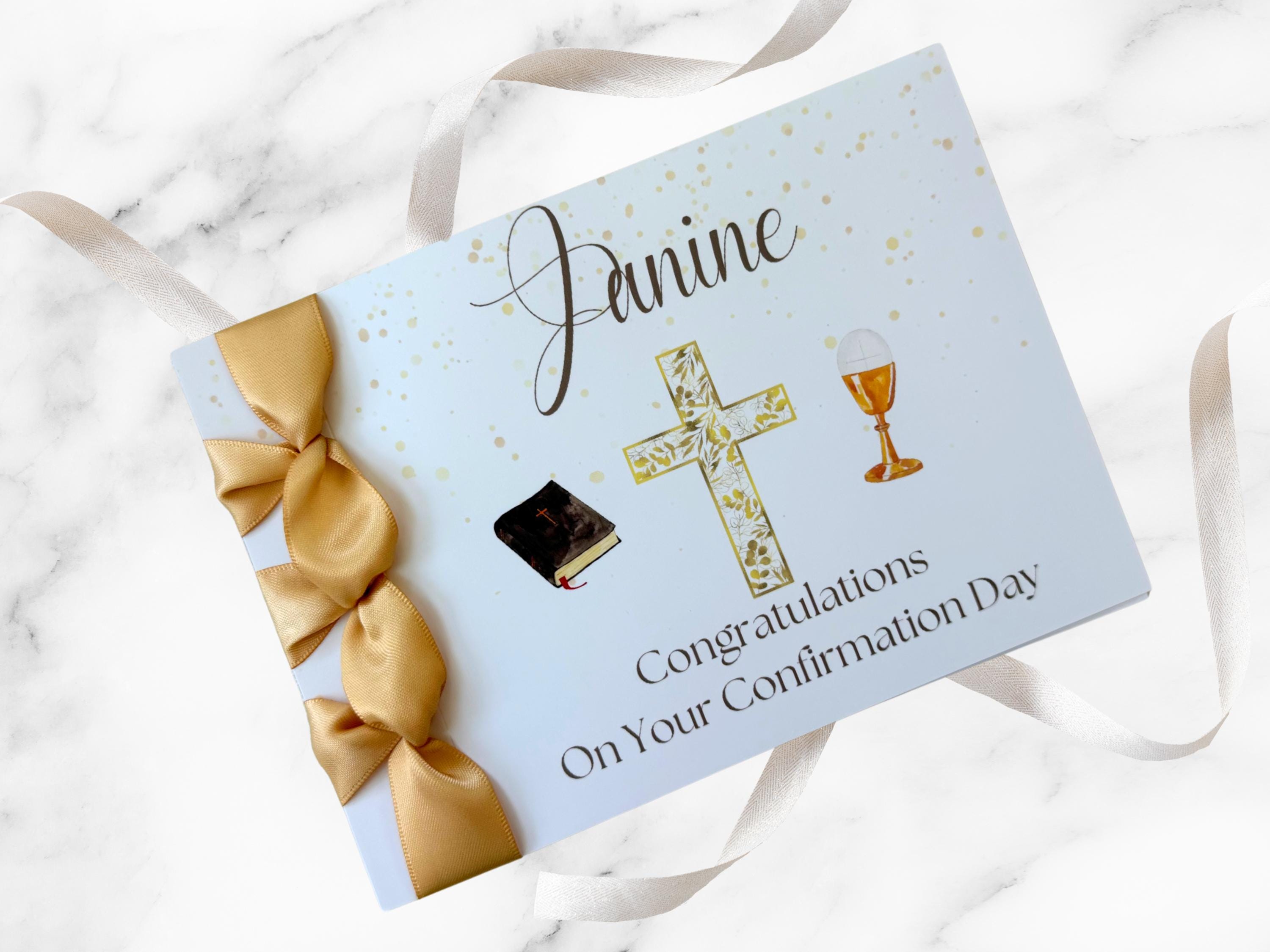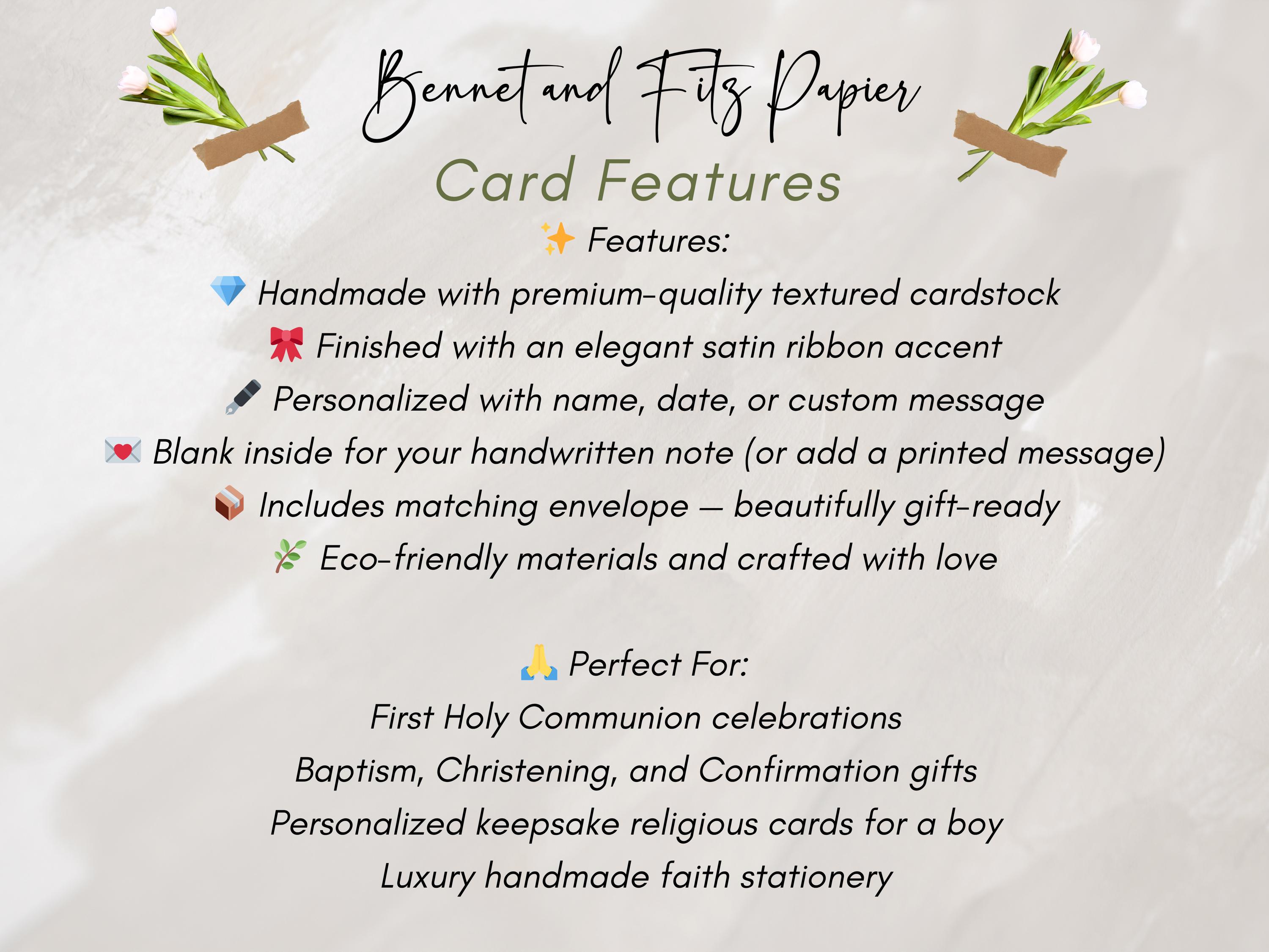 Celebrate his special day with this handmade luxury card, personalized with his name and date and finished with a satin ribbon — a meaningful keepsake for First Communion, Baptism, Christening, or Confirmation.