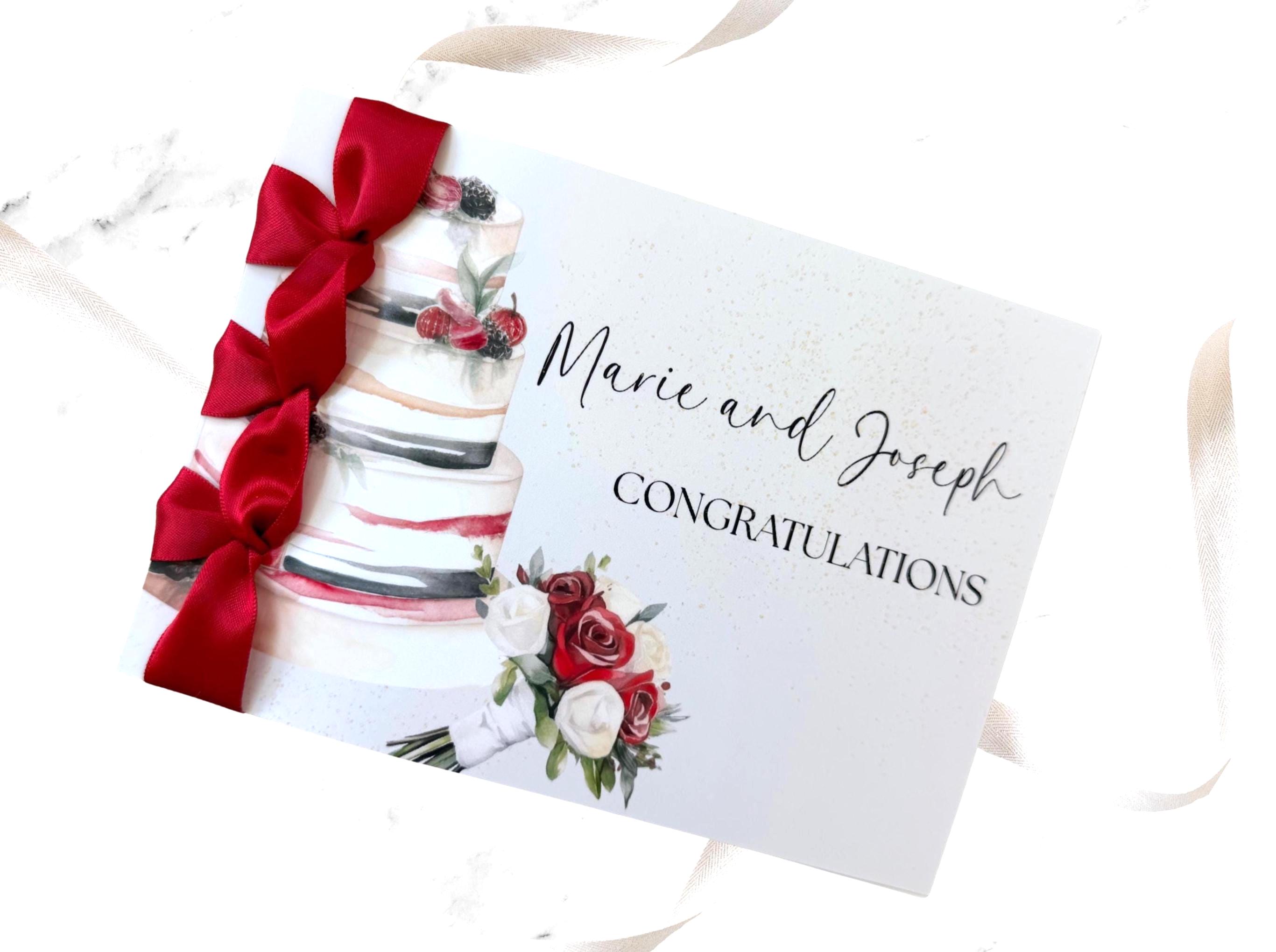 Celebrate love and new beginnings with this handmade luxury wedding card, adorned with a satin ribbon and personalized details — a timeless congratulations card perfect for the happy couple.