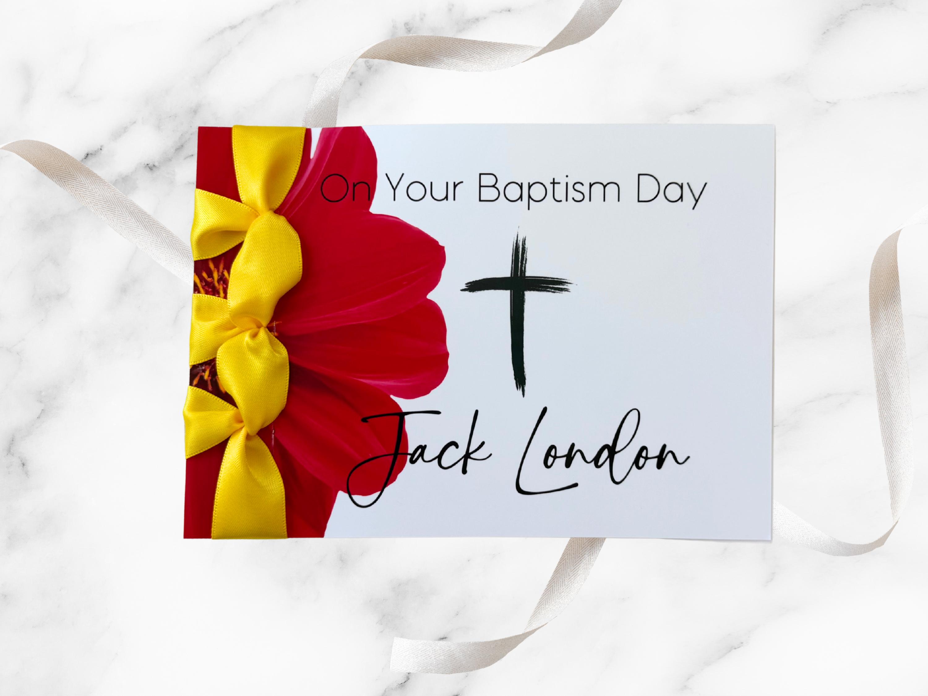 Celebrate his special day with this handmade luxury card, personalized with his name and date and finished with a satin ribbon — a meaningful keepsake for First Communion, Baptism, Christening, or Confirmation.