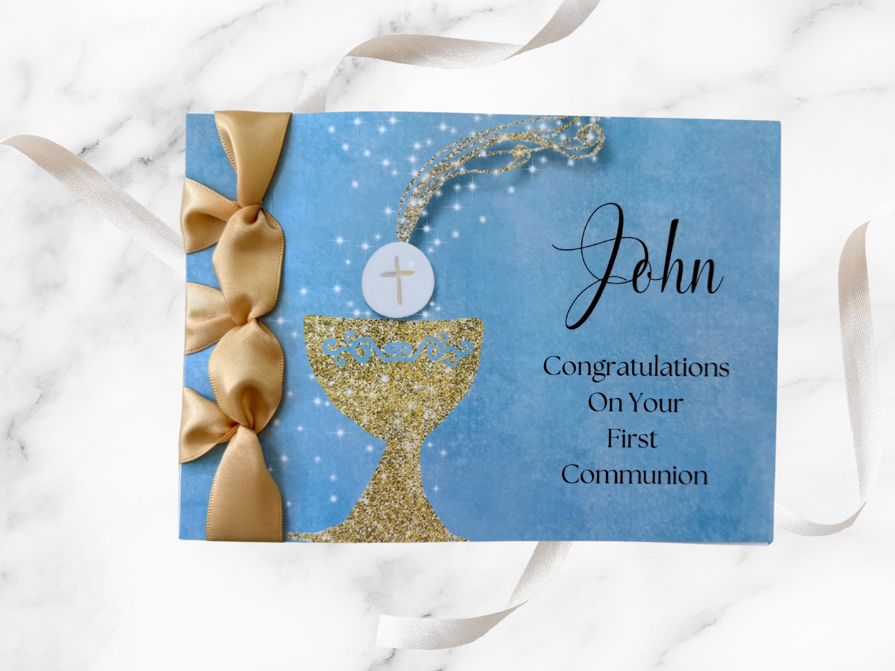 Celebrate his special day with this handmade luxury card, personalized with his name and date and finished with a satin ribbon — a meaningful keepsake for First Communion, Baptism, Christening, or Confirmation.