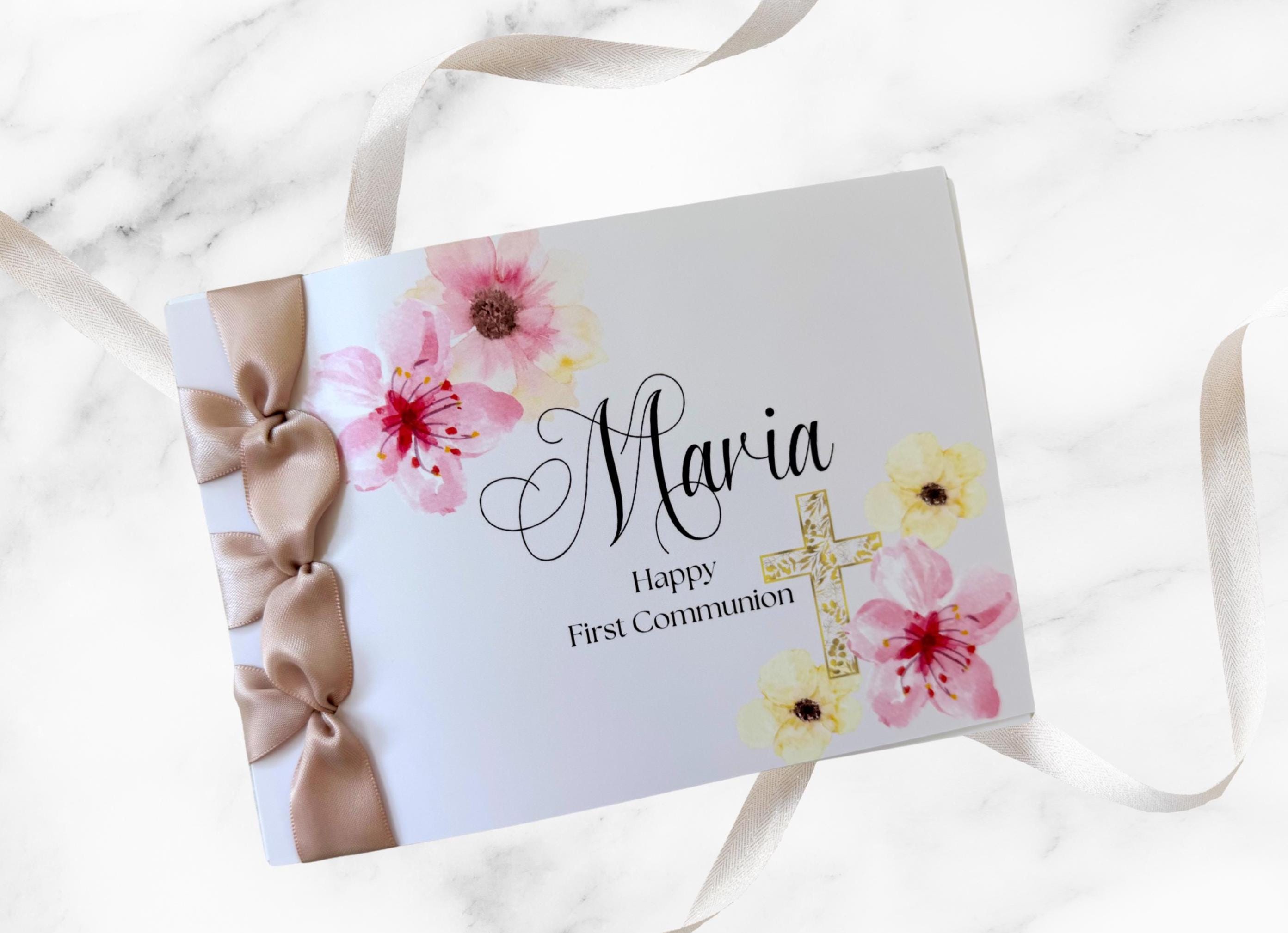 Personalized First Communion Card for Girl | Handmade Satin Ribbon Religious Card